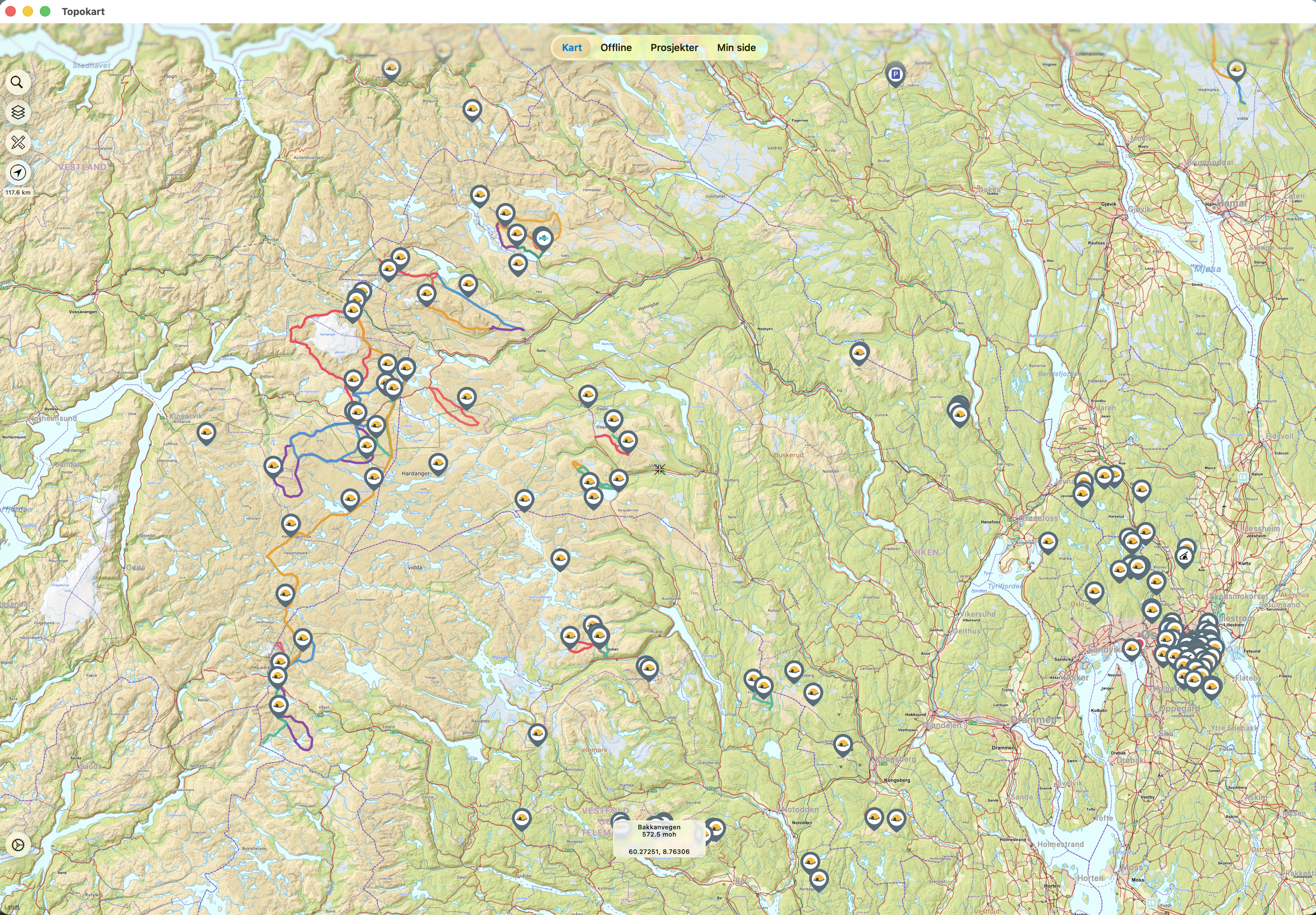 Storforbruker av Topokart selv, og har vært det en årrekke. Jeg vurderte en liten stund å bytte tilbake til Android-telefon, men det er umulig når en av de mest brukte appene mine "kun" er på iOS Nytt i nyeste versjon denne uken er at data nå synkroniseres via iCloud og ikke kun er lokalt på enheten. Helt nydelig, siden Topokart også kan installeres på Mac via App Store. Med appen på Mac får man muligheten til å ruteplanlegge på stooor og høyoppløst skjerm, og automatisk synkronisere alle prosjektene til telefonen og vice versa. Det er litt kronglete å navigere seg rundt i kartet på Mac enda, siden den egentlig er ment for iPad, men alt fungerer ellers. Skjermbilde fra Topokart på Mac: Både detalj og oversikt samtidig er noe man ofte savner fra papirkart Må bare gi mer honnør til utvikleren som på veldig kort tid fra jeg spurte om kartlag for satelittbilder over Svalbard nå også har implementert det i appen. -