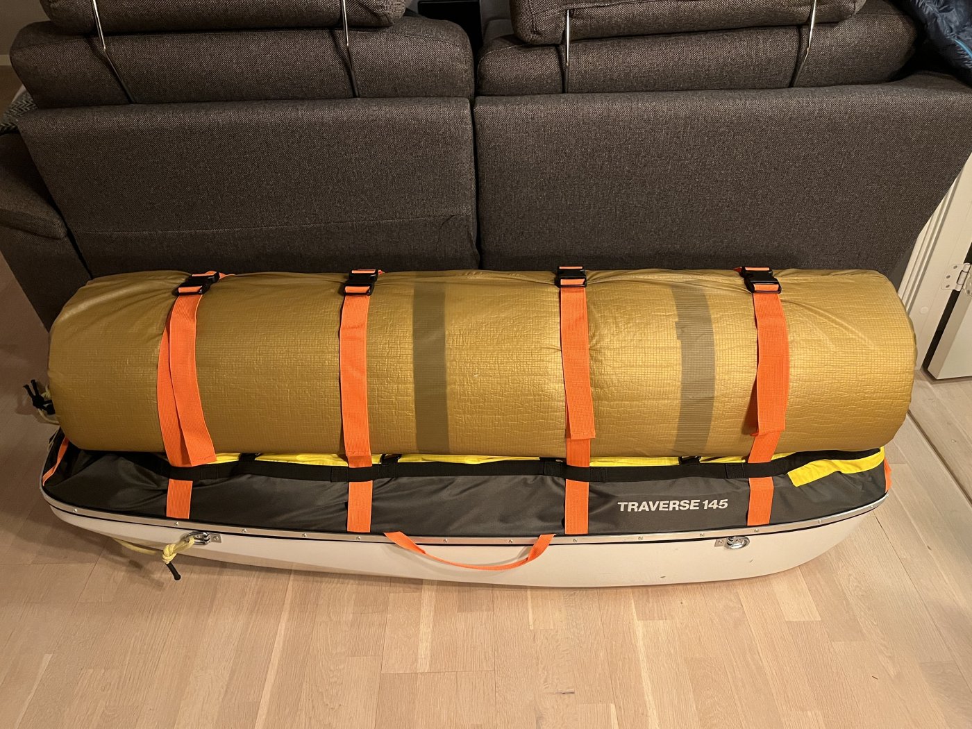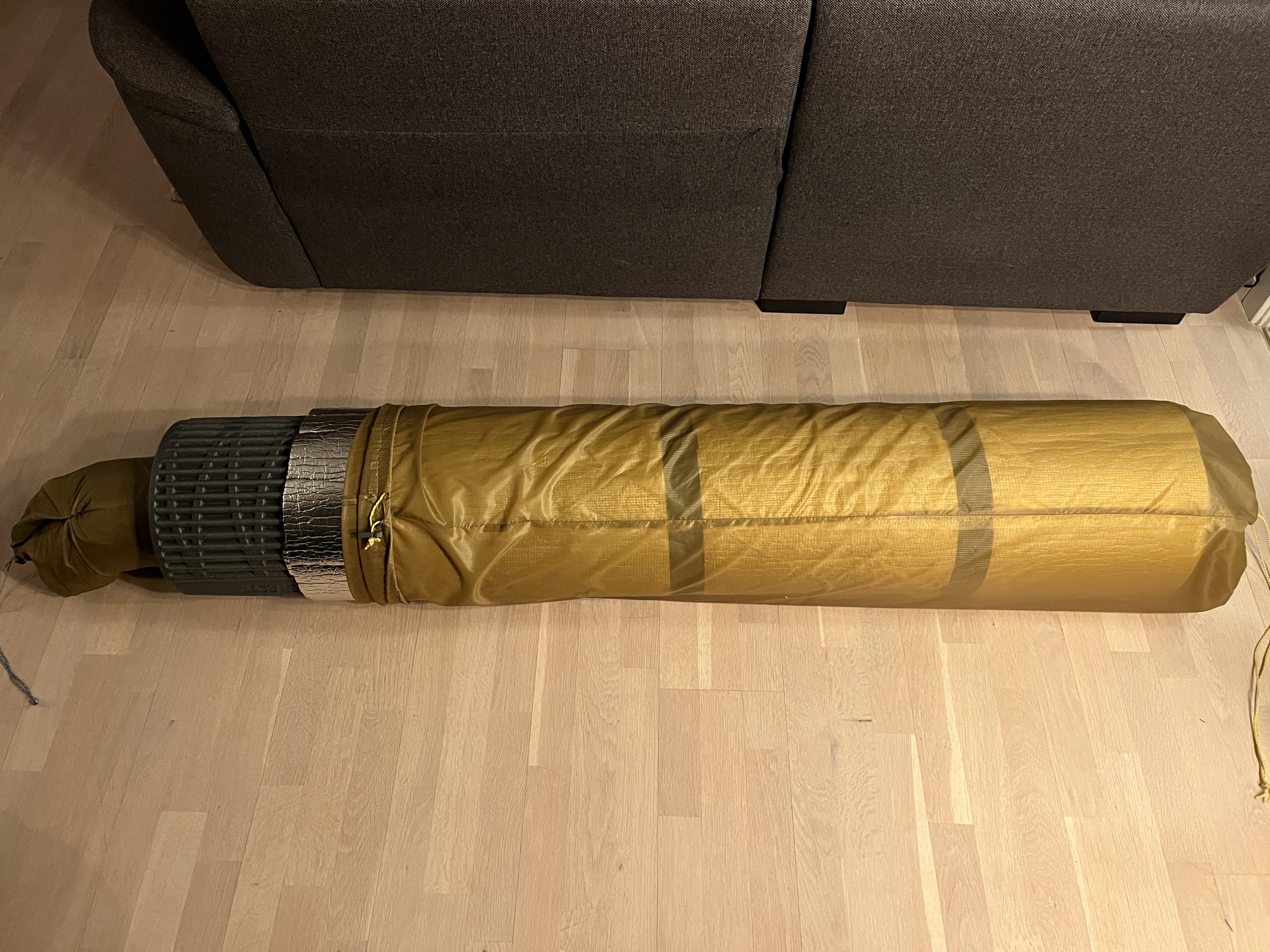 5. Trådtittel smått ment for å forvirre. Tråden handler ikke om pulkvelt eller når pulken ruller rundt i bratta, men et slags nytt pakkesystem på pulken jeg prøver ut for sesongen. Navnet "Pulkrull" valgte jeg for å kjøre like misvisende stil som "pulkpose" mange bruker for å omtale posen man ruller teltet i og har på pulken... "Pulkrull"-systemet er for de som foretrekker "harde" skumgummi/plast-liggeunderlag over de oppblåsbare. Den er også for de som aldri er blitt frelst av bedding på pulken. Dette er en slags oppskrift på systemet som jeg begynner å bli veldig fornøyd med. Deler her for erfaringsutveksling og eventuelt flere gode ideer til systemet. Kort oppsummering: Pulkrullen er en stor rull som festes på toppen av pulken bestående av sammenrullet telt med delte og tapede stenger, teltpose, 2x liggeunderlag-matter og et tilpasset trekk rundt hele rullen for å beskytte liggeunderlagene fra nedbør. Brutt ned i deler fra innerst til ytterst: Telt med tapede stenger og teltpose Dette blir litt subjektivt for typen telt, men begge mine tunneltelt, Keb Endurance 3 og Spitsbergen 3 X-Trem Camp har jeg delt i seksjoner så teltstengene passer innenfor pulkens lengde (viktig!) på ~150 cm, altså ikke to-delt, men minst 3 deler. To-delt vil i de fleste tilfeller fører til en urimelig mengde telt på utsiden av pulken som både subber og eksponerer teltet unødvendig for uhell. Øvrige stangledd er tapet så de sitter sammen. Kjent metode for de fleste... Rundt teltrullen har jeg en tilpasset teltpose som matcher ønsket lengde, og samtidig er ment for et relativt kompakt rullet telt. Siden jeg klarte å miste den råflotte DCF-teltposen jeg fikk sydd måtte jeg lage meg en ny og litt mer primtivt sydd pose i 40D SilNylon. Rent praktisk fungerer Silnylon faktisk litt bedre for dette systemet, siden materialet er en del glattere enn DCF, som gjør det enklere å dytte inn og dra ut teltposen fra hele rullen. Den nyeste posen ble faktisk også lettere enn DCF-posen, men det kan godt være fordi den er langt simplere. 64g! Liggeunderlag - 2x RidgeRest Large Motivasjonen for løsningen startet med at jeg ville kvitte meg med det oppblåsbare liggeunderlaget. Jeg synes det er mye mer behagelig og praktisk med "fast" underlag. De fleste skumgummi/skumplast liggeunderlag blir litt for smale for vinterbruk alene, men Therm-A-Rest sitt RidgeRest kommer faktisk i en Large-utgave som er 64 cm bred. Matten trekker ikke vann (som Bamse o.l.), og rillekonstruksjonen sørger for at fuktighet samler seg som dråper i bunn av rillene som soveposen ikke kommer borti. I kaldt vær kan dette lett ristes ut når det fryser til. Ganske optimal matte for vinterbruk med andre ord. Ikke uinspirert av blant annet Børge Ousland og Bengt Are Barstad som begge kjører samme matte. Total R-verdi på 4.2 (2.1 x 2). Jeg synes kanskje jeg aner noe svak kulde opp fra bakken med kun disse to. Bengt Are kjører kun to av de samme mattene hele vinteren, så det må jo være bra nok, men så har han også 5+ varmeovner (Huskyer) rundt seg i teltet. Mer om det i bonuspunkt. Det åpenbare minuset med to sånne matter er volum. Det er ikke snakk om å få dette inni pulken uten å kaste bort all plass til kun mattene. Å rulle to matter rundt hverandre blir også veldig stort og høyt. Her kom jeg frem til at den mest plass-effektive måten å pakke disse på må være som et rør rundt teltposen som jeg uansett vil ha oppå pulken lett tilgjengelig. Bonus: Teltgulv i varmereflekterende isoleringsfolie Kun som en bonus i løsningen som kun er prøvd på stuegulvet i kombinasjon med denne løsningen inntil videre, men som blir med på noen testturer fremover. Jeg har tidligere skrevet om en rimelig og enkel DIY teltgulv-løsning her: https://www.fjellforum.no/topic/61787-dyi-teltgulv-av-varmereflekterende-isoleringsfolie-fra-clasern/ Denne teltgulv-rullen er ikke blitt brukt så mye fordi det ble litt upraktisk å pakke den med oppsettet jeg kjørte på pulken tidligere. Rullen er semi-stiv, så den ruller seg ikke så tight sammen om man bare lar den ligge i teltet ved nedpakking heller. Men med dette nye pulkrull-systemet har det sin plass og det knapt uten å legge til noe merkbart volum på pakkingen. Jeg tilpasset bredden på gulvet til å passe rullen på ~145-150 cm, så den vil ikke dekke hele innertelt-gulvet, men store nok deler til at det blir lunere. Gulvet er også blitt noe kortere fra første iterasjon etter å ha blitt delvis ofret til andre DIY-prosjekter tidligere Gulvet veier nå 410g. Ref. R-verdi og kulde opp fra bakken nevnt lenger opp tror jeg at med dette delvis dekkende teltgulvet i tillegg til liggeunderlagene vil den totale isolasjonen bikke over "nok", der det med 2x RidgeRest kanskje akkurat ikke er optimalt. Faktisk ble det enklere å rulle sammen og pakke RidgeRest-mattene med teltgulvet i én vending, istedenfor å måtte rulle og legge hver matte i trekket for seg selv som jeg har gjort på turer så langt. Pulkrull-trekk Med liggeunderlag rullet rundt teltposen som et rør eksponerer man liggeunderlagene for snø og ev. regn. Spesielt med RidgeRest-mattene kan det bli litt plagsomt med snø i rillene som avhengig av temperaturen kjapt kan smelte om til vann som kan gjøre klær og sovepose våte. Dette formildes litt med teltgulv-bonusen nevnt over som dekker over mattene, og samtidig er enklere å holde "ren", men det beskytter likevel ikke mattene nok ved mye snøføyke. Løsningen på dette ble å sy et større trekk til hele rullen. Her brukte jeg også 40D SilNylon og veldig enkel snørelukking i begge ender. Hvorfor begge ender? Mest fordi det ble en enklere syjobb, men det har vist seg å være en lur løsning, for der jeg i fronten tar inn og ut teltposen kan jeg i bakdelen stappe en dunshorts, dunvest e.l. som jeg ønsker å ha lett tilgjengelig, men samtidig beskyttet fra elementene. Trekket gjør også at hele rullen blir én del istedenfor flere potensielt løse 