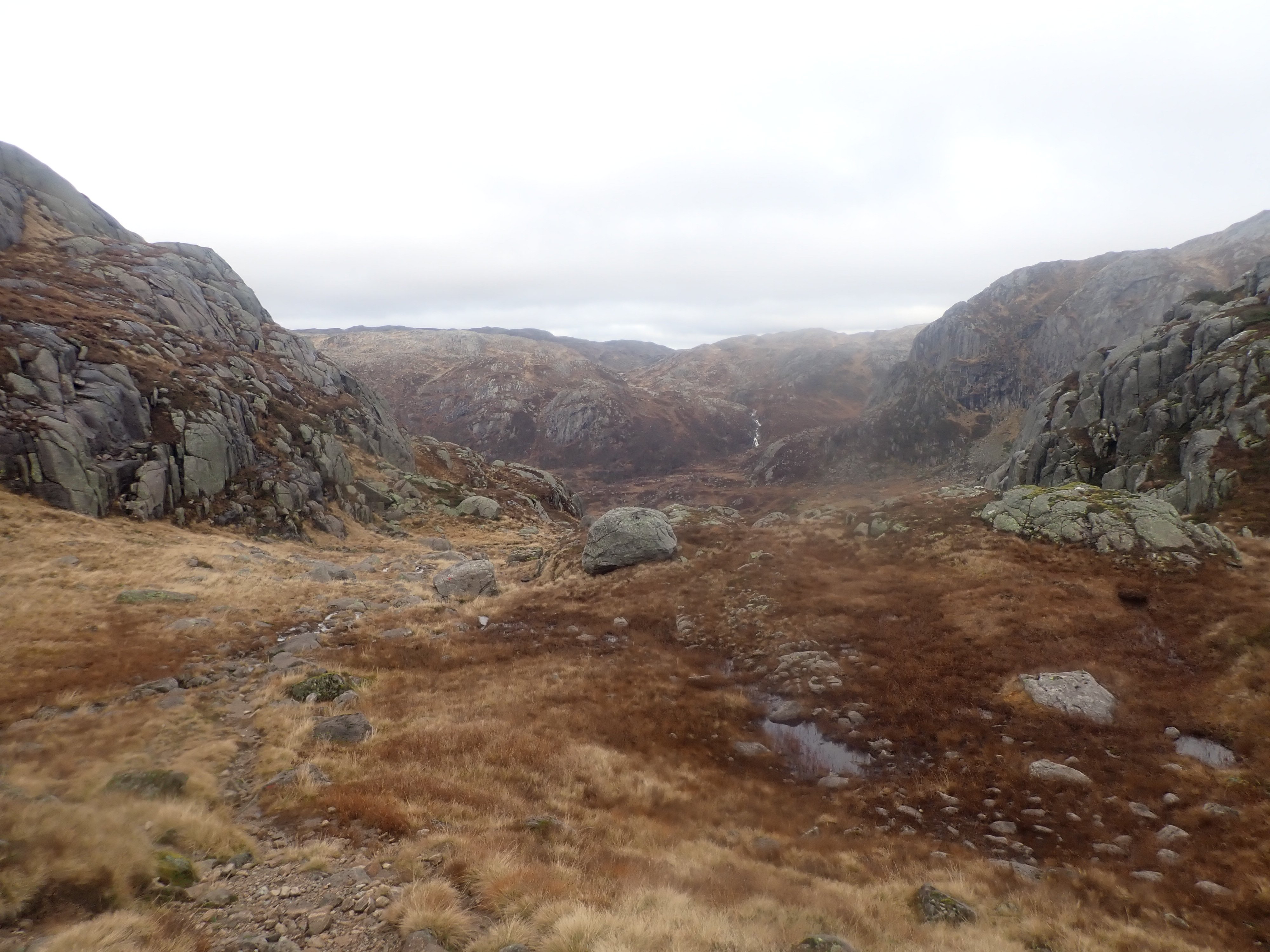 2. Det kan muligens bli en av de siste gangene jeg er på Blåfjellenden dette året. Med en sjekk på værmeldingen var det heller ikke lett å finne to dager med så pass vær at det ville være greit å gå innover – og tilbake. Torsdag til fredag så ut til å være en mulighet. Det skulle være opphold og litt sol på torsdagen. Vinden ville ta seg opp ut over dagen, så det kunne passe å starte tidlig hjemmefra. Fredag ville være – nesten – opphold fra tolv av, og det kunne passe å gå tilbake, Spesielt siden det var meldt om «medvind» hjemover. «Storm» var stor sett enig med Yr, men de meldte om virkelig sterk vind på torsdag kveld og natt til fredag. Det passet bra, å «glemme» at Storm normalt er noe mer forsiktig når det gjelder å varsle vind. Forrige gang jeg gikk innover, glemte jeg brød i bilen. Denne gang sjekket jeg nøye hva jeg la i sekken, og hva jeg skulle kjøpe før jeg dro oppover. Likevel var jeg ikke helt sikker på om jeg hadde fått med meg alt. På parkeringsplassen ei Hunnedalen fant jeg fort ut at staven lå hjemme. Bilen hadde vært på verksted i uka, og jeg hadde ryddet ut av bagasjerommet. Stavene hadde havnet i boden, og jeg glemte å ta med disse. Det ble en tur uten stav innover. Selv om jeg gikk forsiktig, og det gikk ganske greit, ble det til at jeg tråkket feil da jeg var nesten nede ved hytta. Det sa «spong» i foten. Akillesen hadde det ikke bra en stund. Det gjorde vondt. Det er som regel rett før slutten på turen at det skjer ting... Innover møtte jeg også Olav med en sau som også hadde problemer med et av beina. De var kommet til Saftbekken, og hadde brukt lang tid. Fortsatt hadde de halve turen igjen før sauen kunne plasseres i garen. Det er mye arbeid for en enslig sau, ikke verdt det i kroner og øre, men Olav var opptatt av å få alle dyra ned fra heia. Selv om det tok tid, så var det slik tingene skulle gjøres. Nok en gang var det ting som så avgjort burde gjøres der og da, inne på hytta. Et vindu på annekset sto oppe. Det var like kaldt inne som ute, og jeg var opptatt med å få fyr i ovnen, og kunne ikke helt forstå hva som sto og slo. Hvorfor var det greit å få lukket dette vinduet? I løpet av kvelden blåste det opp. Storm mente det kunne bli vindkast opp i 30 m/sek. Noe som tilsvarer sterk storm. Jeg måtte ut et ærend før jeg la meg, da blåste det så pass at jeg hadde store problemer med å holde meg på beina. Det ble en urolig natt. Vinden tok virkelig tak i hytta så den ristet. Det blåste antakelig enda mer litt ut på natta, og jeg mener vindkastene må ha vært på mer en 32 m/sek som er orkanstyrke. Hadde vinduet fått stått å slå, så hadde det antakelig blitt knust. Heldigvis slapp jeg å tenke på å ordne et ødelagt vindu nå rett før vinteren. Klokka 12 på dagen, hadde det roet seg, og det var opphold. Helt etter værmeldingen til både YR og Storm. Jeg kledde meg likevel for regn, noe som viste seg å være helt unødvendig. Det ble en tørr tur over heia. Det var bedre vær enn meldt, selv om jeg fikk vinden i mot og ikke bakfra. Med en bakfot i uorden, gikk det ikke fort over heia denne dagen. Jeg brukte lengre tid enn normalt, og stoppet litt opp av og til. Denne dagen traff jeg ikke folk før helt nede på parkeringsplassen. Der var det fire karer som gjorde seg klar for en tur inn til Blåfjellenden.