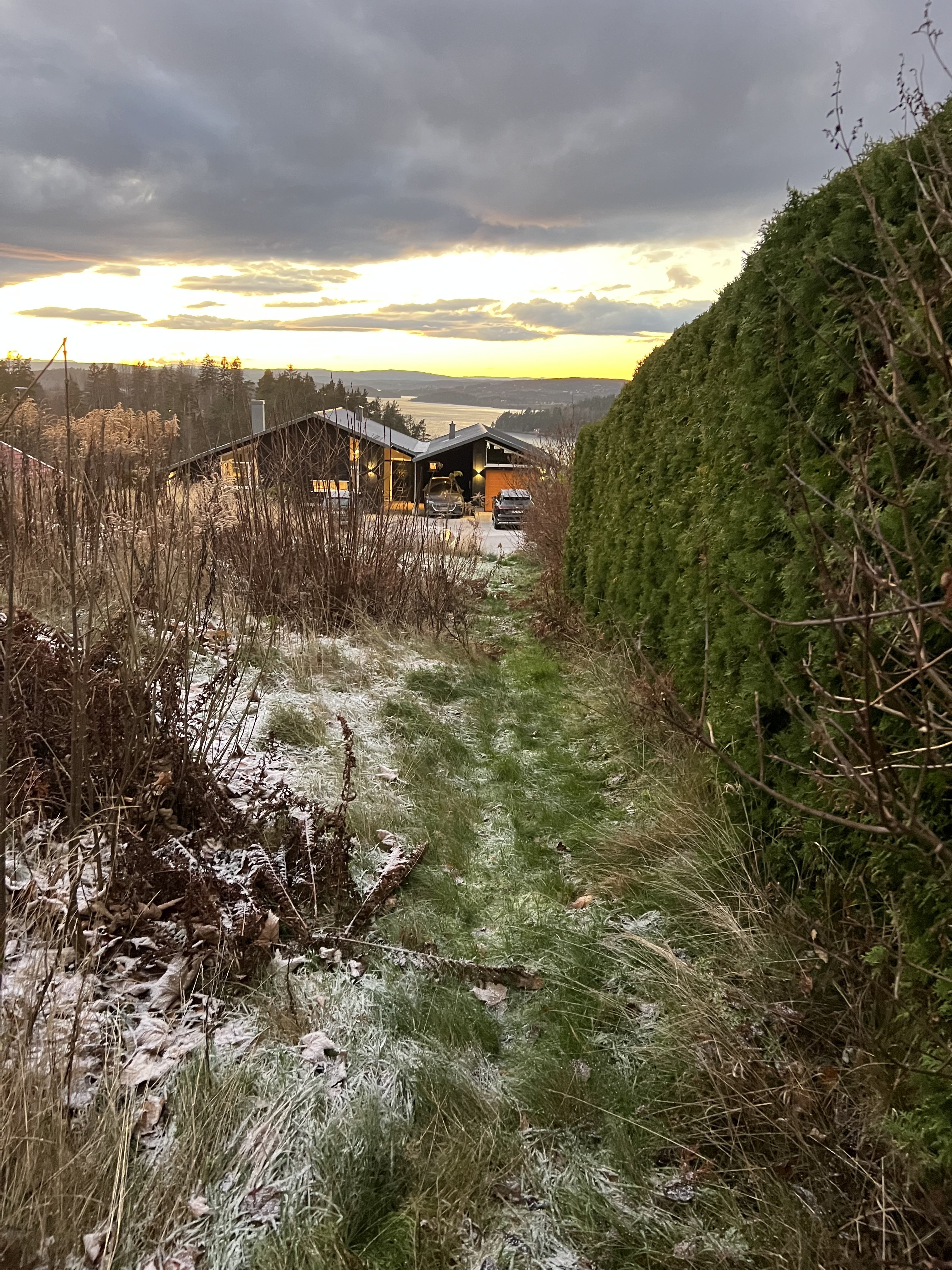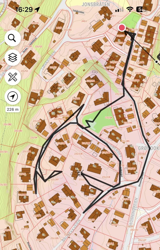 Hjem fra sydens varme, til kuldegrader. Har et prosjekt med å finne lokale smug/gangveier/nye stier i kommunen. I reguleringsplanen for mange områder mangler det dessverre naturlig stier. Det kom ei hagleskur. Det ble sporsnø. Nok til at første bilen i nabolaget kjørte ut! Fant en vei, men denne var stengt med et gjerde. Det hjelper å ha eiendomsgrenser som kartlag. Men ikke noe funn i dag, ofte er skolebarn veldig flinke til å finne raskeste/korteste veien. NB: Gikk bare på offentlig vei/fellesområder.