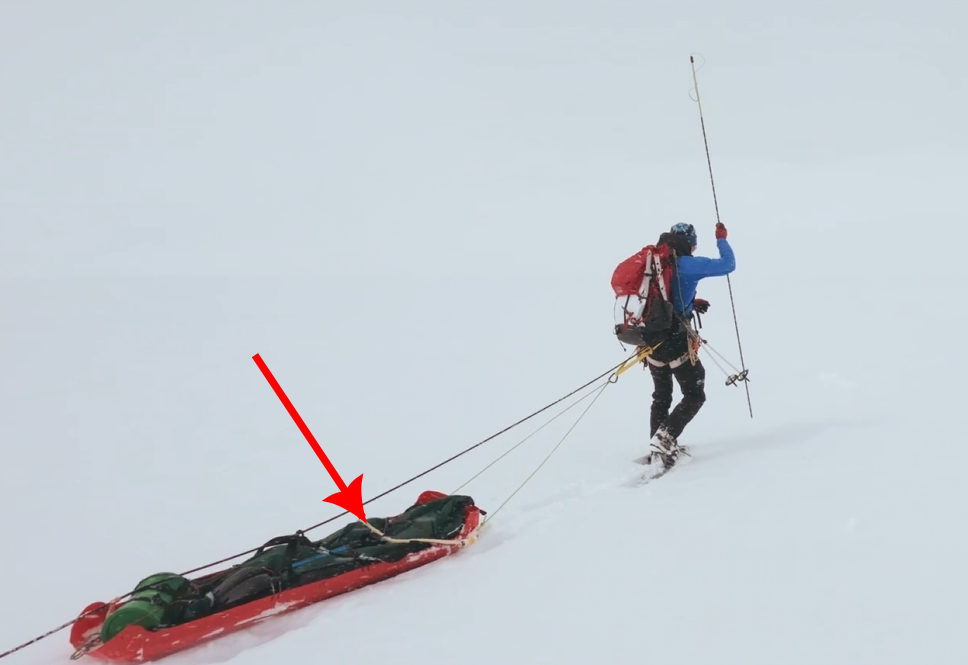 De har et tau (gult) som brukes som brems, muligens med noen knuter på. På bildet under ser du han ene guiden sin brems liggende oppå pulken: Under ser du Anne med pulken, hvor bremsen er lagt under pulken. Det vil selvfølgelig gi mere motstand og sårligere gli. Så det er vel en ettermontert brems, ja, og en ganske enkel en som sådan Vet at det er andre – sikkert her på forumet – som har noe lignende for pulkbruk i bratte nedoverbakker. -