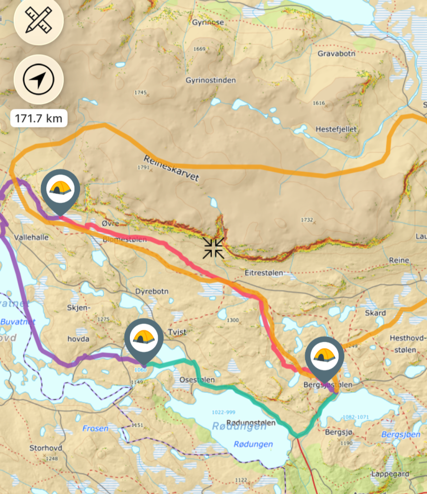 8. Det ble langhelg på meg forrige helg, og sesongens første fjellskitur med destinasjon Reineskarvet og omegn En tur med veldig mye forskjellige på agendaen. Nytt utstyr og systemer som prøves, pakking, spising og brennerbruk-rutiner som om det var langtur ala ca. en måned (med unntak av noe mindre mat). Selfølgelig, som med de fleste skiturer tidlig i sesongen får man seg en real virkelighetsorientering når det kommer til ambisjoner om tilbakelagt distanse og type terreng man vil ferdes i. Planen var egentlig å gå fra Bergsjøstølen, vestover langs Reineskarvet for så å gå opp på skarvet, langs toppen og ned på nord-østlige side. Det tok ikke mange minuttene med ski på bakken før jeg fant ut at den ambisjonen er bare å droppe med en gang. Det var en litt hard overflate på snøen, men rett under der, løst med mye undervegetasjon som gjorde at omtrent hvert skisteg falt igjennom. Selv de minste bakker blir en real utfordring med tung pulk hengende etter seg da. Litt høyere opp der det ikke var så mye kratt under snøen var det litt bedre, men også veldig tynt med snø. Planen ble uansett lagt til en runde som gikk ned på vannene og tilbake til Bergsjøstølen. Oransje rute var ambisjonen. Rød, lilla og grønn ble realiteten På lørdagen fikk jeg noen meget pene utsiker mot Hallingskarvet i gyllen morgensol Mitt nye "pulkrull"-system (Stort trekk rundt 2x RidgeRest liggende som et rør, med teltpose inne i "røret") in action: Natt til lørdag falt det ganske bra mengder snø som gjorde forholdene noe bedre, men natt til søndag igjen regnet det som bare det, og mye av den gode snøen forsvant igjen. Da ble det enklest å gå langs hytteveiene tilbake til bilen. Med sol som varmet skikkelig på søndag formiddag begynte jeg å få det litt travelt, for veien opp til Bergsjøstølen ble fort speilblank i de forholdene. Det var bare å komme seg ned før man eventuelt skulle havne i grøfta på vei ut Stakkars Falketind 62 Xplore-skiene fikk seg også noen ufortjente riper i møte med stein under tynt lag med snø enkelte steder... Og for første gang (!) hadde jeg reelle problemer med å løsne Xplore-skiene fra skoene. Jeg tror den veldig våte snøen jeg gikk i på lørdagen fylte alle kriker og kroker med slush som ble til is. Jeg måtte virkelig jobbe og helle vann mellom sko og binding for å få de av.