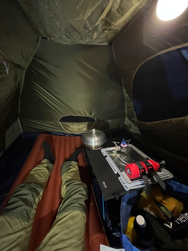 Regnværshelg i søre Trysils skoger. Tanken var å droppe helgens tur, men så passet det seg ganske godt opp mot alternativet om å bli hjemme. Med så mye regn på menyen som det var tok jeg et ekstra stort telt for komfortens skyld (Abisko Dome 3). Fint med plass til Helinox-bordet for å lage en ordentlig "kjøkkenkrok"! Det ble noen økter her og der i skogen, litt på måfå i søken etter skogsfuglen. Det eneste jeg fant var en stor båt omgjort til gapahuk, langt unna større mengder vann! Lurer på hvem som har slept den inn dit.