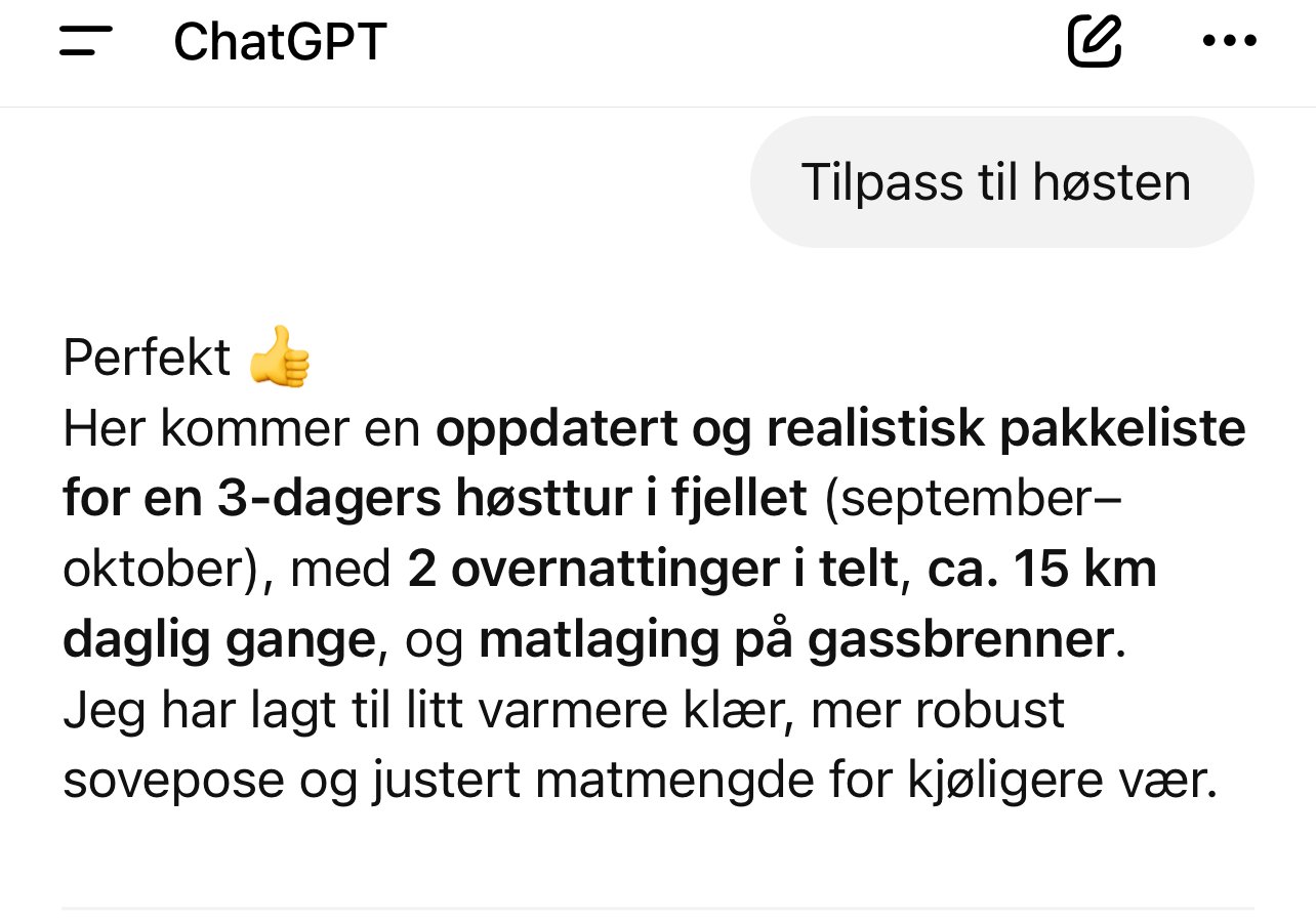 Jeg «går turen» i hode, og tenker gjennom hva jeg trenger. Men noen ting er nesten ferdig pakket. Har dog greid å glemme teltplugger heldigvis på en mc- 3 ukers tur. Ble å gå i resepsjon og låne div gjenglemte plugger, kjøpte ei pakke store Torx-skruer som ble brukt resten av turen. Ei pakkliste kan jo være lurt, men bør også innholde: Passer og virker gassboksen med valgte brenner. Er powerbanken oppladet Funker hodelykt og er ladet Har du med rett sett med teltstenger Passer ski og skisko sammen! Er Inreach ladet og aktivert for turen. Funker evnt vannfilter Er kniven skarp Men jeg skal teste det og gi litt innspill. @Ivan Lé Hjelmeland fikk jo masse input på Topokart appen sin, og den er ekstremt god.