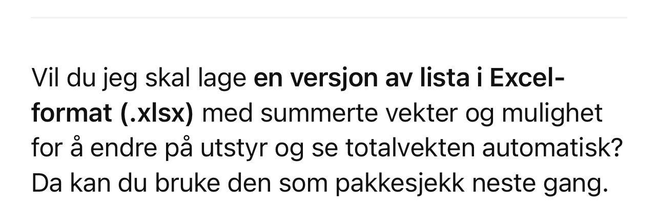 Jeg tenker nok motsatt 🙈, prøver å ta med minst mulig, og som regel er det slik at om pakkevolum er lite, så er vekta ok. @haakon86 - du må ta med volum, og om volumet er «fast eller formbart» Så putter jeg i sekken det jeg trenger for turen, og veier den av og til. Bruker nok mer tid på å tenke ut hvordan jeg skal ha resupply punkter på lengre turer. Men har tidligere veid mye, men med litt erfaring blir vekta ok. På dagsturer putter jeg gjerne litt ekstra i sekken, så jeg får omtrent det jeg har på en flerdagstur, litt for å styrke helsa. Støtter @sneakyowl ang at det ser ut som en betalt tjeneste! Men apper som kan hjelpe andre er flott 🤩, Burde vært en eget varsel- trenger du virkelig denne😂. Lettest du har i sekken er det som blir igjen hjemme.