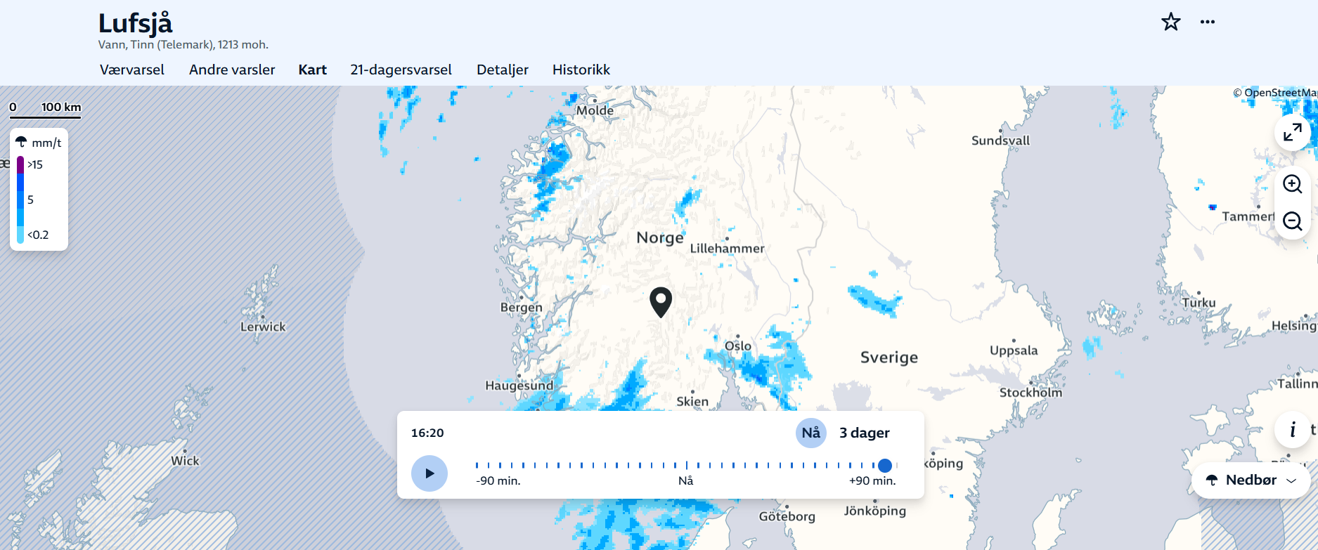 6. Wow! Dette var storveis....kart funksjonen hos Yr har nå utvidet "vær-radar" fra halvannen time til tre døgn. For min del er nedbør greit å ha kål på, så selv om varselet er grøvere pixel-messig, så vil jeg tro det blir til stor hjelp fremover. Under 3 dagers varsel...; ...kontra 90 minutter; Blir vått, ja!!!