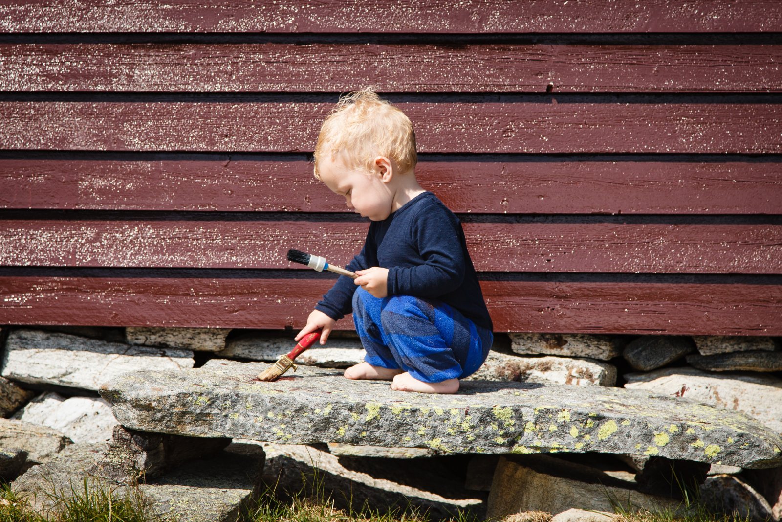 Selve oppholdet gikk faktisk lekende lett. Leander (11) forlangte å få male utedoen på egenhånd, mens storebror Sebastian (14) tok flere av hytteveggene helt alene. Arn (1,5) malte seg selv. Barnepass nær maleutstyret var en fulltidsjobb. Etter en sikkerhetsopplæring med øksa så ble det plutselig produsert ett årsforbruk med opptenningsved i vedboden. At vi hadde mer enn nok brydde ikke guttene seg noe om. Hugging var moro!