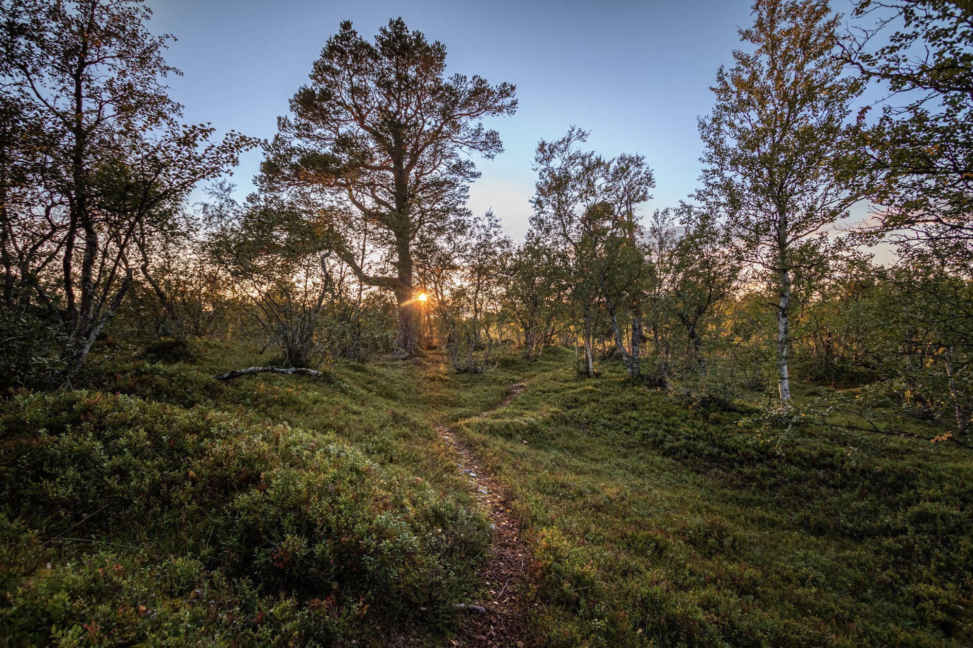 Sekken er blitt forsynt av ned til idealvekt og vandringen går nå som en lek. Med lette sprett bortover myrkanten ser vi frem til å komme opp på fjellet. Det stadig skiftende terrenget med tykk furuskog, myrlandskap, mangroveskog med tett bjørkeskog og et teppe av bregner langs bekkene og steinete flater er noe som gjør det artig å ferdes her oppe. Vi går stadig inn i nye biotoper og fryder oss over kontrastene sammen med det skiftende været.
