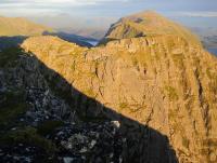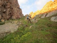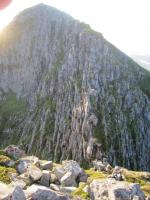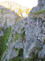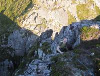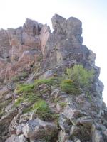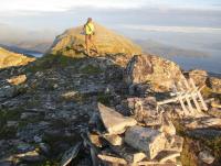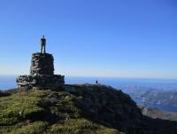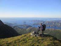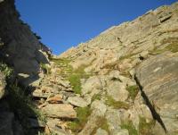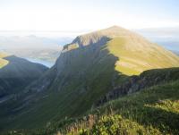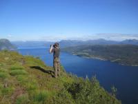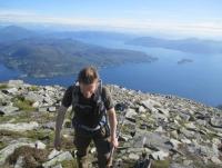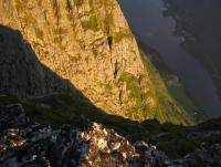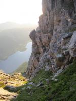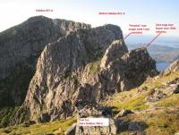 Siden været var flott, og dagen fortsatt ung, foreslo jeg en skikkelig ekspedisjon for Chris, som straks syntes forslaget var bra. Da vi fem timer seinere plundret oss ned den store renna fra toppen, er jeg ikke sikker på om han var like enig… Vi satte igjen en bil ved gården Stabben, ved Sålåsundet, (vest for Stabben 827 m)med tanke på returen på kvelden. Nedenfra så renna fra toppen ut til å være grei skuring helt ned igjen – med mulighet for å søke inn på den skogkledte bratte ryggen dersom uforutsette problemer. Så fortsatte vi med bilen min, helt ned til gården Innerberg i sør, og forbi denne. Nå ble veien langt dårligere og smalere, og jammen møtte vi en elektriker i bilen sin her. Passeringen gikk på utrolig vis, og Chris ropte begeistret og høyt av glede for at det var jeg – og ikke han – som satt bak rattet. Jeg satte opp et telt ved veien her, før vi ruslet videre til stolpe nr 29. Her begynte stien, og her sto en bil parkert på p-lomma også. Flere folk oppi her? Utydelig og gjengrodd sti opp i sør Stien var svært bratt, og ganske så gjengrodd av einer og kratt. Men vi søkte som sporhunder, for å miste stien opp i dette terrenget, ville være håpløst tungt. En formidabel mengde fluer holdt meg med selskap underveis, og stadig nye venner og slekter småkryp sluttet seg til supporterne. Stien endte i et flott utsiktspunkt, der vi knipset litt, før vi gikk videre, nå mot NV. Vi møtte en far og sønn som mente å ha glemt kartet på toppen, men det så vi aldri noe til. Vi fulgte etter hvert en del stein, tidvis løst, men rimelig greit opp til SV-egga på 800 moh. Her tok vi en liten pause, før den lettere delen opp til topps. Innerbergsalen (908m) kalles også Stabben, men da forveksles det lett med den lavere nordtoppen på fjellmassivet her. Kjempevarde her oppe, og en ørliten notisblokk som ikke sto i forhold til varden i alle fall. Videre nordover ryggen Fluer og kryp hadde forlatt oss nå, og den lette morsomme biten gjenstod: Ryggen nordover! Herlig utsikt til begge sider i kveldssola, vindstille og lettgått grassterreng! Vi var snart over Nonsknubben (796m) og Søre Stabben (798m). Men nå var vi spente, for veien videre så meget spennende ut: Tre små forrevne spisse topper måtte forseres, før den bratte hammeren opp til den nordligste og høyeste toppen, som måtte være Stabben (827m.) Klyvinga ned i det første skaret var grei, og vi satte igjen stavene og sekkene her. Klokka var alt 20, og jeg var litt spent på tida. Det var tross alt langt ned til fjorden igjen, om det da gikk an å ta seg ned dit den veien vi tenkte. Godt å vite at jeg hadde hodelykt i sekken, i alle fall. Vi så ned renna som førte mot fjorden, og det så rimelig greit ut så langt vi kunne bedømme det – og det hadde det også gjort nedenfra også. Tøff klyving Nå skulle vi opp på den første av de tre små toppene. Et tråkk var tydelig her, men jammen ble det ganske så utsatt og luftig. Jeg merket av på gps-en, for her må en gul trekant settes. Et blått nylontau var lagt ut, men vi kløv opp uten å bruke dette. Ikke før var vi oppe, før tråkket gikk nedover igjen, og stoppet i en bratt hammer. Hva nå? Jeg var innstilt på å snu, for jeg var redd for at tida gikk i fra oss, men Chris nektet å gi seg her, og kløv ned et sva til venstre for hammeren. Det viste seg å være ganske lett, så jeg fulgte på. Joda, maks 2- her, og ikke så veldig utsatt i grunnen. Vi døpte svaet Chris’ sva, og var nede i neste skar. Omgåelse av pinakkel Den neste toppen var det ikke snakk om å klyve over uten tau – reneste pinakkelen dette. Tråkket gikk da også et stykke nedover i renna til venstre her, og snart rundet vi toppen nede i vestsida. Jeg satte et gps-punkt til hjelp for andre: 32 V 460037 7007119 755 moh. Nå var det grei klyving oppover på neste topp, den tredje. Fra den tredje toppen så det igjen tøft ut videre opp til Stabben (827m). En bratt hammer så umulig ut, men vi gikk nå ned i skaret før denne, og her så vi at tråkket krysset egga like under den bratte hammeren under en diger og løs steinblokk. Etter at vi var forbi denne, sendte jeg den utfor i renna, fysj så skummel! Tråkket gikk nå bortover i den skyggefulle østsida på noen utsatte hyller som Chris slett ikke likte. Så gikk det bratt opp – og vips så var vi oppe på en smal egg med en liten busk av alle ting, og så var det lett bort til varden på 827m. Et trigonometrisk merke eller noe var ramlet ned her. Vi knipset og var storfornøyde med ruta opp hit, men somlet ikke. Jeg minnet om tida; nå var klokka 21! Om to og en halv time var det mørkt. Vi fulgte samme vei tilbake, og etter en snau halvtime sto vi igjen i skaret med sekkene og stavene. Tøff retur for Chris Nedover renna var det ganske bratt og uhyggelig løst mange steder, og Chris var aldeles ikke komfortabel. Han holdt bare halvparten av farta jeg hadde, og klaget høyt sin nød. Det var bare å ta tida til hjelp, enten det ble mørkt eller ei. Nede på 460 høydemeter var det mulig å komme seg ut på den skogkledte bratte ryggen, og alt var bedre for Chris enn å fortsette i renna, så vi lot det stå til. Det var et lurt valg, for det gikk en del raskere nå, og føltes mindre utsatt. Det var begynt å skumre da vi nådde ned til en skogsvei, som vi fulgte lett ned til bilen. Klokka var nå 23.20, og jeg slapp akkurat å ta fram hodelykta! Skulle jeg gått opp på Stabben 827 m tror jeg jammen at jeg ville valgt denne renna opp; og slippe den tette vegetasjonen som er overalt ellers, og heller gått ned stien i sør – ved Innerberg. Forslag; gå altså turen motsatt vei! Gps-track m.m kan lastes ned her: http://peakbook.org/tour/40287/Stabben+%28Innerbergsalen%29+%22extended%22.html1 poeng
