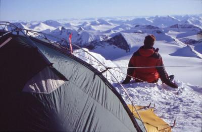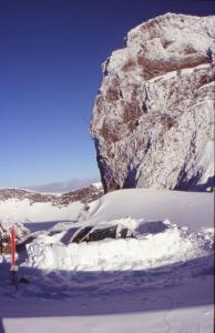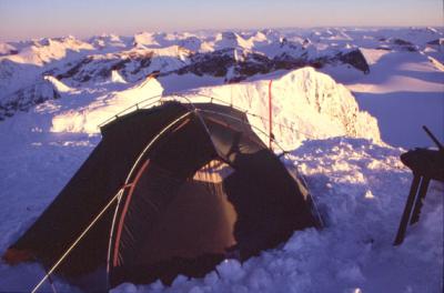 I camped on top Galdhopiggen some years ago in march/april, with almost no wind (I checked the weatherforecast before). Nice sunset and sunrise.(first 2 pictures) But if you are looking for a good "testing your tent" place try Porten between Galdhopiggen and Vestpiggen. The next night I camped there with upcoming bad weather. (last picture, big snowwall around the tent). Very heavy turning winds coming up from the Storjuvglacier, a lifetime experience!!!!1 poeng