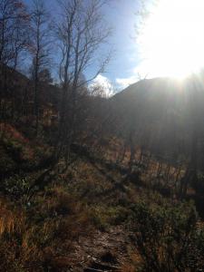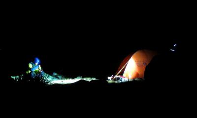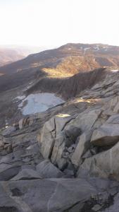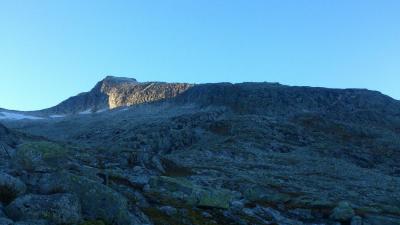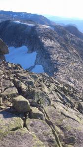 To ukesturer gjennomført i år. En fra Finse til Kongsberg og en fra Storlien til Femundsenden. Finnes som egne rapporter. Dette er mer enn oppsummering over hva som virket og hva som kan forbedres - for mine turer. Klær Nikkers ble prøvd med blandet resultat. Overraskende greit i regnvær, men ikke spesielt heldig i sol. Strømpene må være laaange og det ser ikke ut til at de jeg har er lange nok. Mine nikkers (fra Klatremusen), er antagelig ment for vinterbruk. Stoffet er i tykkeste laget på sommeren, men det var bare et problem på de varmeste dagene. Satser til neste år på noe enkelt og vindtett i kunststoff, kanskje med avtagbare bein. Tynn vindjakke sammen med ulike kombinasjoner av ull (netting og t-skjorte), var utmerket selv i kraftige vindkast. Forholdet mellom vekt og nytte her meget god. Poncho... vel, jeg fortsetter jakten, men det er tydeligvis vanskelig å lage en poncho som duger i ruskevær. I år vekslet jeg mellom Jerven Orginal og en USGI-kopi. Begge har sine sider, men en poncho må i det minste ha en brukbar hette og være lang nok til sekk. Tørt nok, men mye arbeide med å holde kontrollen på dette "enkle" plagget. Hansker ser ut til å være noenlunde løst for sommerstid. Kombinasjoner av tynne ullhansker, vanntette engangshansker og tynne arbeidshansker holder hendene tørre eller varme. Hatt, eller i mitt tilfelle, boonie, er tingen. God beskyttelse mot sol (360 grader) og regn, passer godt til myggnetting, bolle for småting i teltet, vannkopp og kjøling på varme dager. Bæring Sekken gjorde jobben hele veien. Jeg kan bare glede meg over å ha en sekk som passer og plasserer mesteparten av vekten på hoftene. Etterhvert blitt flinkere til å finne meg til rette med løsningene på sekken. Ribz Frontpack er like smart som i fjor. Med litt forsiktighet når jeg tar den av og på samt bruk av glidelåsen under lagring, så slipper jeg å løse 3D-puslespill i grålysningen. Like god på stien som i teltet til å ta vare på småtteri. Telt Fremdeles pysete ved tanken på å slå opp teltet i regnvær. Foretrakk å overnatte på utedo fremfor å slå leir. Vel, dels fordi været var vått og doen tørr, men også fordi terrenget var rotete så langt jeg kunne se. Trikset med silikonprikker i bunnen virker. Sklir ikke lenger rundt så lenge bakken er noenlunde jevn - det bør den være. Fikk en natt hvor begge sidene kunne stå åpne. Siste resten av solnedgangen på høyre hånd mens månen står opp til venstre... De egenproduserte linene var en betinget suksess. De holdt i vind, men knutene gled etterhvert heller dårlig. Usikker på årsaken, men holder en knapp på at Spektra kanskje ikke er så godt egnet - som alle sier. Erstattet med liner med trekantede låser i plast. Lange, men da får jeg litt ekstra å gå på når teltet skal opp i steinrøysa. Turteppe Virker godt og savner ikke soveposen. Trenger noe på hodet for natten, men det har jeg jo uansett med. Varm nok i masser, men må riste på den før og etter bruk slik at dunene fordeler seg. Bruker ull under og sokker på natten, men det er like mye for å spare posen for kontakt med hud og beinharde føtter. Lot til å trives godt i søppelsekken på bunnen av sekken. Tror den løsningen gir bedre utnyttelse av plassen enn kompresjonspose. Underlag Brukte to halve skumgummi underlag på første turen. Det var varmt, men ikke særlig behagelig. God føling med den lokale topografien på kvelden. På andre turen var Klymit'en reparert og jeg tok bare med et halvt skumgummiunderlag. Nå ble det komfortabelt, men bare halvveis varmt. Hjalp å legge sekken og ekstra tøy under fotenden, men ikke helt bra når Klymit'en ikke akkurat kan sies å være vindtett. Planen for neste år blir et tynt fullengde skumgummiunderlag sammen med det oppblåsbare garnet. Varmt, behagelig og lett. Multimat Superlite er tynt, men holder i masser for sommerstid. Går nok for XL versjonen - ikke mange grammene ekstra, men litt mer varme og ørlite mer underlag. Elektronikk Den gode nyheten er at Nexus 4 tåler tre uker til fjells helt fint. Den dårlige er at batteriet forsvinner på et blunk ved litt bruk. Selv med alt av går det fort. Må se å få fatt i et tvillingkort til min eldgamle Nokia (som er lettere selv med ekstra batteri). GPS ble brukt to ganger for å sjekke snitthastigheten - som later til å være på 3,8 km/t på god og plan sti. Så det er fristende å la den være hjemme. Kameraet går på tredje året og trenger en linsepuss. Ellers er det helt greit selv om det ikke påstår å være vanntett eller spesielt robust. Men når jeg ser på bildene savner jeg detaljer. Uten bruk av zoom forsvinner ting som skulle være i bildet. Et kompakt kamera med RAW-format står på ønskelisten. Form Stort sett bedre enn i fjor. Føttene tålte daglig julig godt og gå sakte aksjon i motbakkene er vellykket. Takket være bedre sekk og enda litt lavere vekt er resten av kroppen ganske lykkelig på kvelden. Sliten, men ikke skadet. Fikk problemer med motiviasjonen på siste tur. Jeg ser to mulige løsninger. Enten hvile rundt fjerde dag eller mer ukjent terreng. Tåke til tross, veien fra høyden ved Solheimsstulen til Femundsenden krevde ikke stort av mine tvilsomme evner uti navigasjonens kunst. Rett og slett for kjedelig. Halvtimen hvor jeg gikk i tåka teller ikke. Det var ikke noe problem på Harddangervidda, ettersom nok av turen gikk på ukjente eller gjengrodde stier. Spennende til siste hundre meter - hvor blir det av Kongsberg? Mat Frysetørret til middag er greit, men eksperimentet med en pose cheyennepepper trenger jeg ikke å gjenta, i alle fall ikke uten en lett tilgjengelig vannkilde. Outdoor Gourmet smakte godt, men bør ha rene posemåltider i bakhånd. I dårlig vær er det veldig greit å koke vann, åpne og lukke posen og være ferdig med det. Frokost går i retning av salamipølse og lignende. Fett, salt og proteiner på morgenen synes å være godsaker. En klatt smør til frokost elle