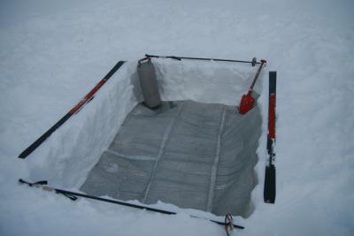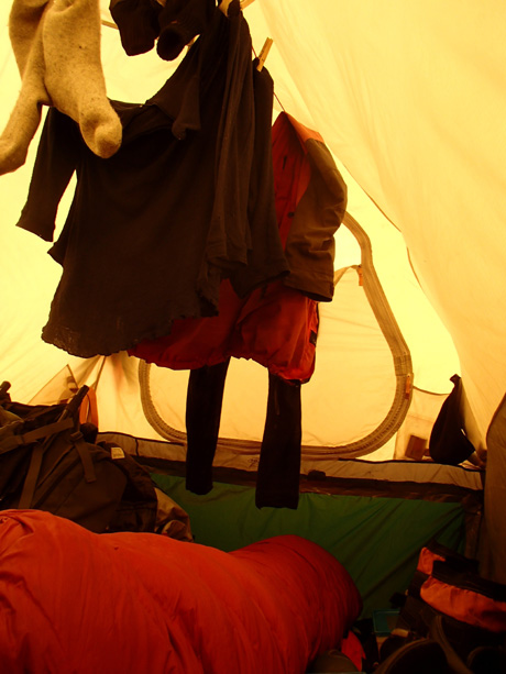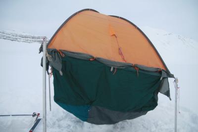 After many months camping on Svallbards and waiting in a small tent for better weather, this crazy idea got into my mind: Make the inner tent deeper to create more space. the outer tent stays the same to prevent getting to much wind. So last year I enlarge the innertent 60cm, using glue and tape to connect the bigger innertent together. Results: It works, a lot of space more. I used it last winter on Svalbard The weight of the tent is not increasing too much.. You need to have a tent which has a big space between the inner and outer tent, just to be sure that the tentpoles don't fall in the gap and that the snow on the snowflaps on the outertent will stay there. When it is a nice day and you don't want/need to dig down just use the tent as normal, the extra innertentvolume is laying down and give no problems. Look at the last picture: My jacket and touser is hanging on the top of the innertent and won't touch my sleeping bag.1 poeng