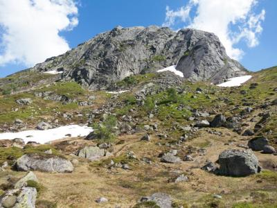 25.juli: Fra teltplassen min nær Snøheim, fulgte jeg t-merket sti mot Åmotdalshytta helt inn til vann 1529. Da hadde jeg også passert tett innpå Bruris imponerende østflanke. Skyene lettet heldigvis, og jeg så Langvasstinden og Larstinden, to majesteter her inne! Vannet ble rundet på nordsiden etter en liten spisepause, og jeg gikk begeistret løs på ryggen opp mot Søre Langvasstinden, 1970 moh. Halvveis opp ryggen er denne noe bratt og preget av sva, men ved å holde mot venstre (vest) unngikk jeg det meste av mulige problemer greit. Mot toppen ble jeg litt utålmodig, og tok en litt vanskeligere variant, da jeg skrånet opp i skaret til høyre for Søre L. Vel oppe var det grei skuring over V2 og V1, før det brått stoppet litt opp. Som forventet var det en bratt hammer her, med et nylontau hengende. Det var ikke spesielt utsatt, så jeg nølte ikke et sekund, og kløv resolutt ned hammeren, som nok teknisk sett er grad 2. Herfra var det bare moro opp til Langvasstinden, hvor jeg tok en ny matpause. Returen la jeg om Nordre Svånåtind, og deretter fortsatte jeg i retning Svånåtinden. Noe før denne, tok jeg av mot øst, og skled lett ned et snøfelt med bratt snø, og kom inn på hammeren før Bruris vestegg. Denne kunne ikke omgås, men jeg hadde med et velbrukt snaut 30 m langt statisk 9mm tau. Et rappellfeste viste at jeg skulle fire meg ned på nordsiden av egga. Problemet var at tauet garantert var for kort, om jeg skulle legge det dobbelt. Løsningen ble å binde det fast i rappellblokka, og så fire meg ned på enkelttau. Jeg tok det svært rolig, og inspiserte evt tak og sprekker underveis, med tanke på klatring opp. Det ser jammen ut til å gi utfordringer på solid 4-tall og kanskje 5-er klatring opp her, etter mine vurderinger. Gps-en målte rappelldistansen til 23 m, og det var ikke store taustumpen til overs, enda jeg hadde brukt enkeltau i rappellen. Så folkens; nå henger det det et rødt tau her, så dere kan klatre opp med topptau i alle fall i høst (2012). Satte fra meg sekken i skaret, og kløv raskt opp på Bruri. Returen ned i sørflanken etterpå var som beskrevet av mange; løs og forholdsvis bratt. Heldigvis sparte jeg noen meter mot slutten på å skli på et snøfelt. Deretter fortsatt jeg i østlig retning til jeg møtte på t-stien, før den lange marsjen tilbake til teltet ved Snøheim begynte. Totalt 11 timer på tur.1 poeng