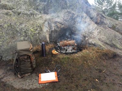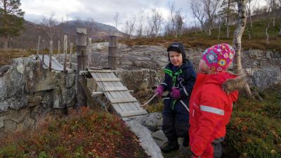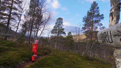 Ikke i dag men i går søndag. Gikk opp Simskardet på sørsiden av elva. En mye finere tur enn den vanlige på nordsiden av elva syns vi. Mindre benyttet sti - men finere å gå når myrene er tørre. Under Majafjellet ligger bjørkene i hopetall etter snøras - så vi samler sammen til et skikkelig "Lars Monsen bål" nede i en grusdekt utørret bekk. Etter å ha spist finner vi ut at vi skal gå til Rørskardelva og broa her mens mor passer bålet mens det brenner ut Hvor er broa? Vi krysser ikke broa - elva dundrer under og broa er ingen lekeplass. Ved den nye stien er det også skilting. Begge ungene klarer å lese skiltet så det er håp.1 poeng
