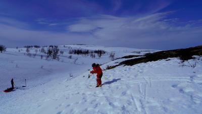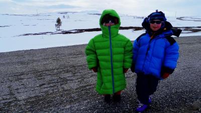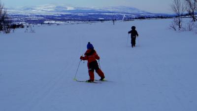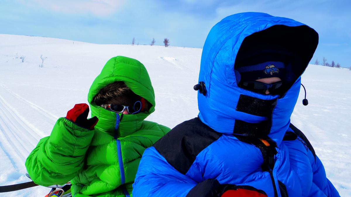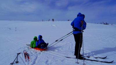 Noen dager med ski på en mer soft-is aktig snø ved Røros er over. Kaldt om nettene - men usedvanlig varmt om dagene (tror jeg) - med opp mot 8- 10 varmegrader. Ungene begynner virkelig å få sansen for skigåing men de ønsker helst at det skal gå nedover hele tiden - på Røros er det ikke de bratteste bakkene og egentlg ikke så lett å motivere - spesielt ho minste. Så når skigåingen ikke er så spennende lengre er det ikke annen råd enn å hive seg bakpå brettet. Når vinden blåser kan det fort bli kjølig - så noen behagelige og passende dunjakker kan jo være gode å tre over hodet.1 poeng