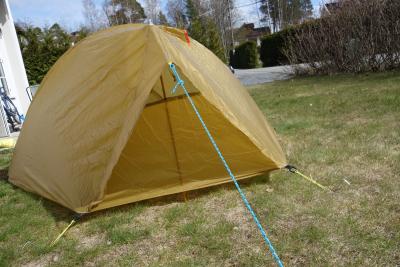 Jaha, då har jag provat att sätta upp tältet för första gången... Blev väl OK, men inte så jättebra ändå. Jag rekomenderar att hålla sig borta från att göra egna tält om man inte har väldigt mycket tid. Kompakt när man packat det (ca 1 liter), vikt 680 gram. Avsett för bike packing i vindskyddad miljö. Stort och rymligt är det i alla fall, och duken är ganska kraftig. Sett i efterhand hade det varit bättre att köpa ett Vaude Powerlizzard 1-2 och skippat innetältet...5 poeng