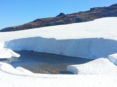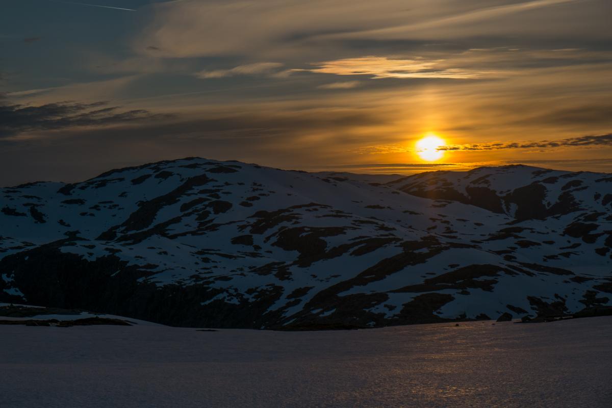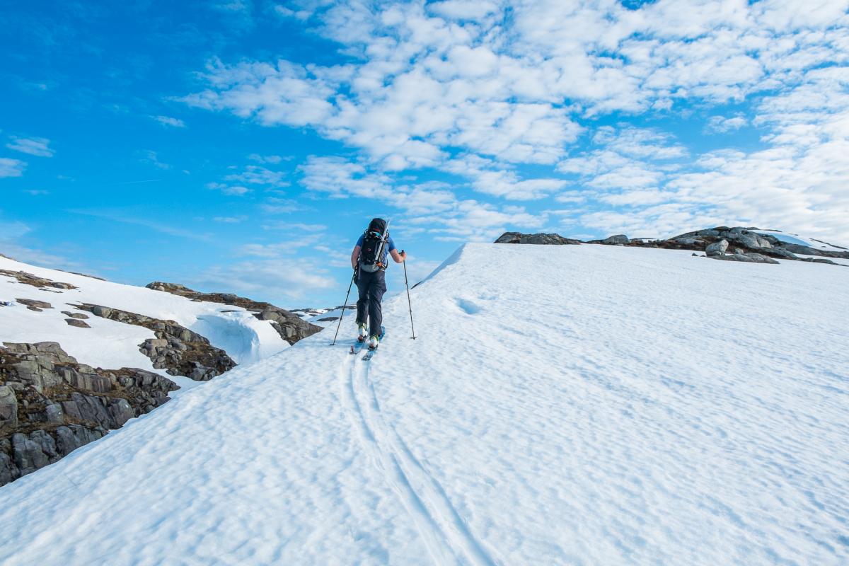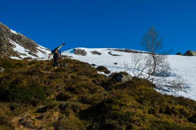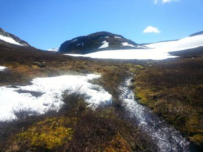 I går ble det et lite besøk i Trollheimen. Jeg var nysgjerrig på hvor mye snø det var, og i hvilken grad informasjonen fra f.eks. senorge.no var til å stole på. Jeg håper bildene er nyttige for andre som vurderer turen. Parkeringsplassen var helt tom og jeg traff ikke på et eneste menneske eller ferskt fotspor. Det var litt mer snø enn det senorge.no informerte om, men det var så godt som snøfritt helt frem til hvor den merkede stien krysser Gravbekken. Gjevilvassdalen var veldig snørik. Det var kun én plass langs hele bekken hvor det var mulig å krysse, men jeg stolte ikke på at snøen ville holde. Jeg så at noen hadde gått her for noen dager siden. Jeg fulgte bekken helt opp til Blåhøtjønna og fant ut at det var mulig å vade over der. Vannet gikk opp til underlivet, men det gikk fint. Snøen i dalen, og til tider også oppå fjellet, var våt og vanskelig å gå i. Truger kom godt med. Været var førsteklasses, og jeg må innrømme at det var litt deilig å ha Trollheimen for meg selv. Her, et lite stykke forbi hvor stien krysser bekken, har bekken tydeligvis vært krysset tidligere. Det var imidlertid en del sprekker i snøen, så jeg tok ingen sjanser. Dyp, men kort vadetur. Bart (men vått) helt opp til platået på Blåhøa. Jeg prøvde først uten truger. Du vil falle gjennom et par ganger, men det er overkommelig.3 poeng