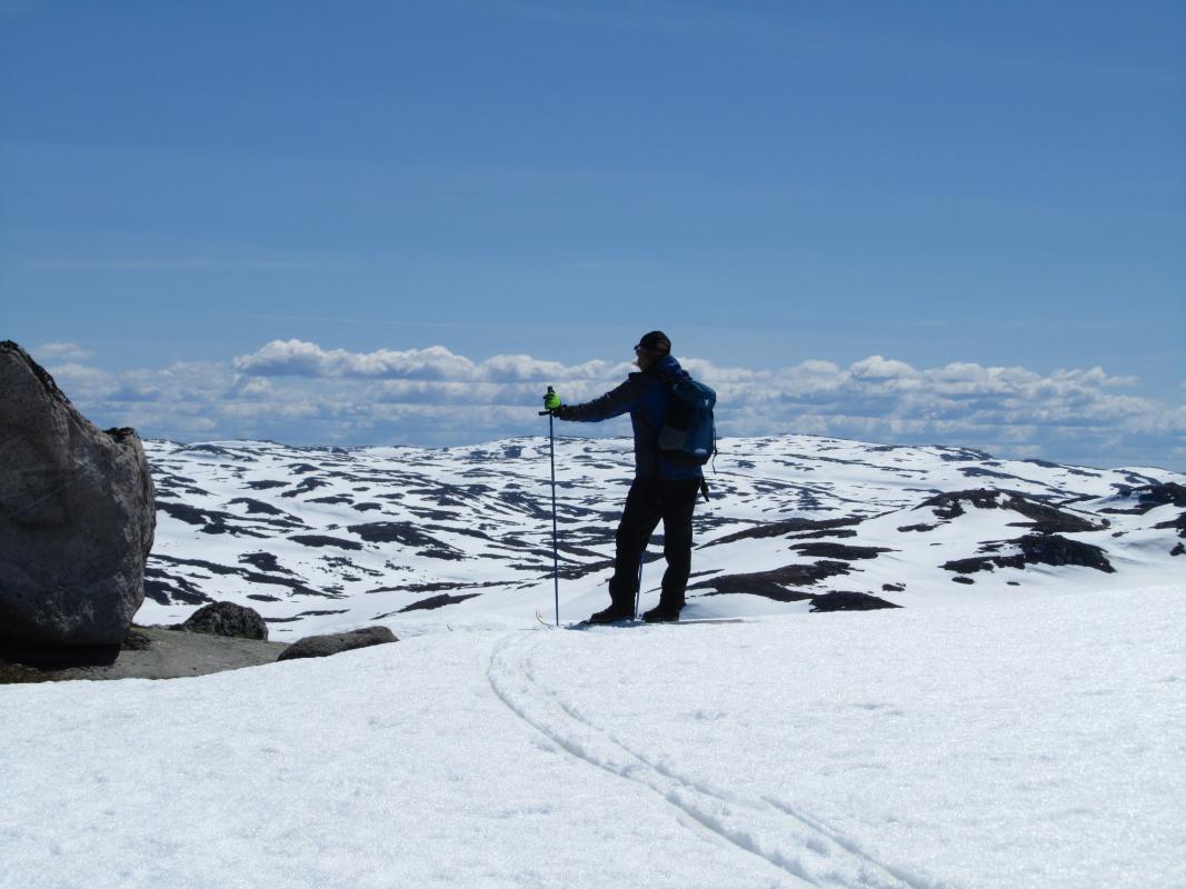 Sommertemperatur, og skiføre I dag (fredag 12. Juni) tok jeg for første gang i sommersesongen 2015 turen opp til Hunnedalen. Skiene var hjemme, men jeg hadde med trugene. På grunn av skade (achillesen) var jeg usikker på om jeg i det hele tatt burde ta turen oppover, men lysten til igjen å komme opp i heia var for stor. Jeg hadde pakket med mat og utstyr for å være til søndag. Det kjentes godt på vekta. Sekken var nok noen kilo mer enn vanlig. Med bakgrunn i erfaring fra mer enn 20 år med turer i dette terrenget, var jeg sikker på at det fortsatt var mye snø. Og at det ville bli en stri tur - om jeg i det hele tatt kom innover. Det er litt annerledes å gå på fenner enn på vanlig sti. Andre muskler? Trugene var med sånn for sikkerhets skyld. Normalt er snøen så pass hard at det er mulig å gå uten å synke for mye nedi. Det som har hindret meg noen ganger er snøsmeltingen. Fossebekken har av og til vært så pass stor at jeg har snudd. Med tanke på snøsmelting, startet jeg tidlig hjemmefra. Og med temperaturer opp mot tyve grader, så var snøsmeltingen endelig kommet i gang. Elva i Hunnedalen var ikke flomstor, men med mer vann enn vanlig. Det var selvsagt ingen andre på vei innover. Jeg kunne se spor i snøen som antakelig var fra forrige helg. Det er andre enn meg som sterkt ønsker at sommersesongen må komme i gang. Det var snø omtrent helt nede ved veien. Det ble ikke mindre snø oppover. Det er ofte slik at snøen helt nede er råtten og det er lett å tråkke gjennom. Det skjedde noen ganger, men heldigvis uten noen skade. Det var mer snø enn det jeg hadde trodd. Jeg har aldri opplevd så mye snø så sent. Et år - for lenge siden - gikk vi innover 3. Mai, og det var omtrent snøbart. Jeg gikk til Fossebekken. Ca 1/3 del av turen inn til hytta. Da følte jeg at achillesen hadde fått nok. Og snudde. Det hadde vært mulig å komme over bekken uten problemer, men videre oppover var det skiføre. Og jeg følte at det å vasse i snø ikke var helt det jeg burde gjøre. Nedturen ble - nedtur. Selv om sola skinte, det var varmt, og nesten uten vind, var det trist å ikke komme innover. Men det ble da et par timer i heia. Det går framover, og sommeren må da komme en eller annen gang. Vis hele artikkelen slik den er på hjemmesiden2 poeng