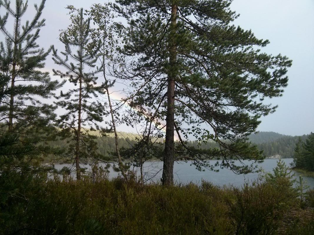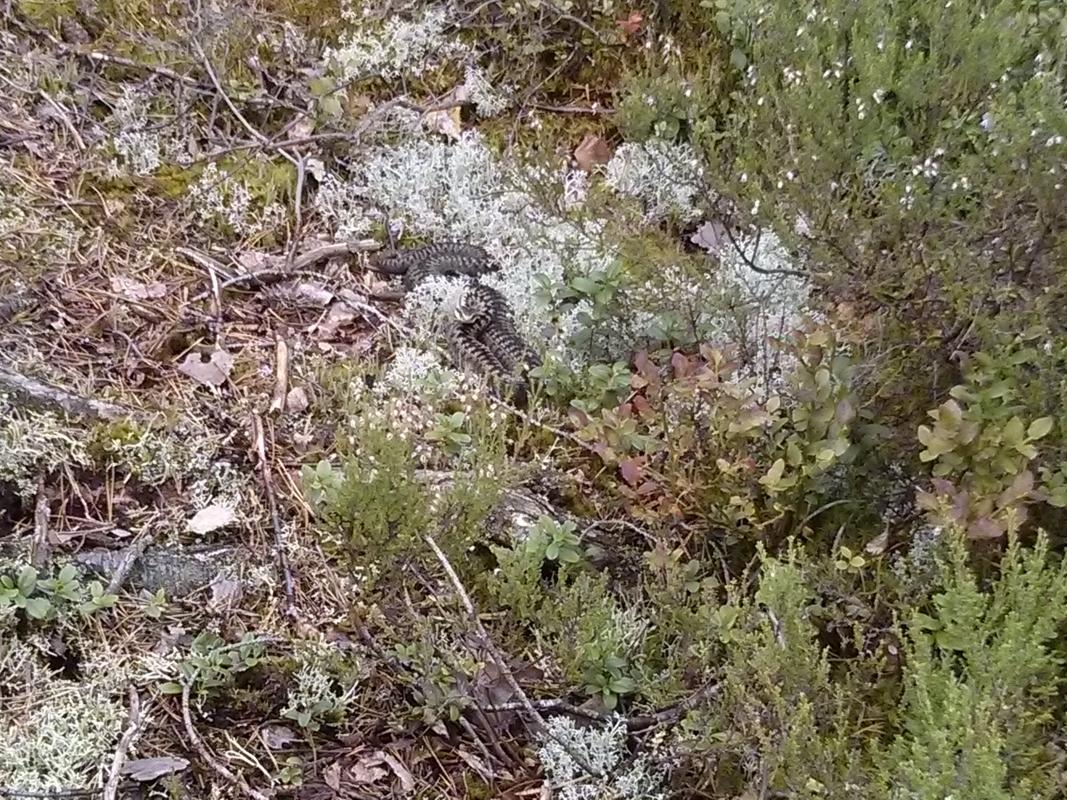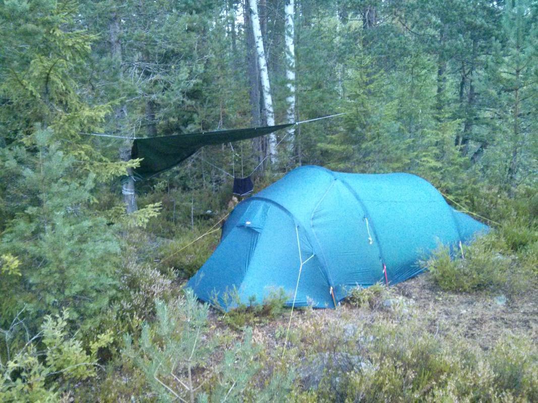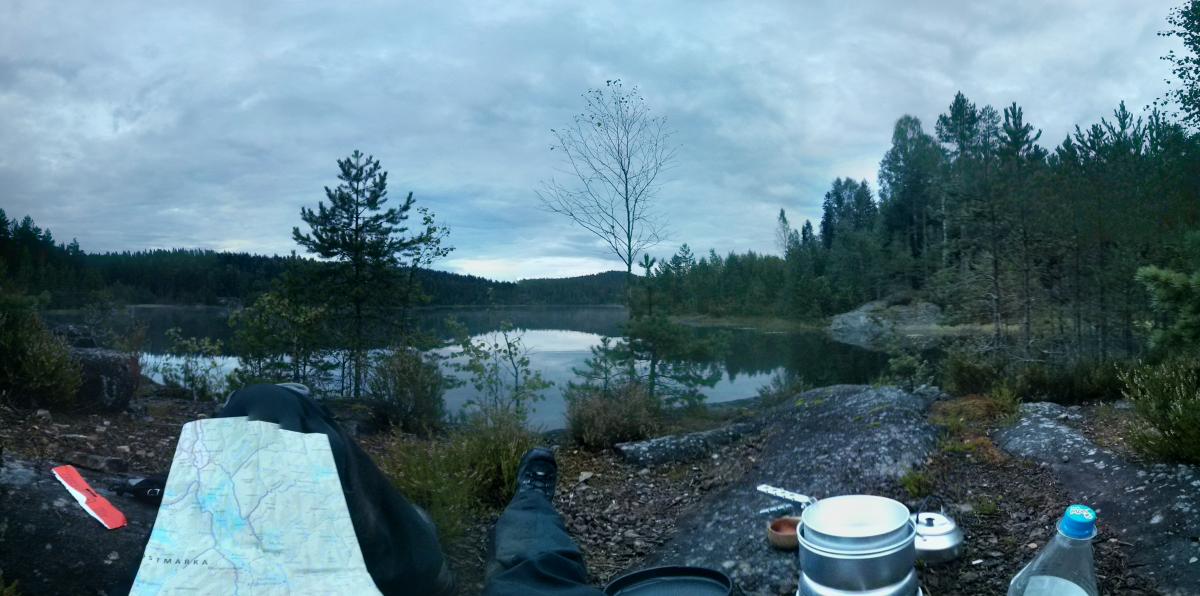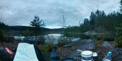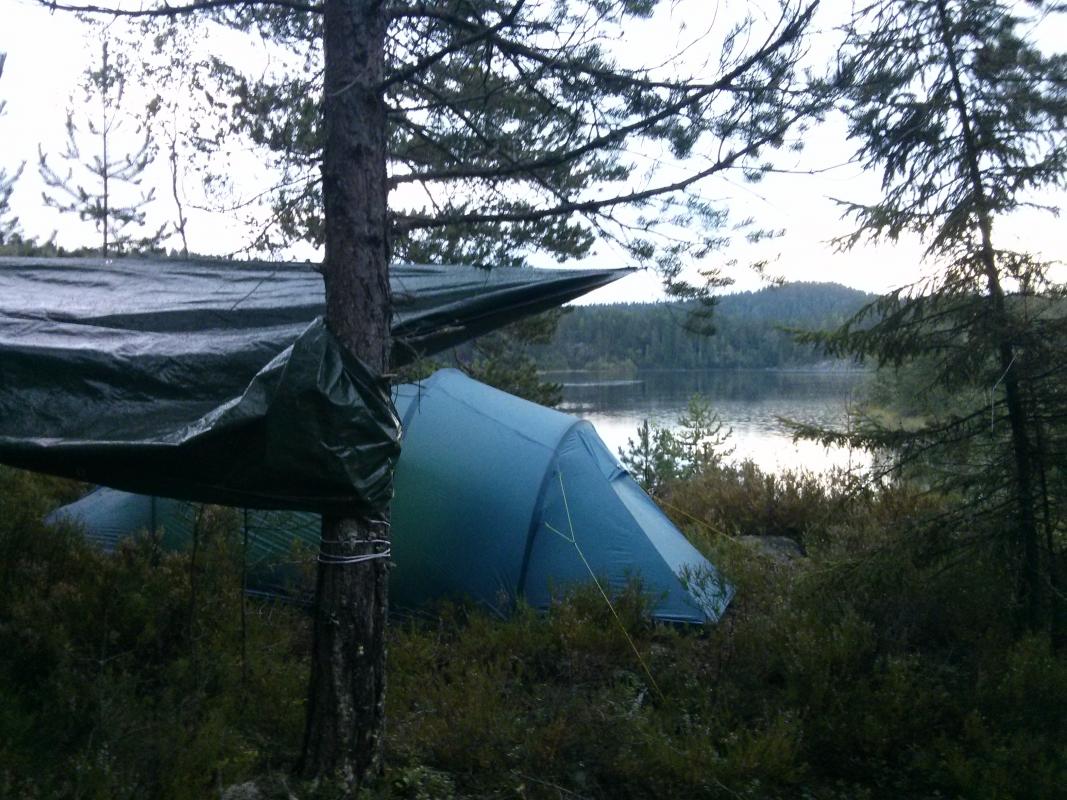 Lørdag 16. aug til søndag tok jeg en tur til Nordre Krokvannet i Østmarka i Oslo, nøyaktig posisjon her: https://www.google.no/maps/place/59%C2%B050'54.4%22N+11%C2%B001'07.6%22E/@59.8484516,11.018784,15z/data=!3m1!4b1!4m2!3m1!1s0x0:0x0?hl=en Jeg starta turen med en vaffel og kaffe på Losby besøksgård, flott plass. Det går an å leie kano der, noe jeg vurderer å gjøre i fremtiden. Like før jeg ankom tordnet det heftig bortpå himmelen, så jeg fant ut at det kunne være lurt å komme i ly så fort som mulig. Jeg fikk surra opp tarpen/presenningen i siste øyeblikk før det fossa ned fra himmelen. I ly av regnet var det en særdeles stemningsfull pause: Så litt om lokasjonen: - Tok ca 1,5t å gå hit tipper jeg (så aldri på klokka dog), mest grusvei, noe blåmerka sti til slutt - Stor teltplass, det var god plass til mitt Helsport Superlight 3 camp, og det var fortsatt plass til overs. - Praktisk med teltplass veldig nært vannet. - Av andre folk så jeg et par kanoer som passerte øya jeg var på vei mot Røyrivannet, og en annen overnatter et annet sted på vannet (så bare bålet om natta). På søndagen så jeg noen som besøkte halvøya rett nordøst for meg. Så litt egne erfaringer og lærdommer: - Må skaffe meg ny ryggsekk (har nå Bergans Telemark 80L (tror jeg) nå), får alltid vondt i ryggen øverst, selv med bare 16-17kg slik som denne turen. Glemmer det alltid mellom hver tur, men er uaktuelt å bruke denne på turer som er lengre enn en til-to dager. - Forøvrig, hvor store sekker bruker dere folkens? 80L er et minimum synes jeg, jeg klarer bestandig å pakke sekken helt full. Det eneste unødvendige jeg har med meg er presenningen fra Clas Ohlson, 3x4 (evt 2x3) meter tror jeg, og førstehjelp (bandasjer, plaster, etc) på størrelse med en liten toalettmappe. Ja og i tillegg pakka jeg ned turbuksa og jakka fordi det var varmt nok å gå uten (men de måtte jeg ha på kvelden). Med ny sekk har jeg lyst på i alle fall 90-100L. - Kan klare meg uten presenningen, bare å kle på meg og finne meg et tre dersom det ikke regner altfor voldsomt. Men det er mye mer kos å ha den - Prøv å test ut telys-i-sko som tørketeknikk over natta. Gikk over litt halvdypt vann som gikk over skoa for å komme meg på øya (men det finnes tørrere veier!), og fjellskoen ble aldri tørr igjen. På veien hjem tok jeg et halvhøyt steg for å komme meg opp på en liten hylle, og med ett stirra jeg øye-til-øye med denne karen: Jeg har aldri sett en huggorm før (ikke så vanlig i Nord-Norge der jeg er fra tipper jeg), så jeg gikk i full Japansk-turist-modus og dokumenterte i vei. Etter å ha gått videre kom jeg plutselig på at jeg hadde vaset rundt natta før uten å overhode tenke på at det var slike krypdyr i lyngen rundt meg. Glad jeg har høye fjellsko! Og like etter, i ei myr, ser jeg enda en huggorm! Denne gangen svart, men mindre villig til å bli tatt bilde av. Så til slutt litt erfaringer med to nyinnkjøpte ting: Helsport Superlight 3 camp: + Teltet er vel akkurat stort nok til 3 personer, noe som er flott om jeg vil ha med meg folk. Samtidig veier det kun 2kg og har passe lite volum, med andre ord flott til soloturer som denne. + Enkelt å sette opp, har satt opp et annet Helsport-telt før, og klarte dermed å sette opp dette helt fint uten bruksanvisning (stor applaus til meg) - Det regna en del på turen, mest på søndagen, i korte, men kraftige regnskurer. Jeg ligger i innerteltet, og skal strekke meg ut i ytterteltet for å finne fram noe, og hva merker jeg? Jo, det regner ørsmå dråper igjennom hele taket på ytterteltet! Fram med en plastpose for å dekke over fjellskoa som står og "tørker". Jeg tror det kanskje skyldes noe jeg leste om i bruksanvisningen/reparasjonsinstruksjonene dagen før, om at det er tråder inni teltduken som utvider seg første gang de kommer i kontakt med vann. Med andre ord vil dette neppe skje på nytt. Håper jeg. Det var tørt inni innerteltet, så det var på ingen måte noen katastrofe. - Innterteltet åpnes ved hjelp av to glidelåser, en nede, og en oppe. På mitt forrige Helsport-telt var det to glidelåser oppe, og dette likte jeg litt bedre, fordi jeg føler at jeg har mer kontroll ventilasjon, og, litt flauere, på hvor lett insekter kan snike seg inn. - Ventilasjonen på den siden av teltet uten inngang, henger ned i innerteltet, og det var ingen måte å krølle det opp og/eller feste det på noe vis, slik som i mitt forrige Helsport telt. Dermed ble ventilasjons-teltduken hengende ned midt i teltet, akkurat der jeg lå og leste. Ikke noe verdensproblem akkurat, og går sikkert an å ordne på et vise, men jeg nevner nå alt. Bilde på akkurat dette: Trangia 25-4UL stormkjøkken med gassbrenner: - Brukte det til kaffe, koke vann, og steike bacon, og dette funka det super til. - Liker at apparatet står støtt (en av grunnene for at jeg kjøpte det), og - at jeg slipper å vase med utbrettbar vindskjerm slik som på mitt forrige apparat.1 poeng