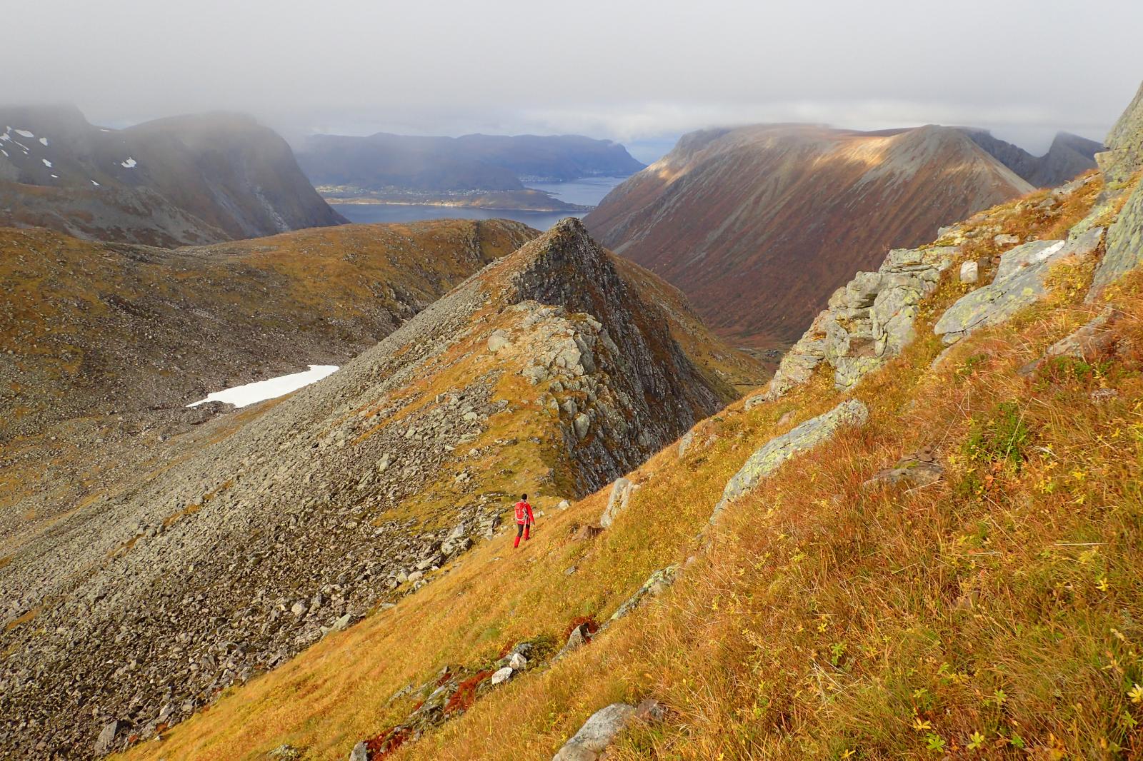 Det vert ikkje alltid slik ein har tenkt. Vi valde utsikt framom skodde, sjølv om dei høgaste toppane kanskje stakk over. Nydelege haustfargar, i den grad ein får det på Nord-Vestlandet. Vi kom oss aldri til Åvasstind, men erobra ein namlaus knatt på 968 moh. Søndag på Sunnmøre er heilt innafor - uansett turmål. Bomullsdammen i Ørstaskaret Mot Romedalstinden frå høgde 968 moh Retur på nordre enden av Romedalstraversen http://lenesintur.blogspot.no/2015/10/forsk-nr-2-pa-avasstinden.html1 poeng