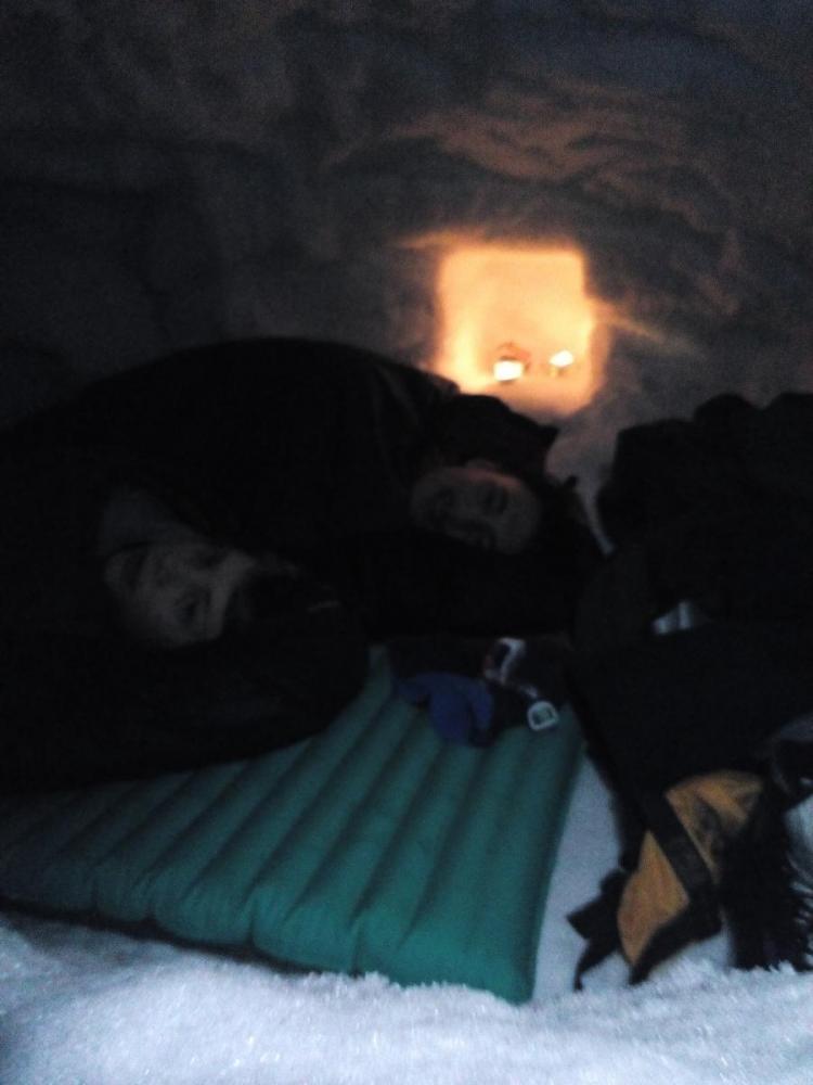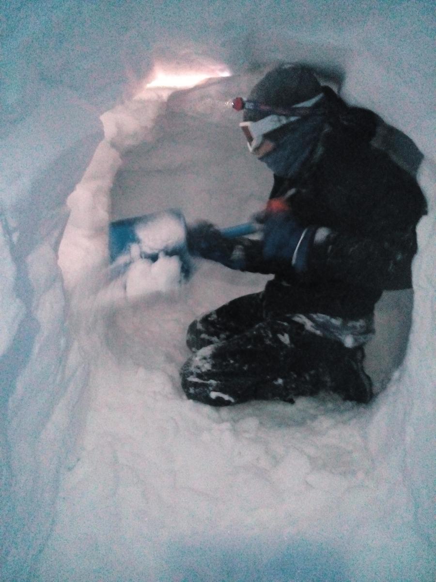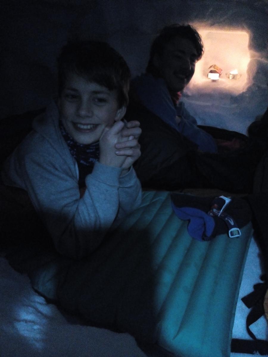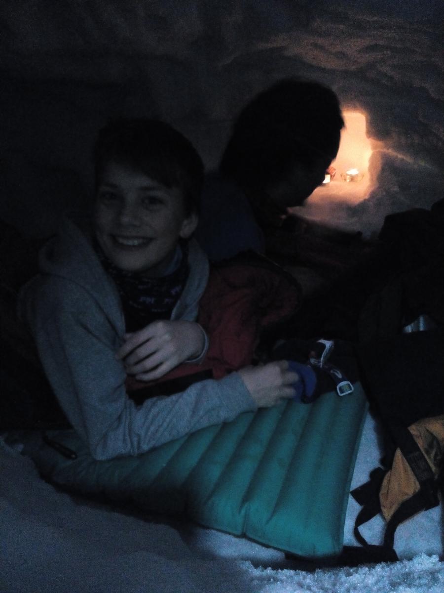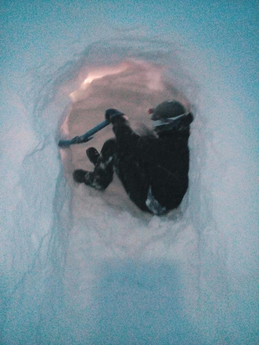 Tirsdag 29. desember reiste jeg og ungene til Hallingskeid i 4 dager. To gutter på 12 og 16. Vi la oss inn på Dnt hytten og hadde som plan å gå litt på ski, samt at guttene skulle grave sin egen snøhule og overnatte i den. Været var langt fra det beste, med ca. 22-25 m/s og snøflyk. Men onsdagen begynte vi å grave på omgang inn i en stor snøskavl nedenfor hytten. Han på tolv var svært entusiastisk og spadde i vei mens han planla hvordan hulen skulle bli. Vi erfarte at det var tre forskjellige hardhetsgrader på snøen vi gravde ut, og at vi hele tiden måtte være to som spadde. En inni hulen og en i utgangen som spadde snøen videre ut. Det ble et par timers graving som fortsatte nyttårsaften. Og etter pinnekjøttet var spist, kort var spilt og snop fortært tok de med seg soveposene, liggeunderlag, pute og varmeflakser og la seg i snøhulen. Jeg dekket åpningen 3/4 med et snøbrett og forseglet det med snøblokker. Endelig skulle de sove i snøhule, noe de hadde gledet seg til lenge. Stormen raste utenfor, men inni snøhulen var det nesten helt stille. Veldig rart. Hodelykt og noe isolerende å ha under knærne når du graver er smart. Photos (1).zip1 poeng
