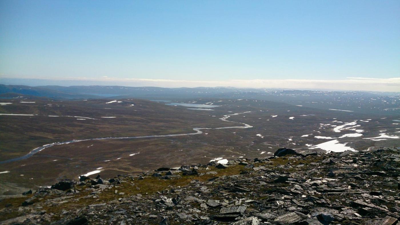 Dag 16 forts. Sallie Keys Lake - McClure Meadow, 24 km Etter noen timer ved MTR drar jeg av gårde litt over tolv og går oppover langs "San Joaquin River South Fork" med mange vakre fossefall og fine settinger. Krysser broen ved piute Canyon og videre oppover. Stopper og kjøler meg ned i elva hvor det et en fin fossekulp. Var en varm dag med 25 grader i skyggen, normalt har det ikke vært mer enn 16-17 grader og selv det føles veldig varmt med en sol som tar mye mer enn hjemme. John Muir Trail oppover langs San Joaquin River South Fork Framme ved veiskillet mellom Evolution Valley og Goddard Canyon blir det en ny pause før jeg fortsetter opp, opp og opp langs switchbacks som fører til Evolution Valley. I de bratte bakkene kjenner jeg godt at sekken har blitt vesentlig tyngre etter resupply ved MTR. Utsikten fra fjellsiden er litt hemmet av røyken fra skogsbrannene lenger vest som har gitt mye smog de to siste dagene. Kommer meg omsider opp til Evolution Meadow hvor jeg hadde planlagt å campe, men det ender med at jeg går noen km til og camper like nedenfor McClure Meadow. Viser seg at plassen jeg har funnet bare har 3 cm sand over fjellet så jeg må bardunere teltet med steiner noe som egentlig fungerer veldig greit. Fikk også fikset ene staven litt bedre nede på ranchen så nå tåler den å brukes med litt mere spenn uten å bøyes så jeg kan ha full høyde på teltet igjen. V: Evolution Meadow M: Mye hjort å se langs stien på kveldene H: Solnedgang ved Evolution Creek rett nedenfor teltplassen Dag 17 Mcclure Meadow - nedenfor Helen Lake. 24 km Planla en kort dag og kun gå opp til Evolution Lake, så tok det rolig på morgenen. Gikk forbi McClure Meadow og Colby Meadow før stigningen mot Evolution Lake startet. Stoppet ved nydelige Colby Meadow og tok litt bilder. Himmelen var skyfri og brilliant blå, men røyken fra skogsbrannen lå som et teppe mot vest. Colby Meadow og Evolution Creek Da jeg kom opp til nydelige Evolution Lake hadde røyken også kommet hit og sikten ble dårligere. Veldig synd siden dette er et av de flotteste områdene i Sierra. Ble sittende å prate en stund med han jeg delte posen med m&m med nede ved MTR. Han fortalte at han hadde startet turen sammen med faren, men det hadde blitt for hardt for gamlingen og han hadde avbrutt tidliggere, han ville derfor selv gå ut ved Bishop Pass og fortsette ferien sammen med faren i bil. Trivelig kar og rask til beins, synd han ikke fikk fullført hele JMT da han virkelig virket å være i god form selv. Etter en stund valgte jeg å gå videre og tok en trekvarters pause ved Saphire Lake før jeg gikk videre mot Wanda lake og over tregrensa. Fra Wanda var det ikke lange turen opp til Muir Pass (3644 moh) og der ble det en ny liten pause. På passet står Muir Hut som er et enkelt værskydd i stein satt opp til minne om John Muir av the Sierra Club. Evolution Lake V og M1: Evolution Lake M2: Saphire Lake H: Wanda Lake Muir Hut Fra passet går det nedover mot Leconte Canyon, først forbi et par småvann og så Helen Lake. Veldig steinete og den røffeste delen av JMT jeg har gått så langt. Ville gjerne campe litt høyt, men fant ingen plasser før jeg kom ned pa rett ved tregrensa. Der var det såvidt plass til teltet mellom en stein og et tre, greit med et lite telt som kan settes opp nær sagt over alt. Ble en lang dag likevel og klokka var vel litt over seks når jeg slo opp teltet. Fikk turens første vannblemme på ene tåa også. Sikkert fordi skoene er fulle av støv, greit med lufting i front på Salomon xa ultra 3D , men de kunne gjerne vært støvtette ihvertfall. V: Helen lake M: Black Giant H: Teltplass nedenfor Helen Lake Dag 18 Helen Lake - Deer Meadow 19 km Ble nok en sen start og klokka var over ni før jeg kom meg avgårde. Hadde vært ganske overskyet tidlig på morgenen, men snart var det nesten helt skyfritt. Kom ganske fort ned i mer trebegrod terreng og etterhvert kom jeg på toppen av Le Conte Canyon. Veldig flott sted og elven rant langs stien hele veien. Dessverre kom røyken fra skogsbrannene også denne dagen sigende inn og ødela noe av utsikten. Var lenge usikker på om jeg skulle ta de tre passene langs SHR før Palisade Lake, men valgte å følge JMT nedover langs kings Canyon Middle Fork. Tok en lengre pause ved en eng langs ved elva og fikk meg et avkjølende bad i det varme været. Le Conte Canyon Grouse Meadow og Middle Fork Kings River Omsider nådde jeg krysset mellom JMT og Middle Fork Trail og fulgte JMT noen km til før jeg slo leir. Delte campplass med Matt fra Ohio som gikk motsatt vei av meg. Han hadde skadet kneet ved Forester Pass og var glad for at jeg hadde litt ibux til overs. Mens vi satt rundt leirbålet hørte vi noe leven borte på myra og noen hjort ble forfulgt av et rovdyr. Matt gikk bort for å se og da kom de en ny runde og var bare rett bortenfor Matt. Han løper mot meg og sier det var en puma. Antageligvis skremte vi pumaen for etter en stund kom hjorten med to kalver luskende ut av buskene og senere kom en litt større hjort. V: På vei oppover langs Palisade Creek M: Hjortene som lusket bort etter møtet med pumaen H: Stjerneklart over trærne Dag 19 Dear Meadow - vann nedenfor Lake Marjorie. 24 km For en gangs skyld kom jeg meg opp tidlig. Pakket sammen sakene, ønsket Matt lykke til på sin ferd nordover mens jeg satte kursen sørover. Gikk forbi noen grupper som var i ferd med å pakke sammen før jeg kom til bunnen av Golden Staircase. Teltplassen lå på 2650 moh og golden staircase, som er en flott bygget sti i stedvis bratt terreng, tok meg opp til Palisade Lakes på 3230 moh. V: På vei opp mot Golden Staircase M: Utsikt nedover Palisade Creed fra bunnen av Golden Staircase H: Bunnen av Golden Staircase Golden Staircase er en flott bygget sti i fjellsiden, men er også en av de hardeste etappene pga mye stigning i god høyde John Muir Trail er åpen for bruk av hester og pakkdyr og nedenfor Palisade Lakes var det noen cowboyer som hadde r