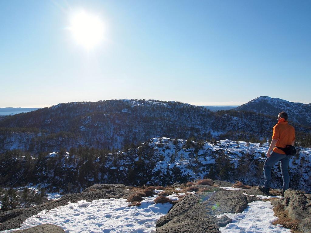 Kjapp ettermiddagstur i dag - i nydelig vær! På bildet har jeg kommet meg opp på Damsgårdfjellet, og under solen ligger Gravdalsfjellet - og over der gikk ferden i dag. Men siden det var mer "firefjellsvær" enn "tofjellsvær", gikk ruten dit via avstikkere til Olsokfjellet og Holefjellet . Fin tur, og den gikk i propert tempo, synes jeg Veldig lett å gå, hardpakket snø/is perfekt for brodder. Siden det blir mer gråvær fra onsdag av, er det ikke utenkelig at jeg legger opp til å gå hjem fra jobb i morgen ettermiddag - en tur over Lyderhorn (over hodet mitt på bildet) kan jo bli en fin måte å nyte resten av finværet på.1 poeng
