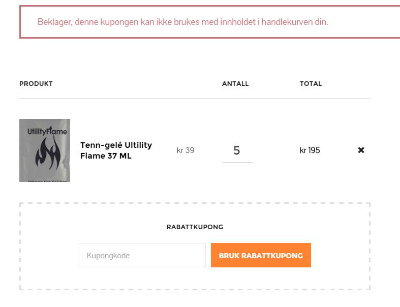 Kan ikke gi litt prosent på drivstoffet uten ovn, da? Jeg har sånn finfin caldera fra Traildesigns, så jeg trenger ikke ovnen. Fin butikk, forresten! Jeg prøver å kjøpe enten denne (37ml poser) eller denne (177ml pose).. Samme for meg hvilken, egentlig. Får altså ikke benytte kode, men du vil vel egentlig selge ovnen?1 poeng