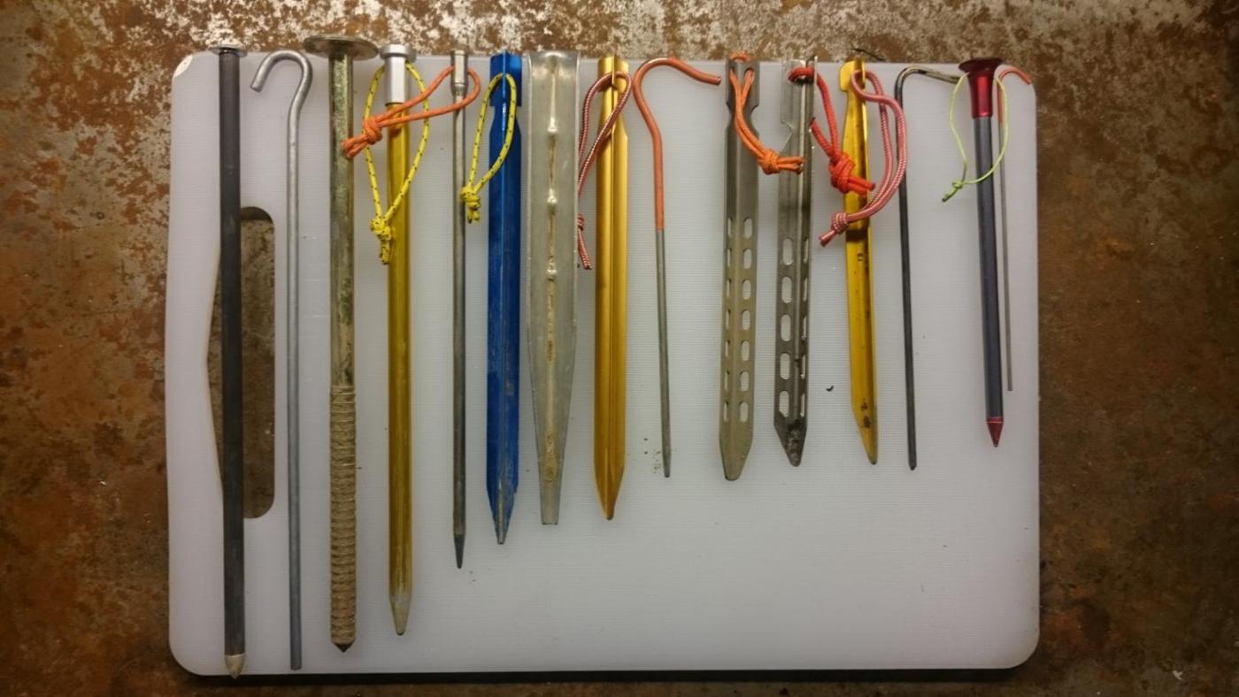 Pluggbukett: Fra venstre: Ruta Locura 9" Sorex stakes: 7 gram Generic Aluminum 9" skewer: 28 gram Tentipi Steel Peg 23: 120 gram (!) Easton 9" Nano Aluminum Tubular stake: 13 gram Clamcleats Spear titanium stake: 18 gram Clamcleats Alloy Y-stake: 12 gram Tentipi Lightweight [sic!] Aluminum stake: 18 gram Hilleberg Aluminum Y-stake: 13 gram Vargo Titanium skewer: 9 gram Toaks Titanium V-stake: 12 gram FAAAAAAKE Ebay "Toaks "Titanium" V-stake" (egentlig aluminium): 12 gram DAC/Hilleberg Aluminum V-stake: 12 gram Toaks Titanium 6.5" skewer: 6 gram MSR Carbon Core stake: 5.5 gram Terra Nova Skewer: 1 gram Siden bilde ble tatt har jeg mottatt 4 nye Ruta Locura 6" Sorex plugger, samme som nr. 1 fra venstre, bare 2/3 lengde Plukker litt forskjellige plugger fra tur til tur, men baserer meg i det store og hele på de letteste karbonpluggene (som altså tåler det utroligste) -- har ikke ødelagt noen ennå. På en typisk tur med tarp og gåstaver tar jeg f.eks med meg 6 RL 9", 4 RL 6" og 4 MSR Carbon Core, med Duomid tar jeg to mindre av 9-tommerne. I tillegg har jeg med 4 Terra Nova "nåler" på 1 gram stykket, men disse brukes bare til å feste bivvy i bakken. 2 Toaks titanplugger til Caldera Cone som gryteholder. Kanotur i ruskevær med lavvo kan det hende jeg tar med sandpluggene til Tentipi, hvor jeg nesten bikker kiloet bare med 8 store plugger + 16 lettere plugger til barduner.. Alt til sin bruk -- kan aldri ha for mange plugger. Jeg trenger ikke hjelp.1 poeng