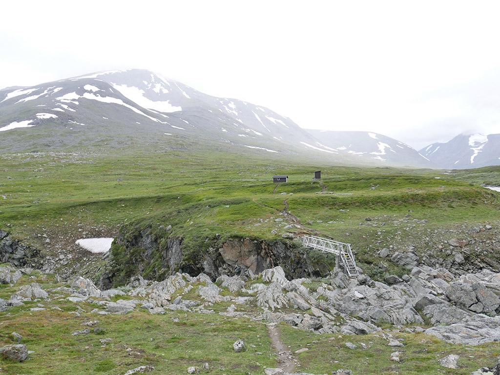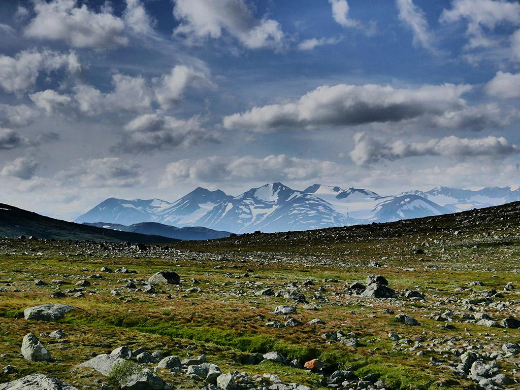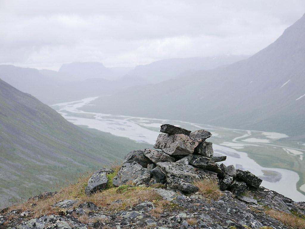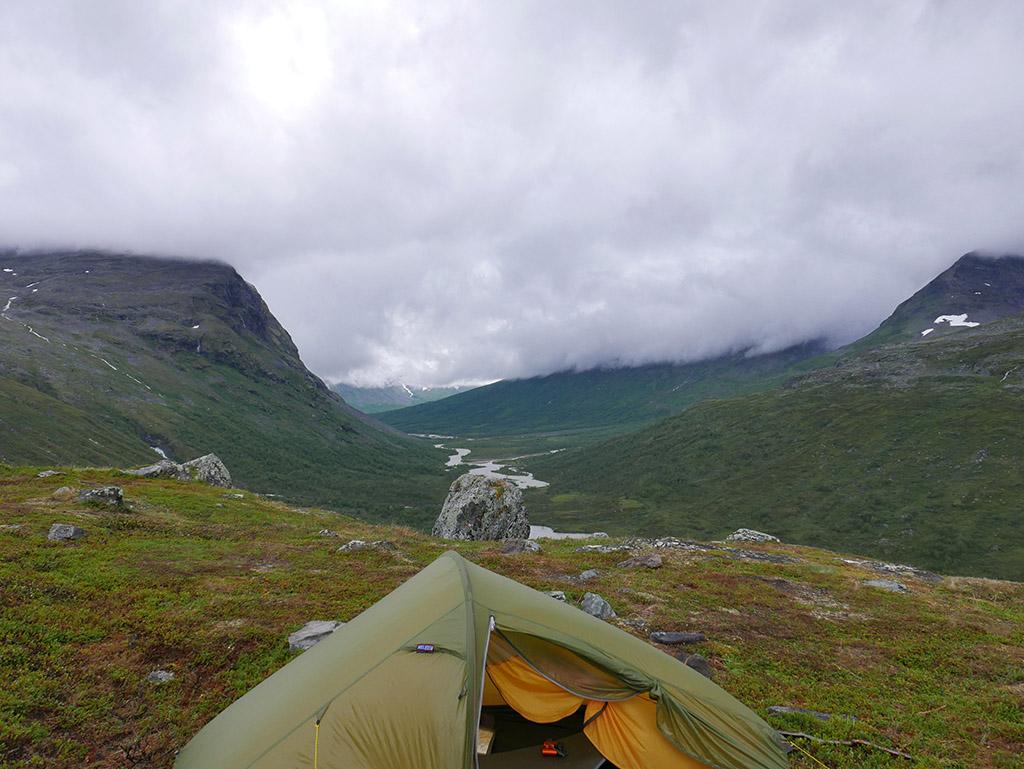 Fra Finnmarksvidda til Polarsirkelen, etappe 5, fra Saltoluokta til Sulitjelma 25. august – 4. september Overnattinger: Pietsaure (telt) Nienndo, Sarek (telt) Øvre Rapadalen, Piela, Sarek (telt), 3 netter Alggavagge (telt) Alajavre (telt) Staloluokta, Virihaure (STF) Staddajåkkastugorna (Svenska Naturvårdsvärket) Sorjushytta (DNT) Sulitjelma hotell Det er 42 turdager siden jeg startet fra Alta, og turen har gått over Finnmarksvidda, gjennom Reisadalen, via Finland og ut til Helligskogen, indre Troms, Dividalen og Narviksfjellene. Jeg har hatt en hviledag på Ritsem fjellstasjon ved Akkajaure. Herfra kunne jeg tatt båt over innsjøen og fortsatt sørover gjennom Padjelanta. I stedet har jeg lyst til å bruke ei ukes tid på å gå gjennom Sarek nasjonalpark fra øst til vest. Været har vært nydelig de siste to ukene, så jeg har nesten glemt at det straks er september måned. Saltoluokta fjellstation (STF) på grensen til nasjonalparken er en flott fjellstasjon med butikk og full service, og her er fullt av folk. Jeg spiser lunsj i restauranten med en svenske jeg har blitt kjent med på Ritsem, vi har tatt buss til Kebnats og deretter båt over hit. Butikken tar seg godt betalt, men de har alt jeg trenger så jeg provianterer for ei uke, det vil si rundt 6 kg mat. De siste to ukene har det vært fantastisk fint vær, og jeg håper på en topptur inne i Sarek-massivet. Svarta Spetsen (1626 moh) er utpekt som et bra mål, det skal være ganske greit å gå opp på ryggen, og et lite platå på toppen med fantastisk fin utsikt. Det skal ikke bli helt som jeg planlegger, for den neste uka blir det skikkelig møkkavær, med mye regn, lave temperaturer og lavt skydekke, så både toppturen og et par andre planer går i vasken. Men sola skinner når jeg forlater fjellstasjonen med kurs for innsjøen Pietsaure, sekken er full og jeg er mett og klar for ei uke med teltliv i villmarka. Jeg følger Kungsleden en liten kilometer, det blir den eneste på hele turen. Kungsleden er bred som en motorvei, og jeg møter flere folk på den ene kilometeren enn jeg vanligvis møter på ei uke. Så det er godt å komme på mindre stier, og ved Pietsaure slår jeg leir noen hundre meter fra et annet telt, jeg vil jo nødig virke innpåsliten. Tar en ettermiddagslur utenfor teltet i kveldssola, og våkner av at naboene, et trivelig ungt sveitsisk par, lurer på om jeg har lyst på varm sjokolade og en prat. De har nettopp vært på vandring ei uke i Sarek, med fantastisk fint vær og lav vannstand i elvene. Kvelden blir hyggelig, og overskuddslageret deres av sveitsisk sjokolade tilfaller meg. Flott tur inn mot fjellmassivene i Sarektjåhkka (må innrømme at jeg bruker et filter på kameraet her) Det er en egen villmarksklang over Sarek. Her er ingen hytter, ingen merkede stier og det er kun noen få elver det er bygget bro over. Her finnes alle de store rovdyrene, og det drives verken jakt eller fiske her. Hund får man heller ikke medbringe, så det er en del restriksjoner. De neste dagene blir de kaldeste og våteste på hele turen. Jeg ser værskiftet komme på vei innover mot Pielastugan og den øverste delen av Rapadalen. Etter to uker uten et regndrypp, setter styrtregnet inn. Det varer uavbrutt i over et døgn, og aldri har jeg sett små tørre bekkeløp bli strie elver på samme måte. Vannet fosser ned fjellsidene, det er plutselig bekkeløp overalt. Jeg blir liggende tre netter i telt nord i Rapadalen, et par kilometer sør for Pielastugan, i påvente av lavere vannstand i elvene jeg skal krysse oppover dalen. Det blir rolige dager med mye lesing og podcasts, krydret med en dagstur opp til Låddebakte, der det er utsikt mot Rapaselet og videre sørover Rapadalen. I 1982 lå vi fire unggutter inne ved Rapaselet, med daglig nærkontakt med de store elgoksene som Rapadalen er kjent for. Vi hadde kjørt en gammel russebil fra Oslo til Jokkmokk, før vi tok sommerferien i villmarka. Den gang ble vi også lurt av elvene, men da var det snøsmeltinga og ikke regnværet som skapte trøbbel. Nå er det regn og dårlig sikt, og jeg finner ingen av Sareks velvoksne elger i kikkerten. Om været ikke er på min side, så har jeg i det minste en av de mest spektakulære teltplassene jeg noen gang har hatt, kun 3-4 meter fra kanten til hundre meters loddrett stup ned til Rapaelva. Når jeg ligger ute på kanten, ser jeg ned på kongeørnene som seiler under meg, det er fantastisk, og ved én anledning står jeg utenfor teltet når ”kungsörnen” kommer stigende forbi, kanskje 6-7 meter fra meg. Den gløtter såvidt bakover mot meg mens den fortsetter å stige, og jeg innbiller meg at den vipper litt med vingene som en hilsen. Et herlig syn. Elvefast. LIgger her i tre dager mens jeg venter på lavere vannstand etter regnskyllet. På kanten bak teltet kan jeg ligge og se ned på kongeørnene. Utsikt mot Rapaselet fra Låddebakte. Kaldt og regn, men godt med dagstur. Jeg bruker alt jeg har av klær, pluss fjellduken. Jeg har gjort et forsøk på å krysse Bielajåhka, men valgte å snu i den strie strømmen. Nå er det dagen etter, 30. august, og jeg er overmotivert for å komme meg videre. Planen er å følge Rapadalen nordvestover til Mikkistugan/Skårja, deretter vestover Guohpervagge og så sørvestover ut Alggavagge i retning Alkavarre kapell. Det har regnet minimalt den siste natta, og vannstanden er betydelig redusert. Jeg vet at det er tre ”crux”; først Bielajåhka, så en vading før Skårja (Mahttujåhka) og så elveløpet ved inngangen til Alggavagge, rett ovenfor renvaktarstugan der. Jeg starter grytidlig etter nok ei kald natt i for tynn sovepose, kommer meg trygt over elvene og kan ta tidlig lunsj på Skårja. Hytta her er åpen, men er knøttliten og ikke egnet for overnatting. Her passerer et par grupper med folk, både fra Kutjavre og Alkavarre, det er flere som har tatt det med ro og ventet på mindre vann. To tyskere bærer med sammenleggbare kajakker og har tenkt å padle Rapaelva