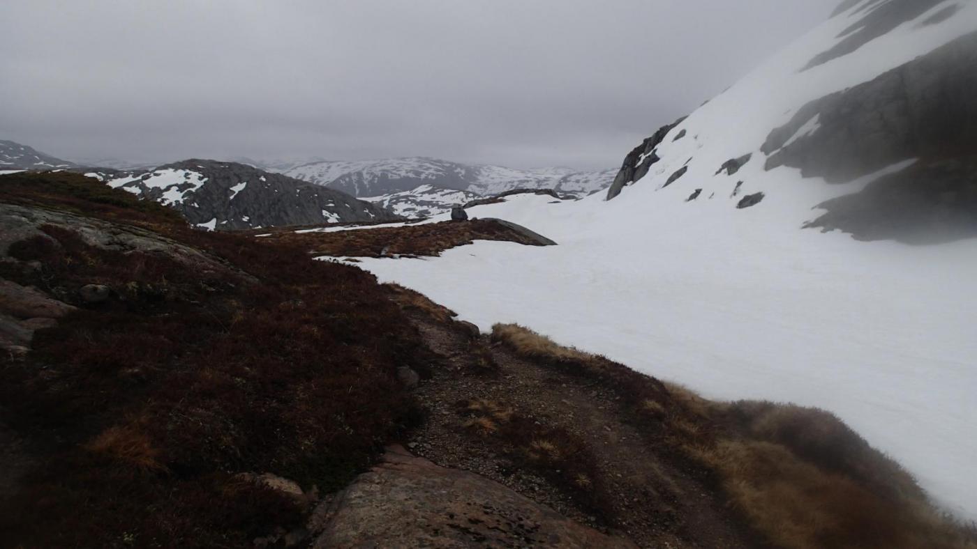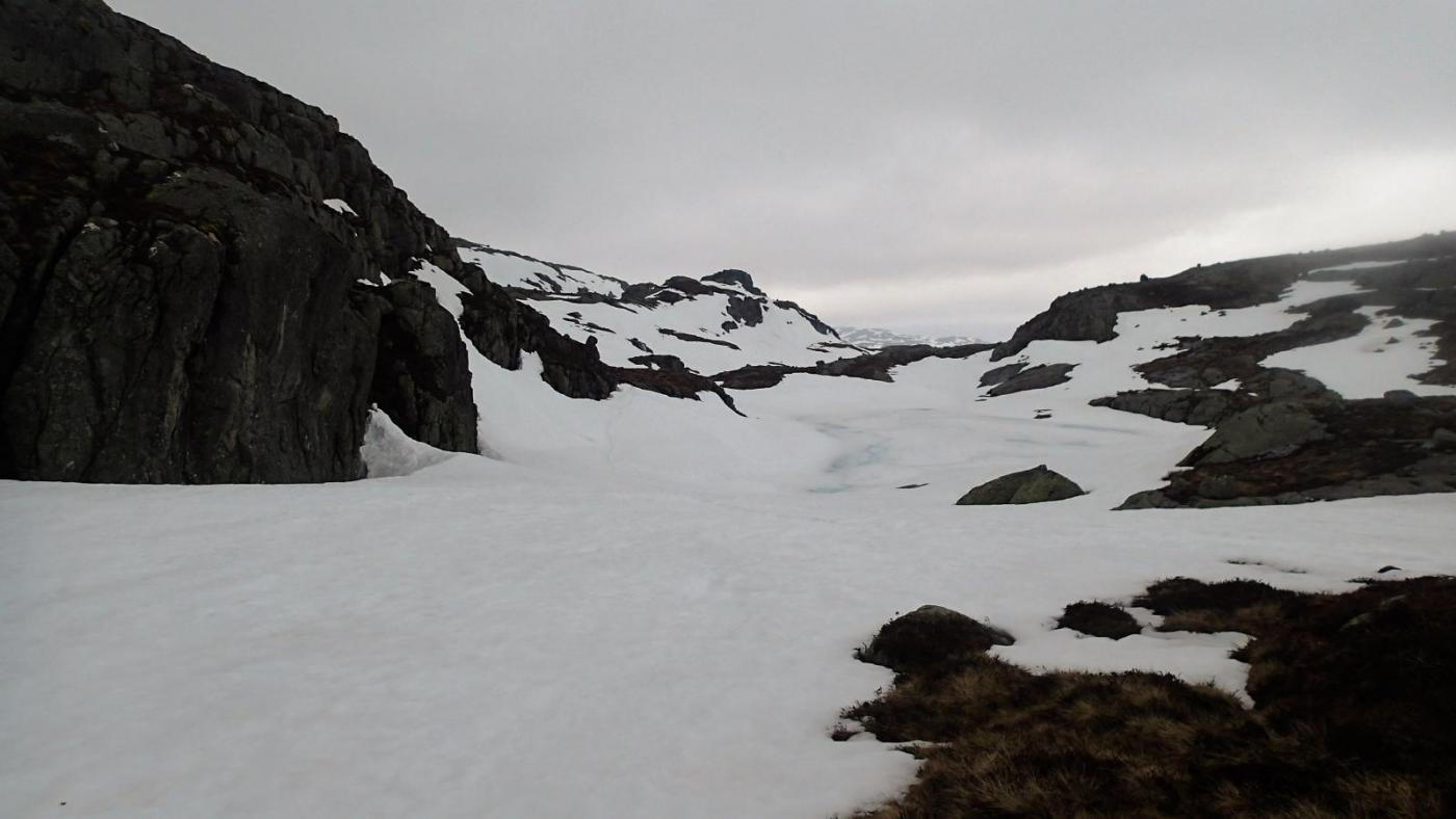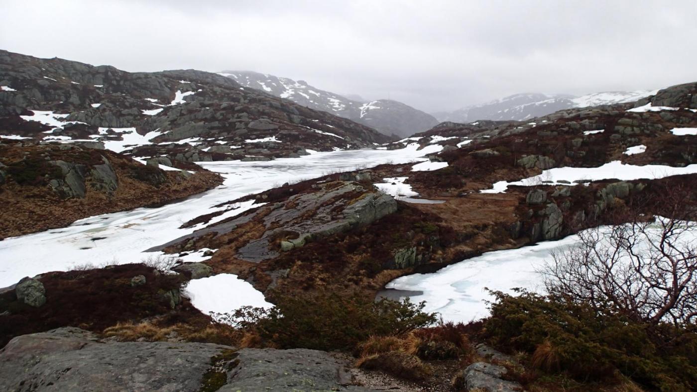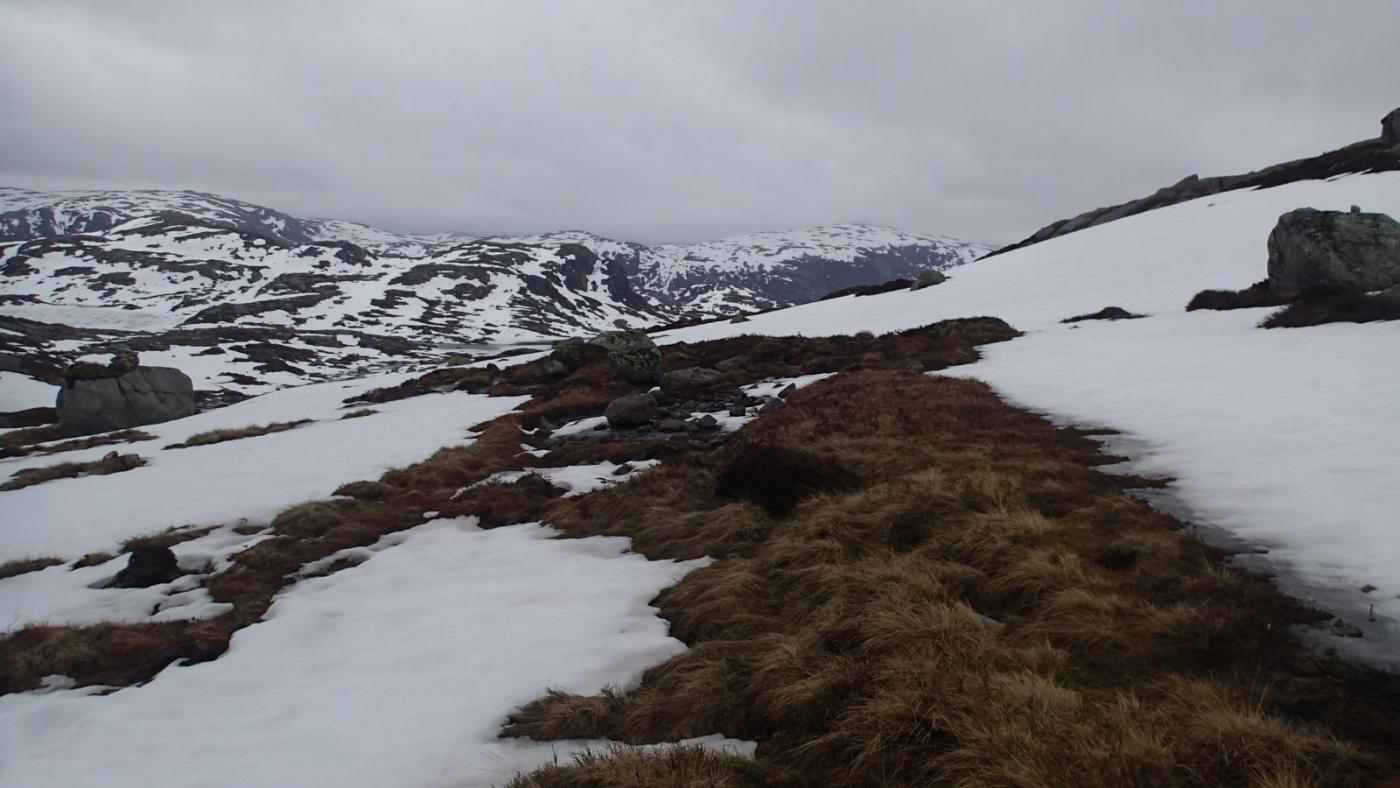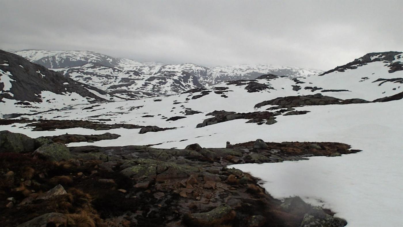 Planlegging er ikke helt min greie. I dag (lørdag) hadde jeg ingen andre planer enn at jeg skulle på tur. Bestyrerinnen tok av gårde grytidlig, og vil ikke være tilbake før neste uke. Det var med andre ord ingen grunn til hastverk. Likevel sto jeg opp før 8, var klar for tur i god tid før 9. Uten å ha bestemt hvor turen skulle gå. Egentlig var det verre – jeg gjennomgikk alternativene, og prøvde å ta hensyn til broderen og hva han eventuelt ville kunne være med på av tur på søndag. Og broderen er også i «syden» hele uka. Alzheimer på gang? Bynuten var et alternativ. Vådlandnuten ligger nå der og er over hundre meter høyere opp i lufta. Jeg tok mot Ålgård, og kunne vente med å velge. På veien oppover slo det meg at jeg faktisk kunne kjøre opp i Hunnedalen for å sjekke forholdene innover mot Blåfjellenden. At jeg ikke hadde tenkt på det før. Jeg hadde tenkt på en tur til Blåfjellenden, men da med overnatting. Værmeldingen satte en stopper for det. Jeg så ikke for meg å suse rundt i snøhaugen alene i kuling og regn… Lørdagsmorgen regnet det ikke. Det var lovet regn senere på dagen, men da jeg startet var det tørt. På vei oppover ble været ikke dårligere. Parkeringsplassen var skåltom. Ingen andre var så tidlig ute, og det var vel tvilsomt om det ville være andre ute i snøhaugen senere, utenom meg. Det er ikke helt vanlig å gå innover mot Blåfjellenden på beina, i mai. Første turen går normalt i månedsskiftet mai/juni. Jeg var forberedt på snø langt ned og mer oppover. Det lå noen små flekker og en liten fonn i Oleskaret. Helt som vanlig for første turen. Over skaret var det mer vinter enn vår. Jeg har gått her noen ganger under liknende forhold, og det er «bedre» å gå rundt snøfennene enn over de nederst. Jeg gikk noen omveier for å slippe snø. Det er ikke bare muligheter for skade ved gjennomtråkk, men også tyngre og gå i snø. Ett stykke før Fossebekken var det snø nesten over hele fjøla. Det var enkelt bare områder, men det ble bare mer og mer snø. Ikke uventet, og ganske normalt. Imidlertid så det ikke ut som det var store mengder snø. Jeg tror snøen vil for en stor del forsvinne med den meldte varmeperioden. Neste elg vil det antakelig være greie forhold innover. Fossebekken kan bli et hinder. Den var ikke større enn normalt ved mye regn – eller lite snøsmelting, og grei å komme over denne gangen. Jeg hadde ikke tenkt hvor langt inn jeg skulle gå. Det ble litt sånn: klarer du den så klarer du den også. Til halvveis inn mot hytta. Oppe i høyden var det skiføre, og regn. Regnet kom gradvis. Med vinden bakfra, kjente jeg ikke noe særlig til nedbøren på vei innover, men da jeg skulle ta noen bilder bakover, kunne jeg godt kjenne at det ville bli en sur tilbaketur. Nå ja, Gore-Tex er gode greier, og holder i hvert fall vannet ute – og svetten inne. Nedover er også greit. Det er vesentlig lettere å gå nedover fennene – rett over alt i bein linje. Og egne spor å gå i. Det gikk kvikt tilbake. Det ble tre timer godt og vel, på beina. Jeg fikk sjekket forholdene, og det blir overnattingstur neste uke. Jeg gleder meg alt.2 poeng