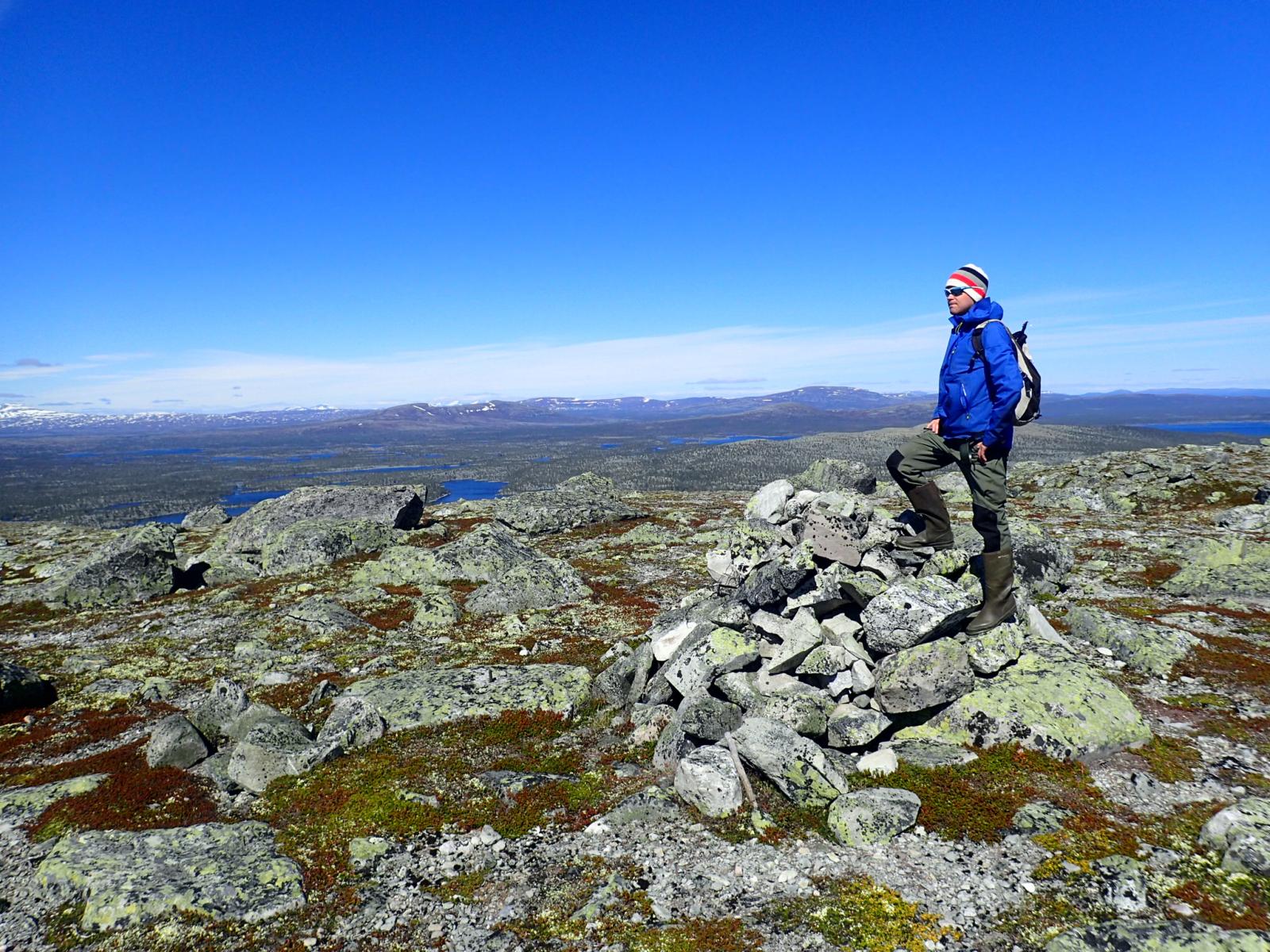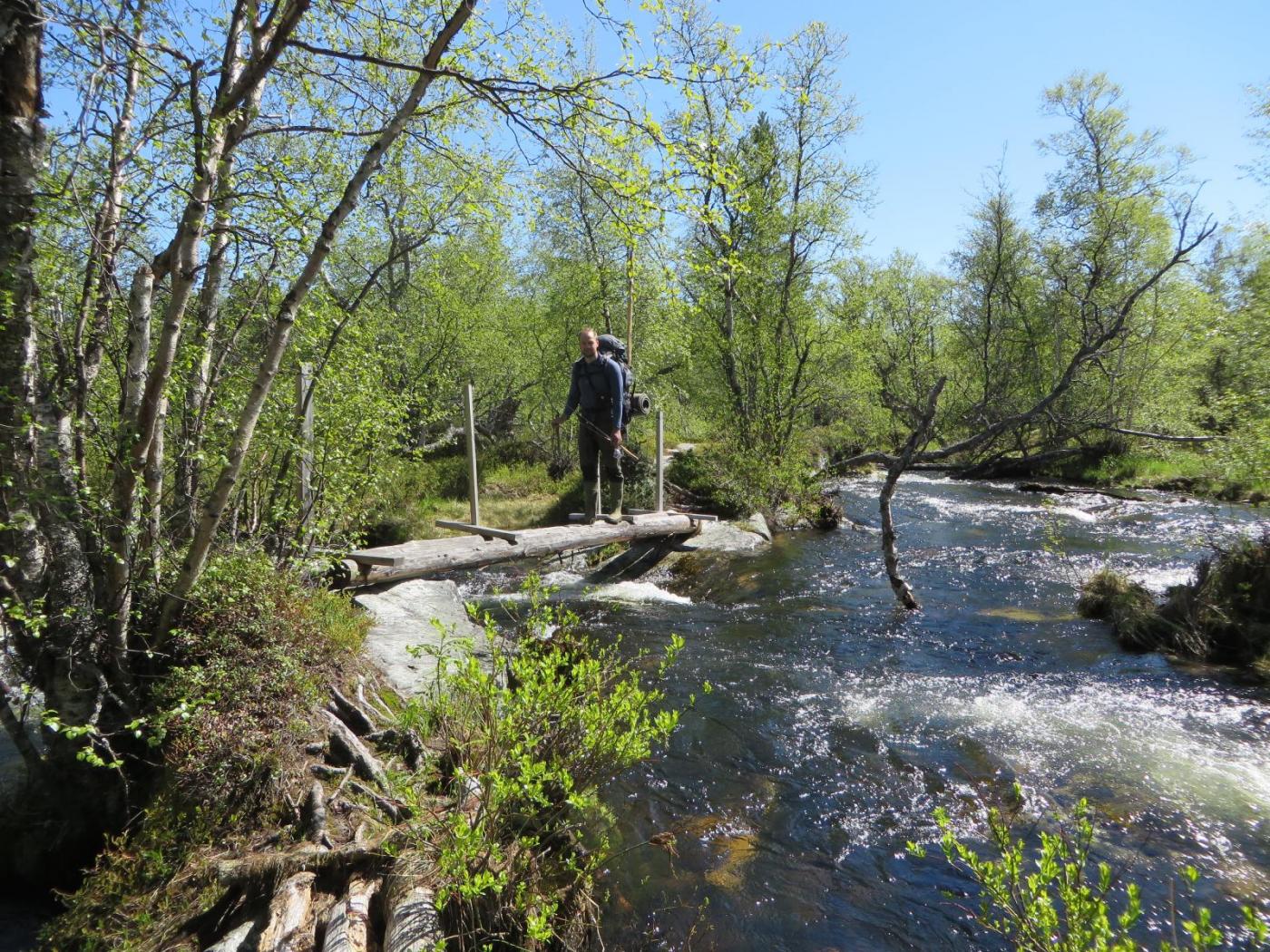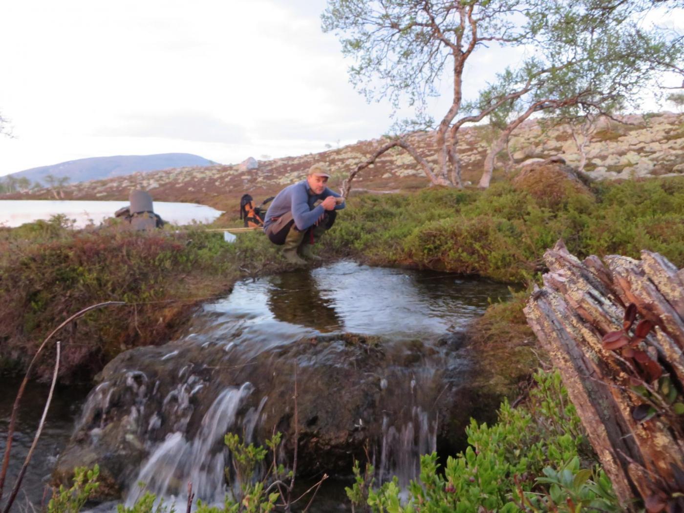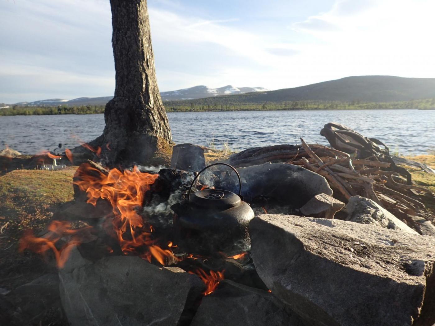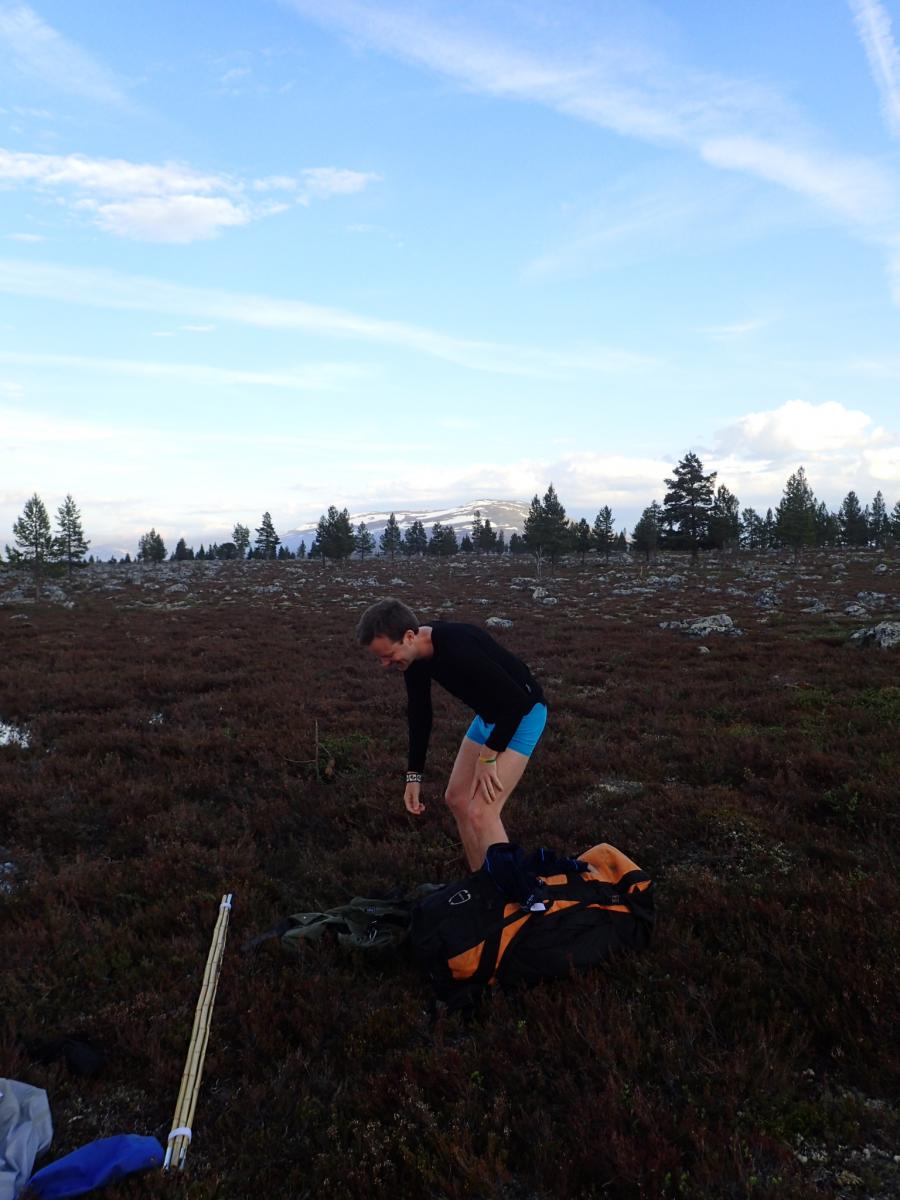 Fiskefadese i Femundsmarka 2.-5.juni 2016 Dette skulle egentlig ble en kort rapport om en kort tur, den endte opp med å bli "noe" lengre enn planlagt (slapp av, det er mest bilder). Håper du bærer over med det. Første helgen i juni var det igjen dags for tur. Igjen var det Femundsmarka som stod for tur. Og igjen var det min gode turkamerat Ola jeg skulle dra sammen med. I fjor var vi på en toukers ”ekspedisjon” i Øvre Anarjohka/Lemmenjoki, i år var en langhelg i Femundsmarka alt vi tok sjansen på å spørre våre bedre halvdeler om (man må være taktisk, særlig siden vi har planer om en ny ekspedisjon i løpet av et par år). Femundsmarka er etter hvert kjente trakter. Det var Olas sjette tur, og min tredje. Fra før har jeg ankommet terrenget rundt Grøtådalen fra Kjärringsjöen i nord-øst, fra Grötvalsjöen i sør-øst, denne gangen startet vi turen i vest, med båttaxi fra Femundshytten. Målet var Sætertjønna, som er et utmerket utgangspunkt for turer i Grøtådalen og Kratlland. Vi er blitt såpass samkjørte når vi er på tur at det meste går av seg selv. Planleggingen for utstyret vi skulle ta med foregikk omtrent slik: Ola: jeg tar med kaffe, kjele og mark. Du tar med stekepanne og smør. Mat ordner vi selv. Jeg: ok. Vi ankom Femundshytten på torsdag kveld, på omtrent samme tid som det lokale brannvesenet. Det var brutt ut flere skogbranner i traktene, og vi kunne se røyk fra flere plasser på begge sider av Femunden. Fikk høre at det ikke var i områdene vi hadde tenkt oss, så det la ingen demper på iveren etter å legge i vei ut i terrenget. En nydelig båttur over mot Storvika og startstedet ga en behagelig start på reisen. Turfeber. Fiskefeber. Bålfeber. Ola er KLAR for tur! Turen opp fra Storvika gikk lett som en plett. Stien fra Storvika opp til Røvoltjønnen er motbakke, men lettgått. Ute av skogen var det tid for å forlate stien og skrå sør-østover slik at vi skulle treffe på T-stien litt nedenfor Oasen. Flatt, lettgått og nydelig terreng. Kilometrene gikk unna, men vi tok oss tid til å nyte den vakre solnedgangen bak oss. Helt upåvirket av skogbrannene var vi heller ikke, lukten av ”bål” kjentes på flere kilometers avstand, og vi så røyksøyler på andre siden av Røvoltjønnene. Mannen som sverger til ullongs måtte krype til korset og bedrive stripping etter motbakkene opp fra Storvika. Elg i solnedgang. Til høyre sees røyk fra skogbrannene som startet tidligere på dagen. Meget lettgått terreng etter Røvoltjønnan. Vi krysset T-stien og kom inn på ”vår” sti som skulle føre oss inn til leirplassen ved Sætertjønna. Ved et av de mange små tjernene møtte vi på et av naturens små underverker. Midt i det som ser ut som en død steinrøys tøt det frem vann i store mengder. Det uten tvil største oppkommet av vann vi noen gang har sett. Det var som et boblebad med krystallklart kildevann. Slike små ting fascinerer, og det ble en velfortjent liten pause her. Ola nyter en kopp rykende ferskt vann. Den ikke spesielt behagelige vadingen over Grøtåa. Resten av vandringen gikk i bra tempo, vi var klare for å slå leir. Siste hinderet på veien var vading av Grøtåa. Jeg sverger til høye gummistøvler på alle slags turer, men selv ikke de trofaste Tretorn-kompisene ble høye nok her. Jeg kunne sagt det var forfriskende, men det var egentlig bare kaldt og vondt. Uansett, til Sætertjønna kom vi. Teltet ble slått opp, ved ble sanket (ganske mye nedfallskvist nå tidlig på sesongen). På forhånd hadde vi flotte tanker om hvor kult det hadde vært å tatt stor sprelsk Grøtåørret på bambusstang, så de to driiiitlange bambusstengene vi hadde med ble straks tatt i bruk. Bambusstengene fremstår i ettertid som en av disse ideene som er brilliant når man kommer på dem, men skikkelig dritt når det blir utprøvd i praksis. Ola tok en ”rugg” på noen få gram, ellers var det dødt. Det vil si, vi hilste på Børre Bever som plasket med halen i det vi slengte uti marken. En sterk konkurrent i matfatet. Dag to startet så vakkert. Tradisjon tro var jeg først ut av teltet, og benyttet det strålende været til litt morgenfiske. En flott stekepannefisk ble resultatet. Å ta fisk før turkompisen i det hele tatt har våknet er alltid godt, og optimismen var stigende. Ola ble naturligvis også ivrig når han skjønte fisken var ”på bett”, så vi dro raskt ut på formiddagsfiske. På de tjue første kastene tok jeg opp ytterligere to stekepannefisker, og jeg ila meg selv fiskestans, da jeg synes to fisker fra samme lille tjern er nok. Optimismen var skyhøy. ENDELIG skulle jeg ta mye fisk i Femundsmarka. Det jeg ikke visste var jeg ikke skulle ta en eneste fordømt fiskepinne resten av turen… Resultatet av en meget kort formiddagsøkt. Det siste jeg så til Femundsørretten. Turen gikk oppover Grøtådalen, før vi svingte mot Kratlland der storruggen, etter planen, skulle tas. Vi kastet og kastet. Mark, sluk, spinner. Kast etter kast etter kast. Ikke så mye som et napp. Ikke så mye som antydning til liv hverken i elv eller vann. Formiddagens optimisme ble til frustrasjon. Men humøret var ikke altfor dårlig. Fisket er bare krydder, turen i seg selv er tross alt viktigere. Når man sitter i solen med et deilig kaffebål foran seg har det egentlig ikke SÅ mye å si om man spiser fisk eller rett-i-koppen. Hvor kan vi dra og ikke ta fisk nå mon tro? Den ikke spesielt runde Rundtjønna. Her, av alle steder, traff vi på oppsynsmannen for to år siden. Dagen gikk over i kveld. Turen til Kratlland forble resultatløs, men denne karen gir seg ikke så lett. Jeg SKULLE ha fisk til kveldsmat. Flere små vann ble fisket, akkurat like resultatløs. Kaldt ble det og, med kald nordavind fra alle kanter. Når natten var på sitt mørkeste måtte jeg resignere og tusle tilbake til leir, og da satte jeg virkelig pris på at vi var to på tur. Ved teltet spraket det i furukvist, en alltid like trivelig turkompis hadde