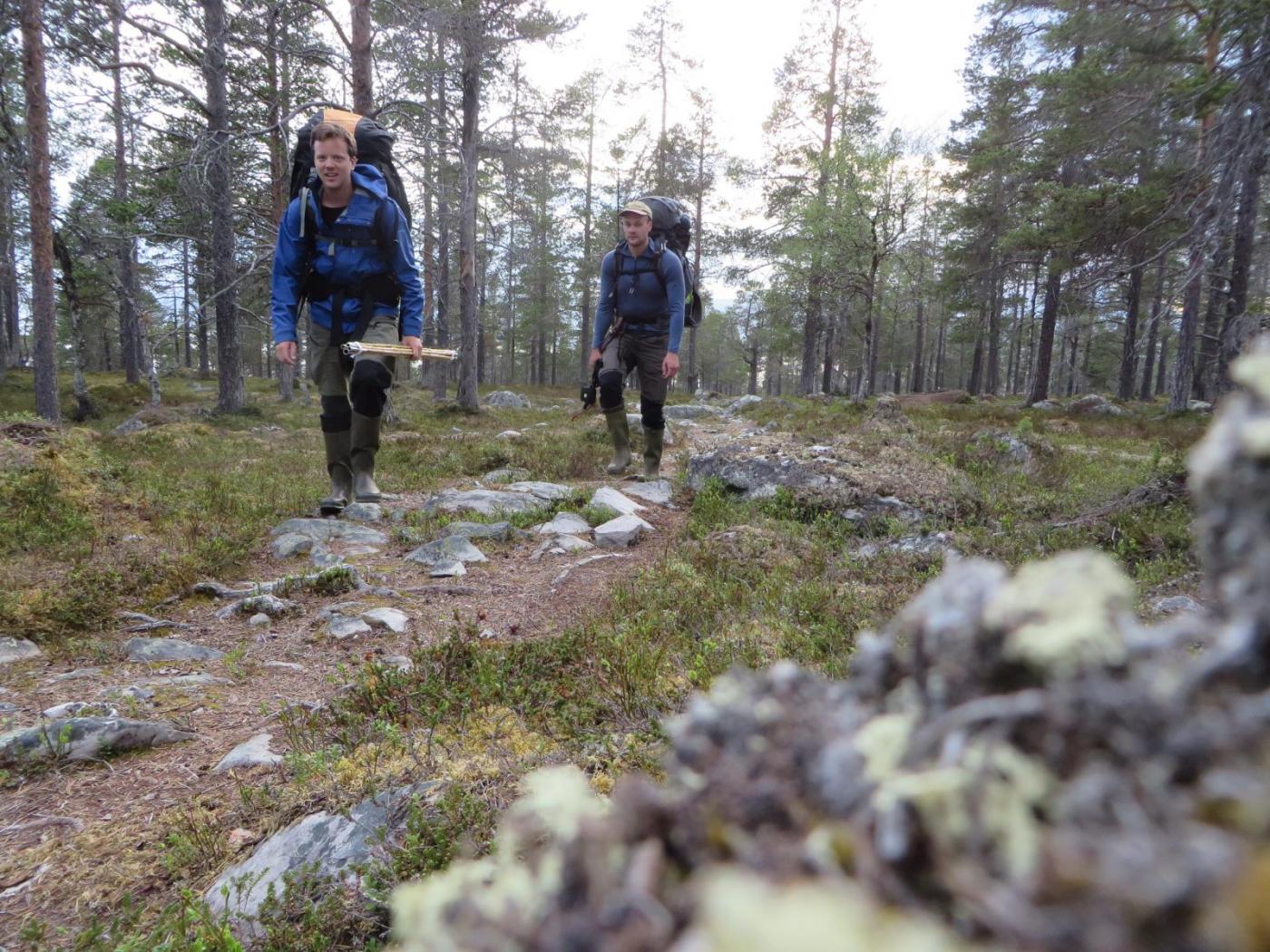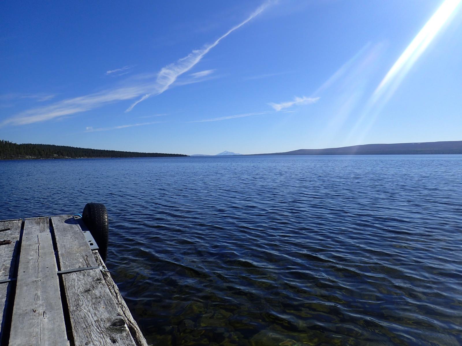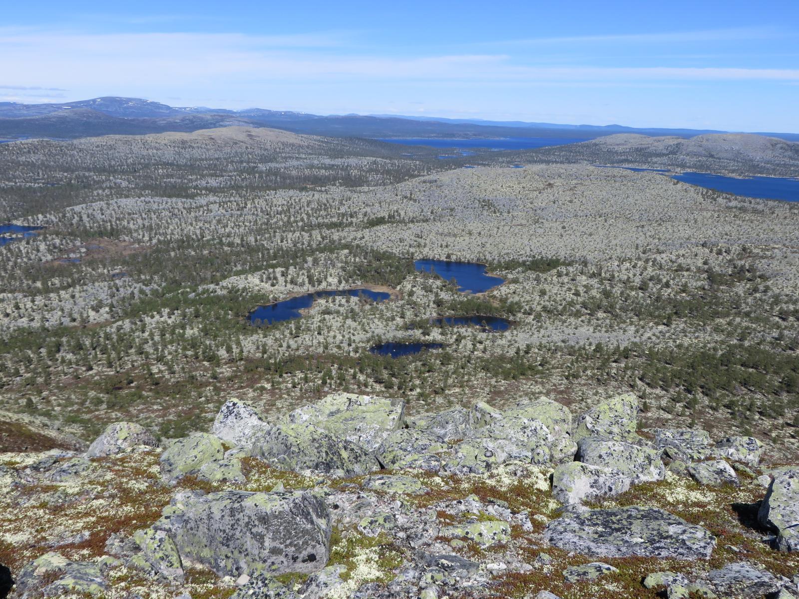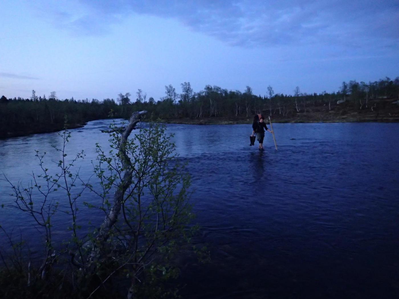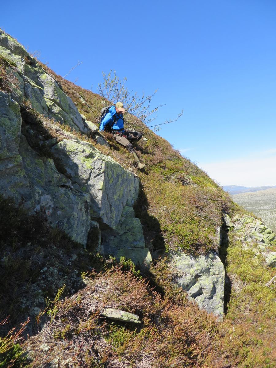 Fiskefadese i Femundsmarka 2.-5.juni 2016 Dette skulle egentlig ble en kort rapport om en kort tur, den endte opp med å bli "noe" lengre enn planlagt (slapp av, det er mest bilder). Håper du bærer over med det. Første helgen i juni var det igjen dags for tur. Igjen var det Femundsmarka som stod for tur. Og igjen var det min gode turkamerat Ola jeg skulle dra sammen med. I fjor var vi på en toukers ”ekspedisjon” i Øvre Anarjohka/Lemmenjoki, i år var en langhelg i Femundsmarka alt vi tok sjansen på å spørre våre bedre halvdeler om (man må være taktisk, særlig siden vi har planer om en ny ekspedisjon i løpet av et par år). Femundsmarka er etter hvert kjente trakter. Det var Olas sjette tur, og min tredje. Fra før har jeg ankommet terrenget rundt Grøtådalen fra Kjärringsjöen i nord-øst, fra Grötvalsjöen i sør-øst, denne gangen startet vi turen i vest, med båttaxi fra Femundshytten. Målet var Sætertjønna, som er et utmerket utgangspunkt for turer i Grøtådalen og Kratlland. Vi er blitt såpass samkjørte når vi er på tur at det meste går av seg selv. Planleggingen for utstyret vi skulle ta med foregikk omtrent slik: Ola: jeg tar med kaffe, kjele og mark. Du tar med stekepanne og smør. Mat ordner vi selv. Jeg: ok. Vi ankom Femundshytten på torsdag kveld, på omtrent samme tid som det lokale brannvesenet. Det var brutt ut flere skogbranner i traktene, og vi kunne se røyk fra flere plasser på begge sider av Femunden. Fikk høre at det ikke var i områdene vi hadde tenkt oss, så det la ingen demper på iveren etter å legge i vei ut i terrenget. En nydelig båttur over mot Storvika og startstedet ga en behagelig start på reisen. Turfeber. Fiskefeber. Bålfeber. Ola er KLAR for tur! Turen opp fra Storvika gikk lett som en plett. Stien fra Storvika opp til Røvoltjønnen er motbakke, men lettgått. Ute av skogen var det tid for å forlate stien og skrå sør-østover slik at vi skulle treffe på T-stien litt nedenfor Oasen. Flatt, lettgått og nydelig terreng. Kilometrene gikk unna, men vi tok oss tid til å nyte den vakre solnedgangen bak oss. Helt upåvirket av skogbrannene var vi heller ikke, lukten av ”bål” kjentes på flere kilometers avstand, og vi så røyksøyler på andre siden av Røvoltjønnene. Mannen som sverger til ullongs måtte krype til korset og bedrive stripping etter motbakkene opp fra Storvika. Elg i solnedgang. Til høyre sees røyk fra skogbrannene som startet tidligere på dagen. Meget lettgått terreng etter Røvoltjønnan. Vi krysset T-stien og kom inn på ”vår” sti som skulle føre oss inn til leirplassen ved Sætertjønna. Ved et av de mange små tjernene møtte vi på et av naturens små underverker. Midt i det som ser ut som en død steinrøys tøt det frem vann i store mengder. Det uten tvil største oppkommet av vann vi noen gang har sett. Det var som et boblebad med krystallklart kildevann. Slike små ting fascinerer, og det ble en velfortjent liten pause her. Ola nyter en kopp rykende ferskt vann. Den ikke spesielt behagelige vadingen over Grøtåa. Resten av vandringen gikk i bra tempo, vi var klare for å slå leir. Siste hinderet på veien var vading av Grøtåa. Jeg sverger til høye gummistøvler på alle slags turer, men selv ikke de trofaste Tretorn-kompisene ble høye nok her. Jeg kunne sagt det var forfriskende, men det var egentlig bare kaldt og vondt. Uansett, til Sætertjønna kom vi. Teltet ble slått opp, ved ble sanket (ganske mye nedfallskvist nå tidlig på sesongen). På forhånd hadde vi flotte tanker om hvor kult det hadde vært å tatt stor sprelsk Grøtåørret på bambusstang, så de to driiiitlange bambusstengene vi hadde med ble straks tatt i bruk. Bambusstengene fremstår i ettertid som en av disse ideene som er brilliant når man kommer på dem, men skikkelig dritt når det blir utprøvd i praksis. Ola tok en ”rugg” på noen få gram, ellers var det dødt. Det vil si, vi hilste på Børre Bever som plasket med halen i det vi slengte uti marken. En sterk konkurrent i matfatet. Dag to startet så vakkert. Tradisjon tro var jeg først ut av teltet, og benyttet det strålende været til litt morgenfiske. En flott stekepannefisk ble resultatet. Å ta fisk før turkompisen i det hele tatt har våknet er alltid godt, og optimismen var stigende. Ola ble naturligvis også ivrig når han skjønte fisken var ”på bett”, så vi dro raskt ut på formiddagsfiske. På de tjue første kastene tok jeg opp ytterligere to stekepannefisker, og jeg ila meg selv fiskestans, da jeg synes to fisker fra samme lille tjern er nok. Optimismen var skyhøy. ENDELIG skulle jeg ta mye fisk i Femundsmarka. Det jeg ikke visste var jeg ikke skulle ta en eneste fordømt fiskepinne resten av turen… Resultatet av en meget kort formiddagsøkt. Det siste jeg så til Femundsørretten. Turen gikk oppover Grøtådalen, før vi svingte mot Kratlland der storruggen, etter planen, skulle tas. Vi kastet og kastet. Mark, sluk, spinner. Kast etter kast etter kast. Ikke så mye som et napp. Ikke så mye som antydning til liv hverken i elv eller vann. Formiddagens optimisme ble til frustrasjon. Men humøret var ikke altfor dårlig. Fisket er bare krydder, turen i seg selv er tross alt viktigere. Når man sitter i solen med et deilig kaffebål foran seg har det egentlig ikke SÅ mye å si om man spiser fisk eller rett-i-koppen. Hvor kan vi dra og ikke ta fisk nå mon tro? Den ikke spesielt runde Rundtjønna. Her, av alle steder, traff vi på oppsynsmannen for to år siden. Dagen gikk over i kveld. Turen til Kratlland forble resultatløs, men denne karen gir seg ikke så lett. Jeg SKULLE ha fisk til kveldsmat. Flere små vann ble fisket, akkurat like resultatløs. Kaldt ble det og, med kald nordavind fra alle kanter. Når natten var på sitt mørkeste måtte jeg resignere og tusle tilbake til leir, og da satte jeg virkelig pris på at vi var to på tur. Ved teltet spraket det i furukvist, en alltid like trivelig turkompis hadde