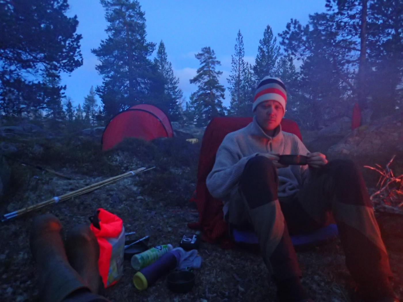 Eg går endel alene og har som oftest et konkret mål med turen. Enten det er et område, vann eller en topp som skal nåes, eller en kombinasjon av flere delmål. På slike turer går det meste av tida med til å forflytte seg og finne en fin leirplass før teltet skal opp igjen til kvelden. Tida som er til overs før øynene slås av brukes til å lage mat (god mat...), smelte snø (vinterstid), fiske, fyre bål, studere kartet og finpusse ruta for neste dag, finne navn på vann og topper rundt seg fra kartet, reparere småting som kan ha blitt ødelagt i løpet av dagen og best av alt, lese en god bok eller et blad. Det er til og med fint å bare ligge stille å tenke, helst med døra åpen og utsikt til horisonten. Velg teltplass med omhu, slaraffenlivet der er gull!!1 poeng