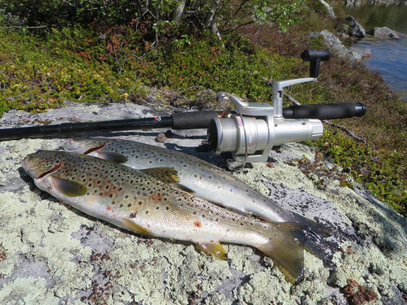 Endelig sommer og det var klart for årets første fjellfisketur. For en ukes tid siden dukket det opp en fridag som ble satt av til tur. Ny snelle ble klargjort, sluker ble kjøpt inn og jeg kunne kjenne fiskefeberen var godt på vei. Jeg hadde hørt om et vann som skulle huse stor fisk, de historiene derfra var nesten ikke til å tro. Her snakket vi kilos, minst. Klok av skade reduserte jeg forventingene noe, slike historier har en tendens til å være en smule overdreven. Vekten på fisken rundes alltid oppover. Et fenomen jeg er godt kjent med selv, uten at det trenger å kommenteres noe mer. Dagen før avgang sendte jeg en melding til Jarle og spurte om han ville være med. Han sleit med ryggen og hadde en del arbeid som skulle bli gjort i heimen. Denne gangen må jeg stå over, var den klare beskjeden fra han. Da fikk jeg heller lure storfisken aleine. Endelig var det klart for årets første fjellfisketur. Rett etter jobb satte jeg kursen mot startpunktet for turen, men først ble det en liten stopp innom Jarle. Jeg hadde fortsatt håp om å få overtalt han til å bli med, han bruker ikke å være vanskelig å la seg overtale til en tur. Planen gikk som smurt. Alt jeg gjorde var å stille han noen spørsmål som, hvor stor er fisken der oppe? Hvor er det best å slå leir? Etter ca to minutt var talen klar. "Nei faen ej hiv me rundt og blir med" Etter en halvtime hadde han pakket en sekk med sovepose, fiskeutstyr og smertestillende for ryggen. Da var det bare å komme i gang. Etter en time eller to med forholdsvis bratt stigning passerte vi den siste kneika før vannet. Vi var en smule bekymret for at isen fortsatt ikke hadde gått, men joda, her var det isfritt. Det tok ikke lang tid før det første kastet ble tatt. Det var en del vaking på vannet, men ørreten var ikke akkurat bitevillig. Bortsett fra en liten ørret på ca 100 gram som undertegnede landet. Da ledet jeg hvert fall 1-0. Vi holdt det gående til langt ut på natta før det ble en matbit og en kaffekopp. Strategien for neste dag ble lagt, den var enkel. Bare fiske mer, mer og mer. Her gjaldt det å komme seg opp til morgenbette, var den siste beskjeden fra Jarle før jeg lukket teltet. Han la seg til under åpen himmel på et lite nes ca 100 meter fra teltet mitt. Nå var det bare å få noen timer søvn før neste fiskeøkt skulle begynne. Sekken ferdig pakket med smertestillende og fiskeutstyr. Jarle i aksjon. Det var lite fisk å få denne kvelden. Det ble frysetørket til middag denne kvelden. Myrull i solnedgang. Neste morgen våknet jeg av noe tråkking på utsiden av teltet. Med smale øyne kikket jeg ut, og der stod Jarle med et lite glis. Ved siden av han lå det to flotte ørreter på rundt halvkiloen. Mens jeg lå å purka i teltet hadde han stått opp tidlig, og det var tydeligvis lurt. Her var det bare å komme seg opp. I det jeg skulle knyte på skoa hører jeg et rop. Ca to meter fra teltet stod Jarle med noe som kunne se ut som en diger fisk på kroken. Ørreten kjempet desperat for livet, og lot bremsen virkelig få kjørt seg. Etter hvert nærmet den seg land. Håv hadde vi ikke med, her kunne snøre ryke når som helst. For et beist! Iført bokser og fjellsko sprintet jeg ned mot vannkanten, og fikk satt inn et godt grep rundt fisken. Med en puls på ca 200 klarte jeg å lempe fisken på land, og for en fisk. Et slikt prakteksemplar av en ørret ser man ikke ofte i disse traktene. Vekten viste 1,9 kg. Ny rekord for Jarle og, en solid ledelse i fiskekonkurransen. Det var bare å gratulere. Dette ga oss virkelig blod på tann, og haspelutstyret ble brukt aktivt utover dagen. Men et tydelig mønster hadde pekt seg ut. Jarle dro opp fisk på fisk, mens jeg stod der som en annen nisse uten så mye som et napp. Han dro opp flere på blant annet 0,7 og 0,8 kg. Jeg fikk stort sett æren av å dokumentere den ene fisken etter den andre med speilrefleksen. Etter hvert måtte vi bare gi oss, det var nok fisk nå. Legg forresten til at jeg sier vi. Jeg kom plutselig på (helt tilfeldig) at slike turer ikke handler om hvem som får fisk, men at noen får. Dette var et samarbeid og jeg var ikke mer beskjeden enn at nå kunne jeg si at det var vi som fikk fisken, ikke deg, ikke meg, men vi. Hører du Jarle? VIIIIIIIIII!!! Sånn ser en ørret på 1,9 kg ut. 1,9 kg, 0,5 kg og 0,6 kg. Da er det fortjent med karbonade til frokost. Det ble dårlig med fisk på denne karen. Et stort vak er nettop observert og storfiskeren lukter blod. Å jaggu tok den også. 0,8 kg. Kampen er i gang. 0,7 kg. Sekken var faktisk tyngre på veg ned, ikke ofte det. Dette ble virkelig en bra start på sommersesongen, og det er bare å håpe at dette fortsetter utover de neste månedene. Vannet vi besøkte innfridde virkelig og blir garantert besøkt flere ganger. Ørret på 1,9 kg er nesten for mye av det gode, og det er bare å gratulere Jarle med fangsten. Eller gratulere til oss mente jeg. Nå er standaren satt, måtte det bare fortsette. Se hele artikkelen5 poeng