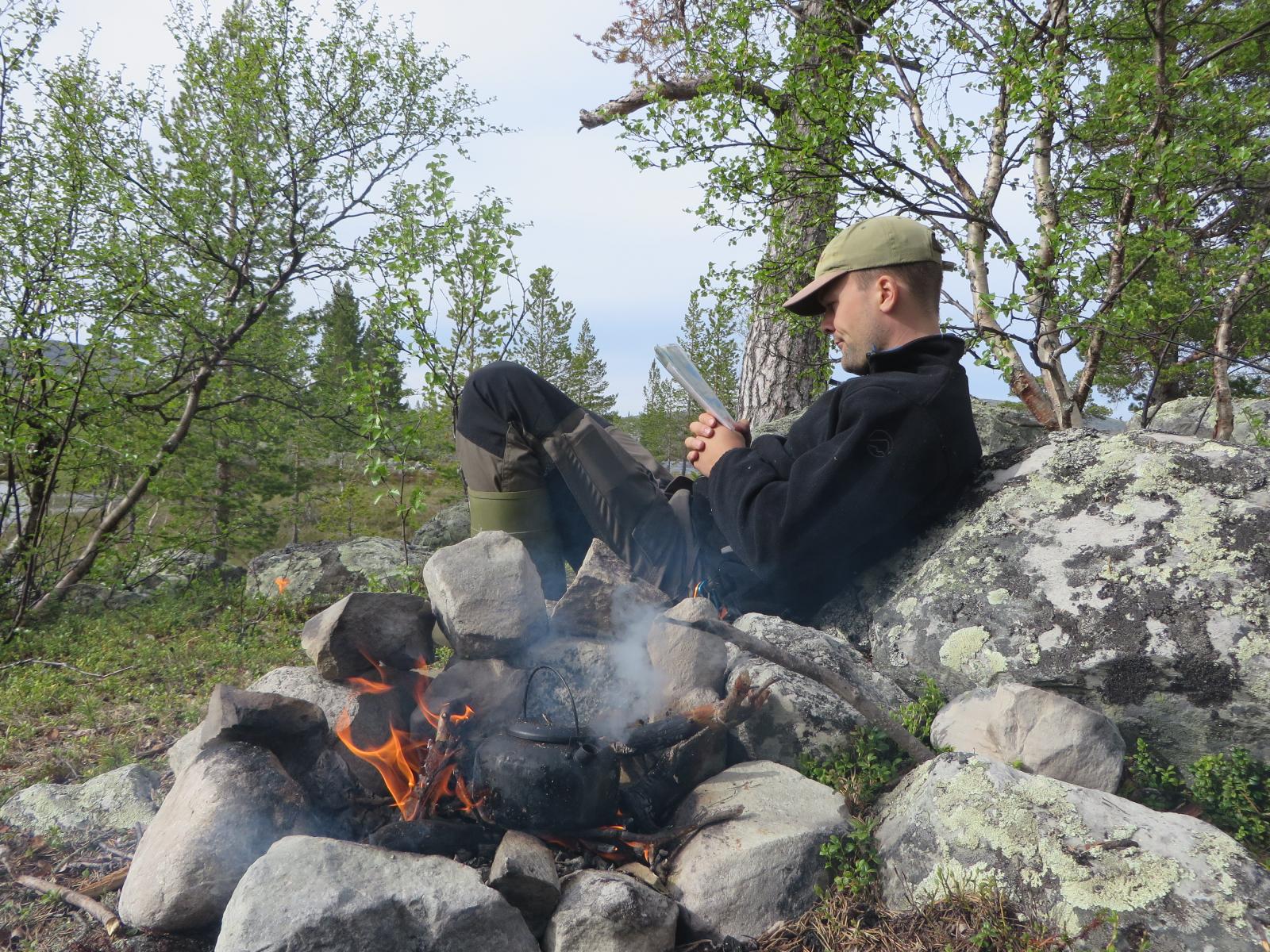 De siste årene har jeg vært svært mye på tur alene. Det er forskjellige grunner til det, men med en jobb som krever kontinuerlig og tildels intim kontakt med masse mennesker, og med unger hengende i buksebeina hele tiden, er tur min form for alenetid. Og meditasjon. Telt har jeg ikke brukt så mye senere tid da jeg har en liten og svært enkel koie som ofte er målet for turene. Den kan sammenlignes med et fastmontert telt/lavvo. Ofte blir jeg spurt om hva jeg gjør på disse turene, og svaret er enkelt. For det første er det en virkelig god følelse å bare være bokstavelig talt midt i skauen. Lytte, lukte, se. En følelse som kanskje ikke er så lett å kjenne igjen på første tur, men den vil komme. For de fleste. Det sies at det er en kunst å gjøre ingenting. Men på tur er det lett og samtidig givende. Så brukes mye tid på pusling. Pusle litt med ved, med mat, med bål, med bikkja. Pusling er undervurdert spør du meg. I tillegg har jeg nesten alltid med meg en kikkert og en fiskestang. Kikke litt etter fugler, ta noen kast med stanga. Eller drite i fisken og ta et bad i stedet. Og dermed har døgnet nesten ikke nok timer så de planlagte små turene i nærområdet blir ofte utsatt. Nei, gi meg et fint terreng. Det er alt jeg behøver.5 poeng