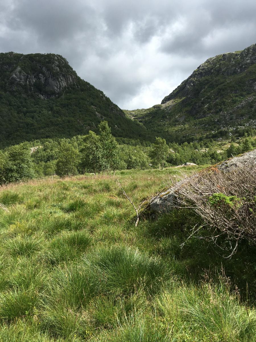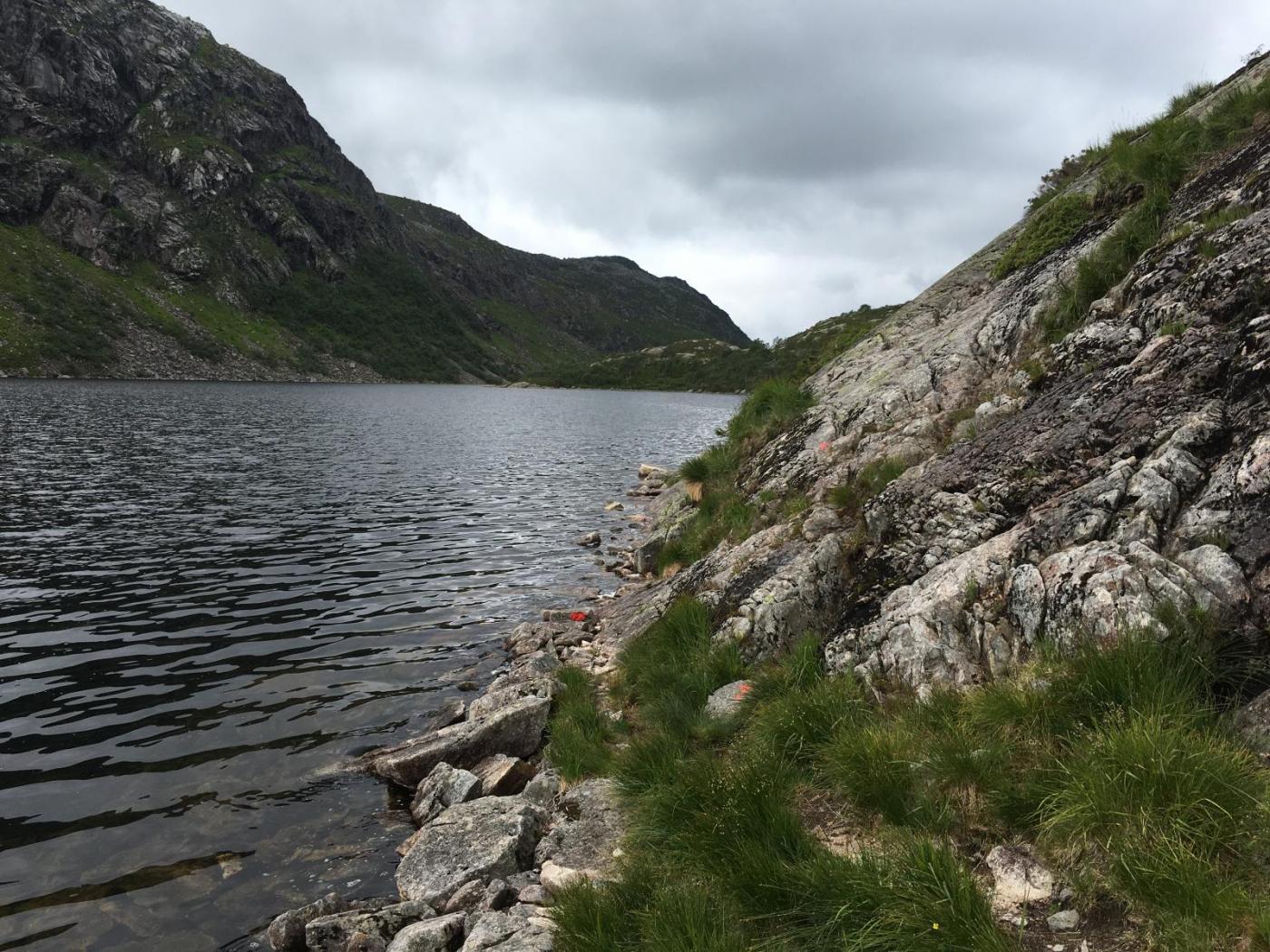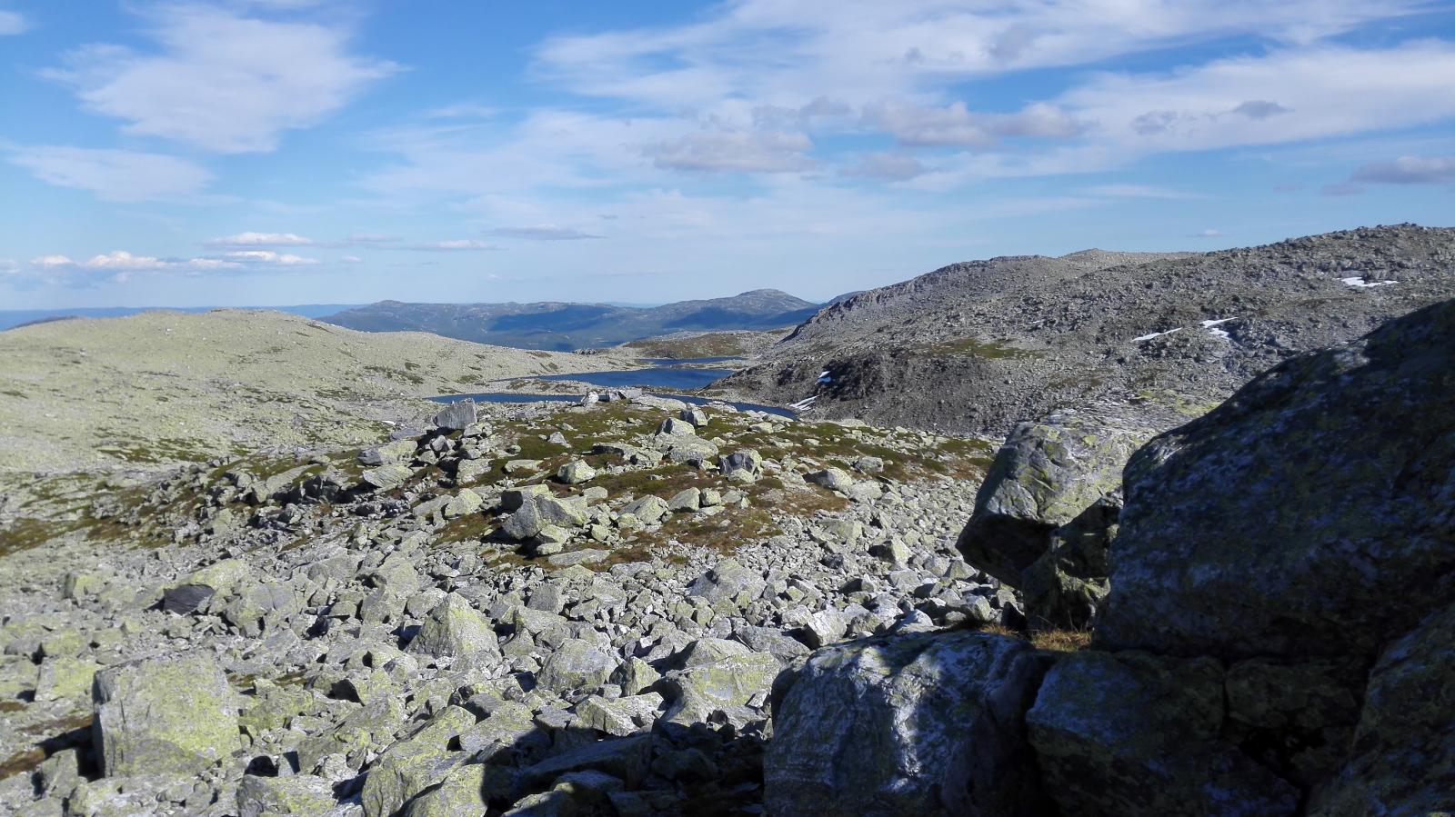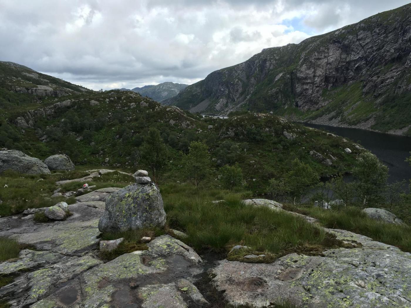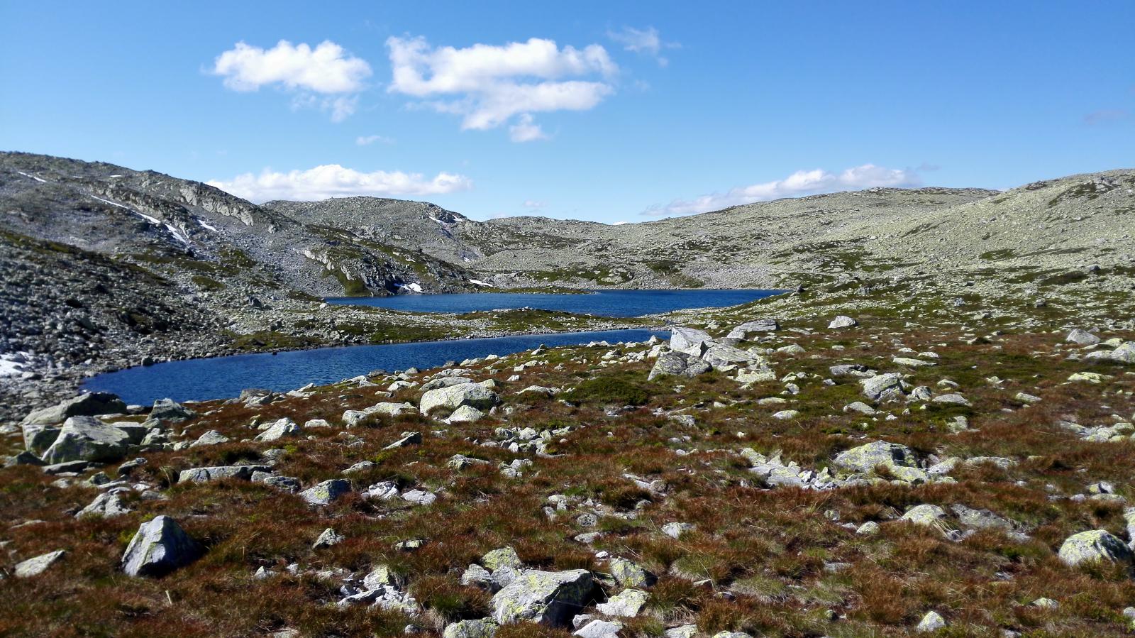 har jo lenge hatt lyst å prøve meg med telt på fjellet. Ingen venner her i byen som deler ønsket. Vi begynner å komme i en alder (over 50!) der en ønsker mer bedagelige aktiviteter? ville ikke la det stoppe meg...Hadde nesten alt av utstyr fra før. Noe rktignok veldig gammelt (norrønasekk 25 år-tung men mye bedre å bære enn bergans helium som jeg ellers bruker), gassbrenner og kjele som var julegave for 15? År siden ifølge lapp på eska, ubrukt siden termos er like greit på dags- og hytte til hytteturer, sovepose i dun ca 7år men lite brukt, oppblåsbart exped synmat ul 9xl bare 2 år og kjøpt for ridetur med lavvo overnatting i rondane. manglet bare telt.. Og fant fjellheimen 2 camp superlight på outlet hos helsport så da hadde jeg alt og ingen unnskyldning lengre. sjekket brenner og telt hjemme før jeg skulle dra, og kjøpte turmat hos dnt. Igår var bra værmelding så dro avgårde. Ansvar for hester i helgen så måtte bli én overnatting så jeg kunne møkke etc. Sen avreise igår, men hvor... Ifølge ut.no turbeskrivelser fantes det fine teltplasser mot kvitlen så bestemte meg for det. Hadde jo da dnt hytte (og folk) i området om det er noe. Har alltid hatt halvdårlig balanse så greit med merket sti om en skulle snuble (er kke telefondekning). alt gkk supert bortsett fra at dnt beskrivelsen sier 3 timer og det var feil... Mer 4-4.5... Og terrenget var mest sten og myr og bratt opp og ned så fant ngen teltplass før nesten ved hytta. Så turen ble for lang ift at sekken var ganske tung. Lå lenge våken og gruetmeg til hjemturen.. Men sov som en steinnår jeg først sovnet. Noen regndråper på morgenkvisten - så fikk tenkt litt hvordan jeg gjør i forhold til det. Har jo stort fortelt, hadde lagt all bagasje inn der, men turte ikke fyre gassbrenner der. alle klær (og sko) var også fuktige, hvordan får man tørket på fjellet? La ulltrøye på sekk i forteltet og noen klær inne men alt var fuktig om morgenen selv om det virket som lite kondens i teltet (god lufting). Hadde kke fått spent opp teltet godt nok i fotenden så kun der var det litt gjennmslag. Først bilder fra fotturen. Mye Stein og bratte Bakker og myr. Legg merke til t merking i vannet. Jeg valgte den i forhold til å klyve opp berget..2 poeng
