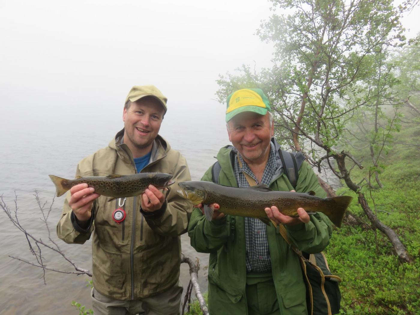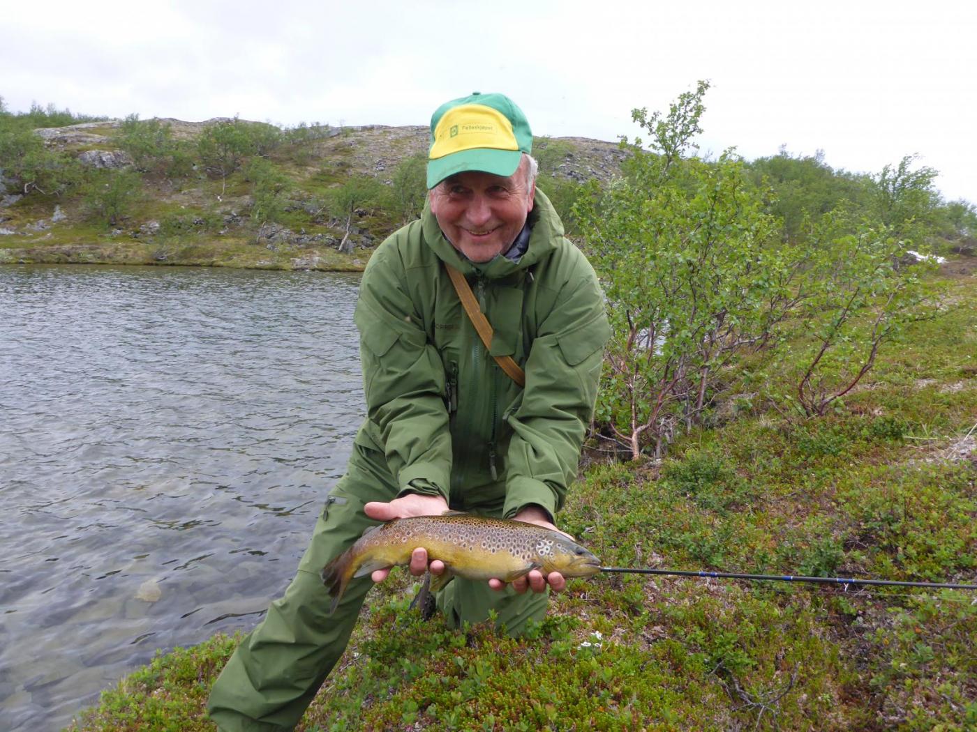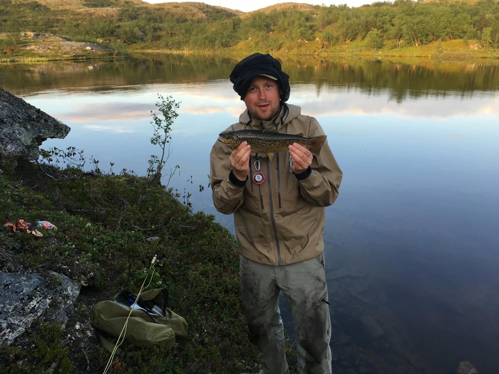 Det var tid for guttetur med 70 års jubilanten i sentrum. Sekkene inneholdt diverse godsaker, men et par fiskemåltider var også nøye planlagt. Ble plukket opp på flyplass og fraktet ut til startpunkt. Etter en time og femten minutter, i sol, lettskyet og litt vind, etablerte vi basecam. Planen var å ligge hele uka på samme sted og ta turer til vann i nærheten. Vi forventet egentlig ikke mye gåing. Håpet var at vannene rundt leiren skulle levere. Dag en går vi til nærmeste vann som i fjor viste frem de største fiskene. På veien ned blir jeg og pappa ventende et par minutter ved en pytt. Den avslører et pent vak. Jeg og bror prøvde her i fjor, men kjente ikke fisk. Jeg blir derfor med bror 2 ned til høyre siden av det store vannet. Første kastet mister jeg en 5hgs på blank wibrax og småfisken vaker inne ved land. En god start egentlig. Men jeg har glemt noe viktig og må ta turen opp igjen i leir. Heldigvis bare sju minutter å gå. På veien stopper jeg opp ved pytten. Pappa står med bøyd stang og bror er i hundre. Han tar persen din, runger mellom fjellsidene. I alle dager. Bror 2 tilkalles og vi bivåner slutten av landingen. Han med kamera, jeg i sjokk. For en fisk! Jubilanten lander en ørrethann på 3730 gr! Ny pers med over 2 kg. Og ny familierekord. Turen er reddet og for en start. På det tredje kastet hans. Mens vi sløyer fisk lander han likegodt en 9 hg`s som får friheten tilbake. Alle fire slenger seg ned lyngen og drar fram flytende godsaker. Fisken er latterlig rød i kjøttet, full av marflo. Hva skal man si. Det blir fiskesuppe av halestykkene. De store sidene tilsettes gravemix og legges kaldt i tre dager. Dag to våkner vi til overskyet vær, men ikke noe regn å snakke om. I ei vik i leirvannet slenger pappa ut mens noen gjør sitt fornødne. Resultatet blir en kilos ørret i flott kondisjon. Den gjenutsettes, det har han aldri vært med på før! En rolig marsj bringer oss deretter til enden av en rekke med fire mindre vann. Et par nye, og to kjente fra i fjor. Ganske raskt debuterer jeg med fisk. Snaut 7 hg. Pappa setter på ei god gammal stingsild og tar selvfølgelig en på 1,2 kg. Rødfargen er intens på fiskene i dette vannet. Det blir landet flere mindre fisk, før bror nede i enden lurer en ørret på nesten 1,8kg. Den går også tilbake. De tre andre vannene varierer i fangst, men noe særlig mer er ikke verdt å nevne. Tredje dagen forløper roligere. Kraftfrokost før det denges bly hist og her før middagen står for tur. Et skikkelig godt fiskemåltid med poteter (for enkelte), rømme, løk, hvitløk og råvarer krydret med skjærgårdskrydder. Himmelsk. På kvelden tar jeg og bror 2 turen ned for litt fluefiske. Vinden har stilnet så det bør skje noe på overflaten. Et par vak åpenbarer seg umiddelbart så vi finner hver vår strategiske plass. Min første veier 865 gr på streaking. Er ikke ferdig med sløying før en ny fisk viser seg innenfor kastehold. Den tar også, men veier bare snaut 6 hg. Uansett fin matfisk. Bror 2 lurer en på 7 hg før kvelden er omme, men vi er borti flere. Uka forløper stort sett som de første dagene. Vi får bra med fisk. Fisk rundt en kilo landes hver dag, men ingen flere store viser seg. Vannene ligger tett og vi er innom 26 stykker totalt i løpet av turen. Ikke alle gir fisk, men det er noe med å ha vært innom. Det er befriende å være på fjellet og vi koser oss skikkelig. Et av turens høydepunkter er da gravfisken er ferdig. Kvaliteten på råvaren er utsøkt og vi treffer bra med mengde krydder. Dessverre har vi noe uoppgjort med en mink i området, så det ble ikke noe gravet ørret med hjem. En fantastisk tur i godt selskap.1 poeng