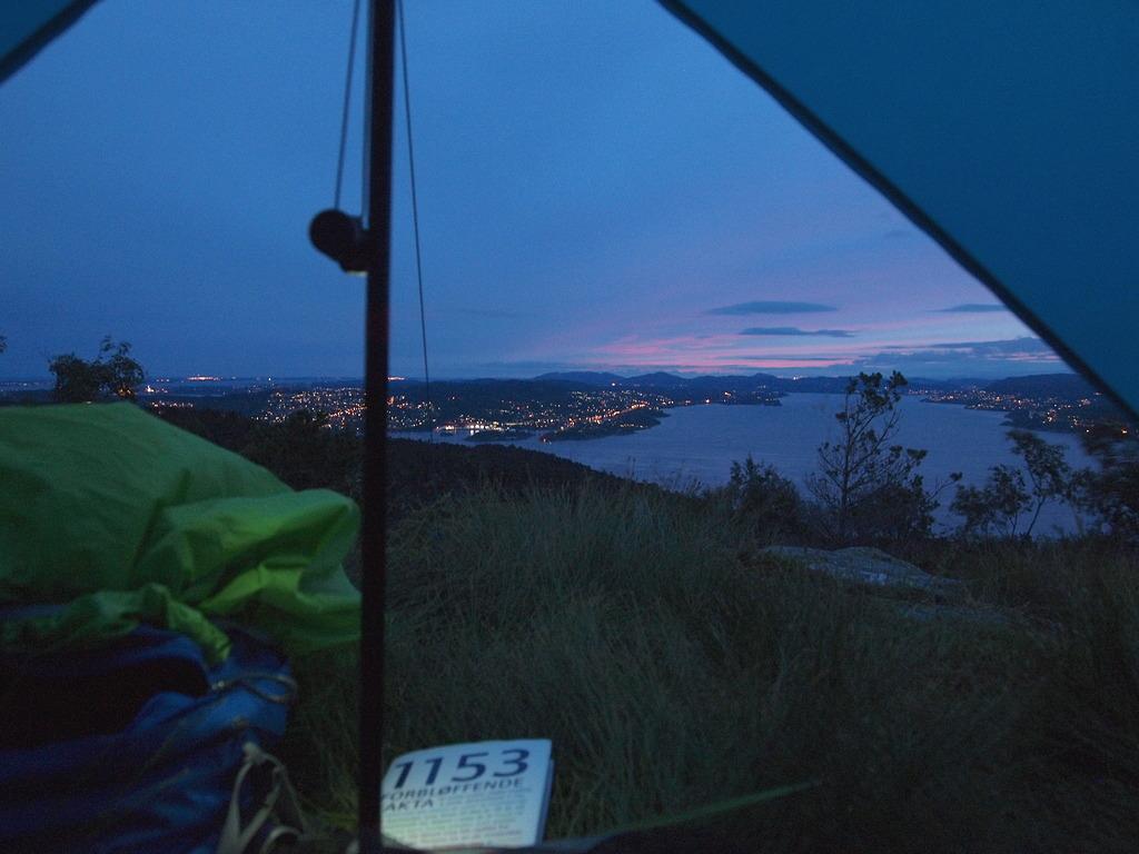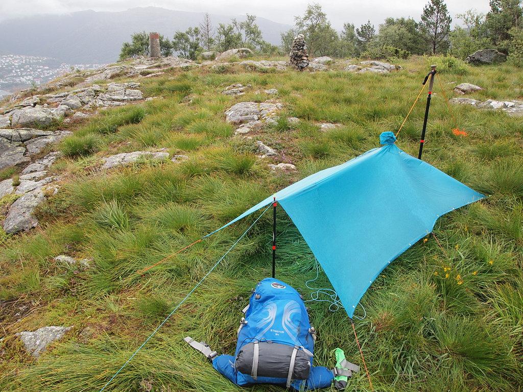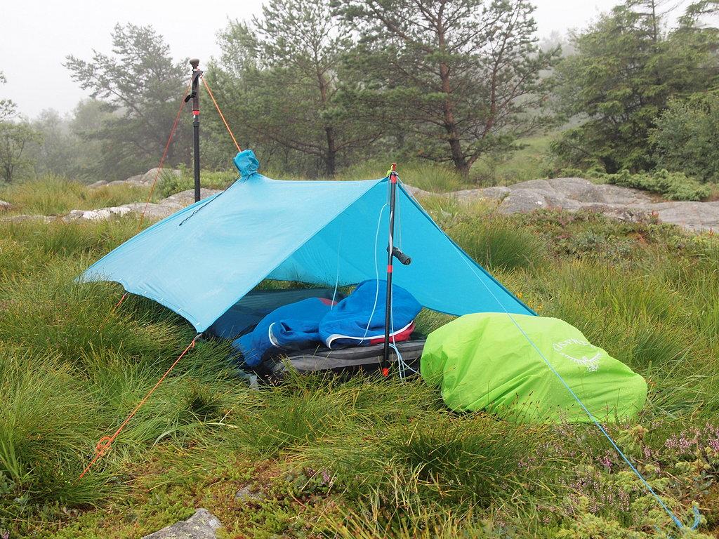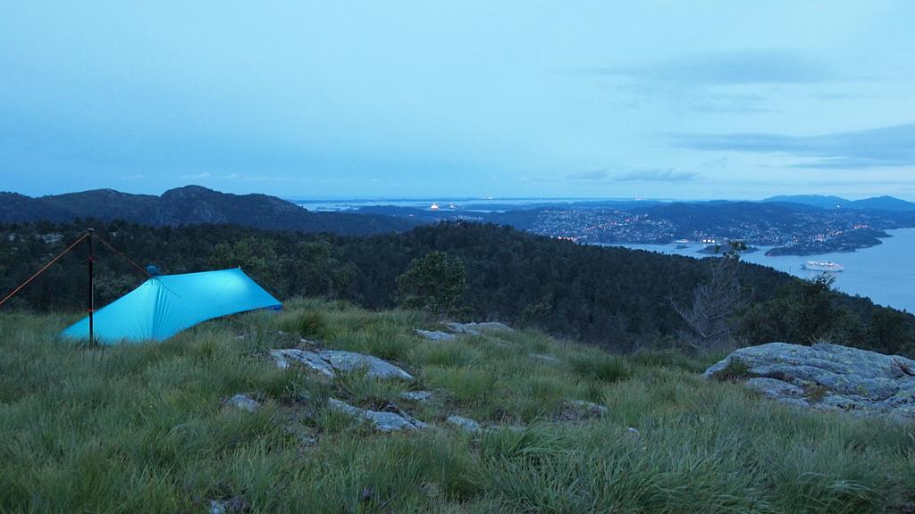 Etter å først ha tatt en blåbærplukketur etter jobb i går, bestemte jeg meg ila kvelden for å utnytte regnværet som var meldt til natten. Man er da ikke redd for å bli våt! Saken er at jeg aldri har overnattet under PonchoTarpen min, og har dermed ikke førstehånds kunnskap om den virkelig kan være et godt ly når det faktisk blir vind og regn - og akkurat det er jo greit å få klarlagt under trygge forhold. Nok en gang bar det oppover Damsgårdsfjellet da solnedgangen nærmet seg, og jeg bestemte meg for å sette opp tarpen nær toppen. Jeg ønsket nemlig ikke å være i særlig le for vinden (og egentlig var det lite vind å snakke om da jeg kom dit), det ville jo ødelegge litt av formålet. Overmodig som vanlig... Satte TarpPonchoen opp med "baken" i sør-sørøstlig retning, siden yr meldte at det var der vind og regn skulle komme fra. Synes fortsatt det tar litt tid å sette opp, men det gikk greit - her er en blå tarp i blåtimen. Etter en kveldsmat med litt ost og rødvin, krøp jeg på plass i soveposen innunder tarpen og bladde litt i en bok, mens nattemørket langsomt fortrengte lyset: Rundt halvtimen etter det bildet ble tatt, begynte det å blåse litt mer og litt forsiktig tromming fra regnet begynte. Jeg merket meg at vinden kom mer rett fra sør enn jeg ventet, så den traff TarpPonchoen bittelitt skrått. Vinden og regnet økte etterhvert, og det ble myyye lyd - og jeg kom på at jeg hadde glemt ørepropper for å få sove i trommende, blafrende og til og med brummende tarper. En lærdom som glemmes igjen og igjen. Men selv om jeg slet med å sovne, kunne jeg fornøyd konstatere at det ikke kom vann inn, og at alle forsøk fra vindgudene på å rive ned oppsettet mislyktes Sovnet til slutt, og våknet igjen ca kl 0730. Våt i ansiktet. En skikkelig vind- og regnbyge utenfor - og vindgudene slo til med ny taktikk, de hadde dreid vinden 90°! Når den nå kom fra vest-sørvest, så kom den altså inn rett på siden av tarpen, og turbulensen som ble skapt i åpningen gjorde at enkelte regndråper ble dratt 20-30 cm inn i tarpen - og der lå hodet mitt. Det var kommet litt vann inn i bivybagen, på liggeunderlag og pute og litt i syntetposen også. Litt ubehagelig (og irritabelt når jeg endelig hadde sovnet), men jeg frøs ikke og bestemte meg for krype litt innover i tarpen og vente til bygen ga seg før jeg gjorde noe. Det ble en mulighet etter en drøy halvtime: Flyttet ikke retningen på tarpen, men strammet den opp litt. Kunne jo ha begynt nedpakking og tatt turen hjemover, men det så ut som det var mer bygevær i vente, så jeg krøp innunder igjen. Der fant jeg fram resten av osten fra i går kveld og nok remedier til å lage en kopp kaffe- og kaffen var klar akkurat i tide til at den kunne nytes når neste byge raste utenfor Det ble etterhvert klart for å pakke ned - og alt kom jo ned i pakkposene sine. Men med så liten plass tilgjengelig, ble det til at det vannet som hadde kommet inn, ble distribuert utover alle flater som skulle rulles og stappes. Vet ikke helt hvordan det kan unngås, på en reell tur måtte jeg ha håpt på tørkemuligheter. Til slutt gjensto det bare å ta ned TarpPonchoen: Det gikk greit, og jeg blåbærspiste meg hjem nedover Holefjellet Og har lært at TarpPonchen tåler mye vind, men den er nok best om man setter den opp i le av vinden likevel. Og ørepropper!1 poeng