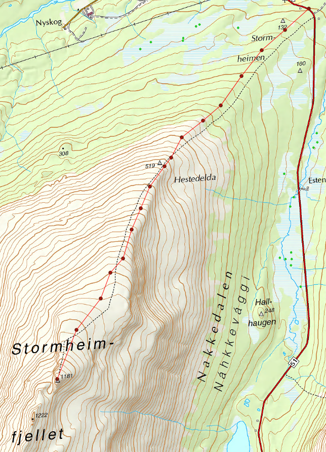 På fredag gikk turen til Stormheimfjellet (Troms, 1181 moh). Den gamle "rekorden" min var Fløya på 671 moh, 2 dager i forveien. Jeg var litt spent på hvor mye/lite gnagsåret/blemma jeg hadde fått på den venstre hælen fra den forrige turen ville plage meg underveis. Det var kommet en fin myk, hvit "boble" under gnagsårplasteret på fredag morgen. Fjellet skimtes såvidt i bakgrunnen. Startet turen klokken 12:45 på ca. 100 moh. Det var meldt 27 grader i området denne dagen. Usikker om den temperaturen ble nådd, men VARMT var det i hvert fall. Det var helt vindstille gjennom hele skogspartiet, og det var MYE mygg og fluer. Myggen stakk rett gjennom ulltrøya på skuldrene og øvre del av ryggen, dagen etter talte jeg omtrent 50 tydelige stikk. Hadde bare Mygga myggmelk tilgjengelig, har lest at den kan skade tekstil, så det fristet ikke veldig å smøre meg med den under ulltrøya. Tips til hva jeg kan prøve neste gang? Heldigvis forsvant mygga etterhvert som skogen ble tynnere, men fluene var langt mer utholdende. Jeg må innrømme at jeg var nær ved å snu på grunn av varmen og insektene, men nå er jeg selvfølgelig veldig glad for at jeg ikke gjorde det. Ved 519 moh kom jeg til den første varden, her kunne jeg lese i gjesteboka at jeg delte fjellet med 4 andre mennesker (bilen deres sto parkert like i nærheten av der det første bildet ble tatt). Vi endte opp med å gå på hver vår side av en ca. 50 meter brei snøflekk (de på vei ned, jeg opp), så ikke noe mer til andre mennesker resten av turen heller. Hadde bare med meg rundt 1 liter vann, så ved første mulighet smeltet jeg snø som jeg brukte til en pose Real Turmat (Lapskaus, hvis noen måtte lure. Den trenger betydelig mer pepper, IMO). Fylte opp flaskene flere ganger i løpet av turen med kaldt, nysmeltet vann. Hadde bare drukket romtemperert vann siden onsdag, så det var utrolig forfriskende! Klokka 16:56 kom jeg omsider opp til toppen på 1181 moh (~1081 moh høyere enn der jeg startet). Brukte (inkludert mange korte og noen lengre pauser) i underkant av 4 timer og ett kvarter. Hadde egentlig som mål å gå til den neste toppen også, på 1222 moh (650 meter unna), men jeg var litt sliten, og så ikke en god/lett rute, så jeg tok ikke sjansen. Har noen av dere gått her før? Hvis jeg ikke tar helt feil så er det Hamperokken (1404 moh) man ser litt til høyre for midten av bildet. Fikk knipset noen bilder med mobilen før jeg gikk ned. Mobilkamera tatt i betraktning, så synes jeg bildene ble bra. Ukomprimert og full oppløsning: http://i.imgur.com/UerYSrH.jpg Ukomprimert og full oppløsning: http://i.imgur.com/kEePySS.jpg Her er ruta jeg gikk på vei opp (ned var omtrent tilsvarende, bare 100 meter lenger). Total lengde på turen (antar i luftlinje) var ~12.6 km (ifølge Geoviewer med kart fra Kartverket) Nedstigningen tok meg 1 time og 41 minutter. Jeg var tilbake ved start etter 6 timer og ett kvarter. Tilbake i byen (Tromsø) på kvelden var det endelig tid for å se hvordan hælen så ut. Den hadde vært omtrent like vond hele tiden på vei opp, men kjente ikke noe særlig til den på vei ned. Før turen hadde jeg forsøkt å stikke hull på gnagsårplasteret, i et forsøk på å drenere ut væska som hadde samlet seg der, men det lykkes jeg ikke med. Tror kanskje jeg bare gjorde ting verre, fordi hele plasteret hadde begynt å gå i oppløsning, og det hadde festet seg til liner-sokken jeg hadde på meg (klisteret hadde gått gjennom til utsiden av sokken). Har ingen bilder, men gnagsåret var nå i hvert fall hovedsaklig rødt, med litt gult innimellom, og null hud som dekket. Forøvrig første gang jeg skriver en slik turrapport, burde kanskje lest noen av dem som ligger her på forumet, så jeg vet mer hva som bør/ikke bør være med. Får heller gjøre det til neste gang :).1 poeng