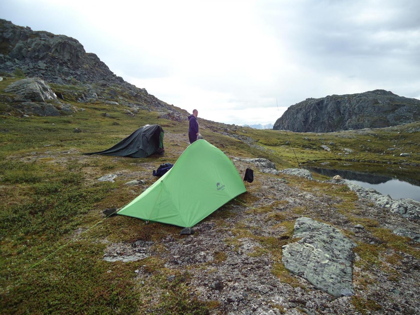 Da har jeg fått prøvd ut mitt første "billig" telt, og lettvekter. Det ble gjort under en tur i nord, på grensa Troms og Finnmark, i tidvis røffe værforhold med styrtregn og vindkast opp i mot storm. På utstyrsfronten har jeg alltid tidligere kjøpt etter kvalitet som også koster litt når vi snakker telt og annet turutstyr. så dette ble et personlig forsøk om det er mulig å handle billig utstyr som holder mål i fjellet under alle forhold. Teltet jeg kjøpte er et Cloud 2 Ultra Light fra Naturehike og kostet 1499,-, veier 1,5kg og har selvstående innertelt laget i mesh materiale som gir utrolig god lufting. Jeg kjøpte dette med tanke på langtur innover viddene her i nord hvor det fort blir avstander å vandre og ønsket lett utstyr. Siden jeg også har hund med meg på tur ville det være en fordel om jeg hadde et telt som han kunne finne skygge, skjul for mygg og kjøling når sola står på da det ikke er skog og lite skygge innover vidda. Første inntrykk: Meget lett å sette opp (3min første forsøk), virker solid og godt materiale som er brukt (ripstopduk, kvalitetsstenger, forsterket hjørner og tapende sømmer). Vannsøyle på teltet er 5000mm både ytter- og bunnduk, men pga forsinkelse i sendingen av teltet fikk jeg med en "picnic mat" som kompensasjon (meget god kundeservice av 123friluft.no), som plasseres under bunnen på teltet (dobbelbunn = 10000mm vannsøyle, og totalvekt på telt 1,65kg. Pga dårlige feste for teltplugger la jeg steiner oppå dem så de ikke kom opp av bakken igjen. Innvendig er det god plass for en person med hund og utstyr, smart lomme over døråpning for oppbevaring av ting og kan også henges sokker til tørk Det henger en krok i taket midt i teltet hvor lykt eller annet kan henge. Personlig ville jeg unngå å ligge to voksne i teltet da jeg foretrekker litt personlig rom, men der er plass til to. Det er god avstand mellom innertelt og ytterduk som gir god ventilasjon. Av erfaring foretrakk jeg å ikke feste avstandsholder mellom ytterduk og innertelt da dette ga meg litt mer lufting og større gulvflate. Fungerer fint uten ytterduk som pauserom for mygg, men det krever at det ikke er mye vind. Ytterduken legges utrolig lett å kjapt på, tar et par ganger før du finner det perfekte oppsettet for maks utnyttelse av teltet (avstand mellom inner og ytter, stramt nok for å unngå noe blaffer i sterk vind). Teltet er bygd slik at det skal tåle vær og vind, noe det også gjør Det er selvsagt en fordel å sette det opp slik at vinden treffer bakenden av teltet slik at det tar minst mulig, men om det kommer sterk vind fra siden går dette helt fint. Under turen fikk vi meget sterk vind som stadig byttet retning hvor min kompanjong fikk flatet teltet sitt i vinden, mens mitt fortsatt sto og gjorde det hele tiden. Det hadde vært en fordel med barduner på bredsiden, noe det ikke er (men har sett noen monterer dette selv på youtube), men fungerer fint uten også. Legger ved en film fra teltet i sterk vind på vidda: Kan absolutt anbefale dette teltet som et godt alternativ til de dyrere teltene, det holder mål og vel så det i mine øyner. Det virker til å holde meget god kvalitet både i duk og stenger, glidelås i innertelt virker litt puslete, men om det med tiden skulle skralle litt er det ikke vanskeligere enn å bytte den ut. + God plass og liten vekt, enkelt å sette opp, smarte løsninger, tåler vær og vind, forsterket på utsatte områder. - Glidelås i innertelt virker litt billig.1 poeng