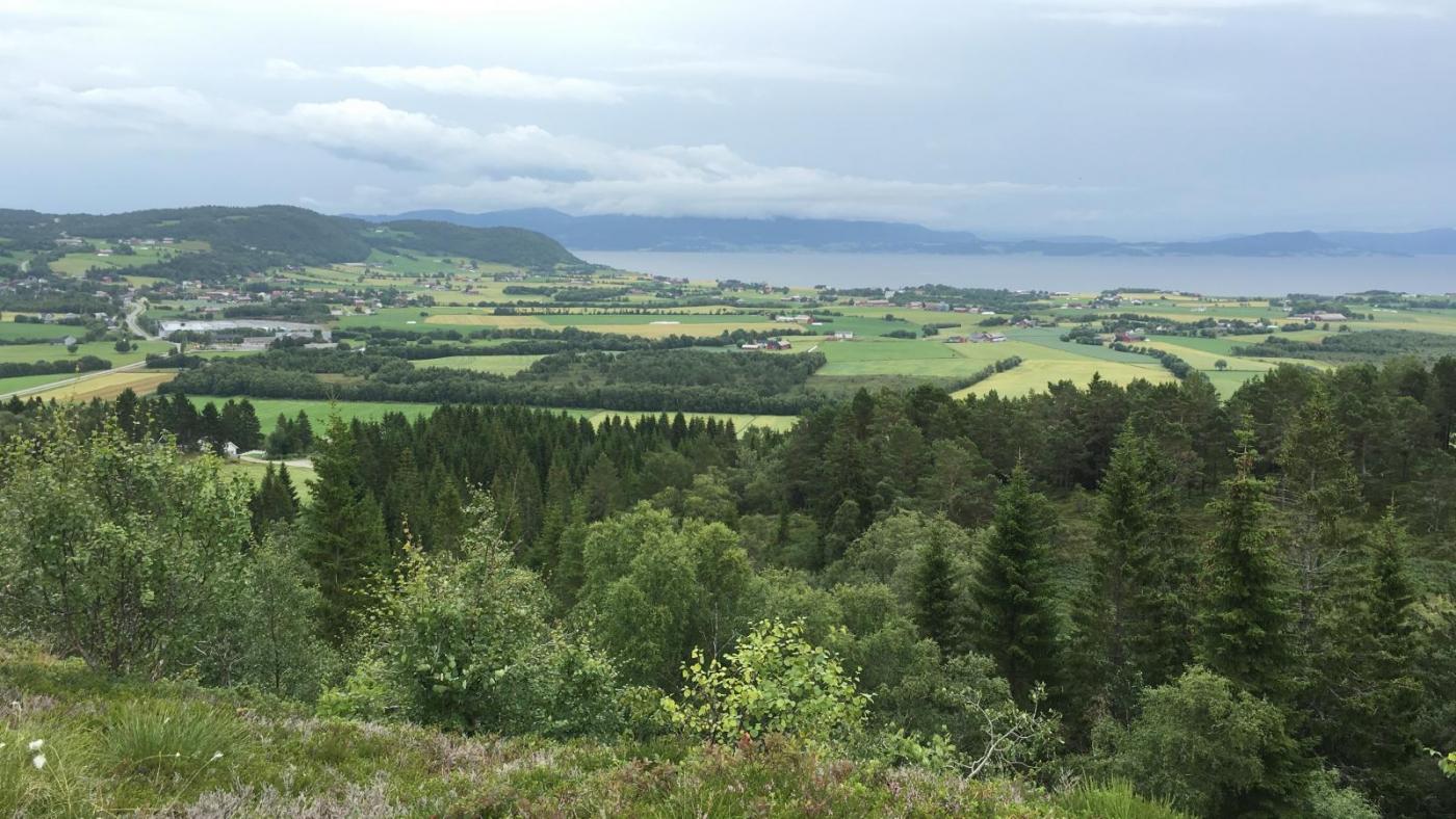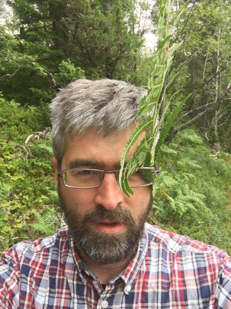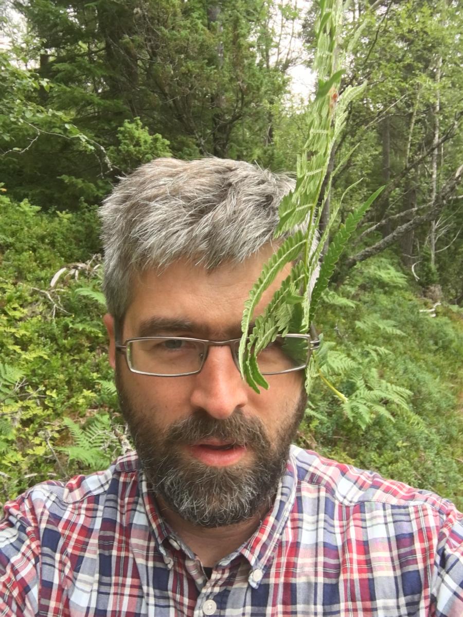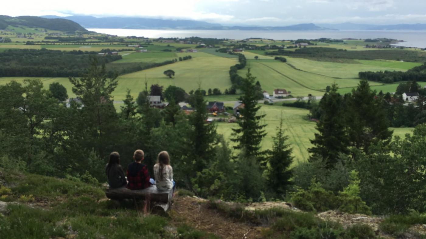 Fosenferie tur 5. Haukberget. På Stadsbygda har lokale ildsjeler laget en ny sti opp til Haukberget. En kort fin tur som duger godt som underholdning for ungene når de ellers sitter inne og kjeder seg. Pappa "underholder" som bregneindianer (nydelig selfie...) Et par "topp"-bilder. Det siste med utsikt over bygda. Total turtid ble tynt til en og en halv time, greit for en sti som tar et kvarter for en voksen mann.6 poeng