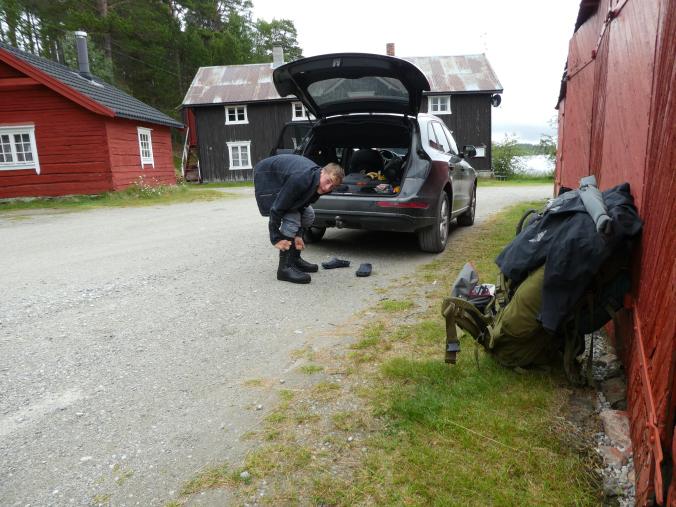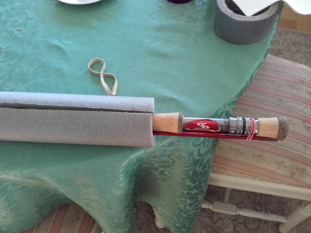 Nå er jeg på startstreken og inntar plassene. Lørdag morgen kl 0700 går startskuddet og bilen stues med bikkje og oppakning. Deretter settes bilen i Drive og jeg er på vei. Men nå som før og også i fremtiden, børa den tynger. Så helt på fallrepet dro jeg til Biltema og kjøpte 3 stk av de største isolasjonsrør til vannrør. Hensikten var å bruke dem som tube i stedet for den sikkert mye bedre tuben som følger stengene. Men den er i tyngste laget. Siden de er splittet på den ene siden er det lett å tre inn en stang, og "forsegle" med et par tre strikk. Lett og rimelig trygt.1 poeng