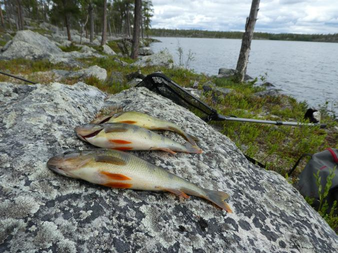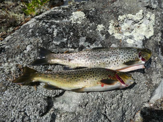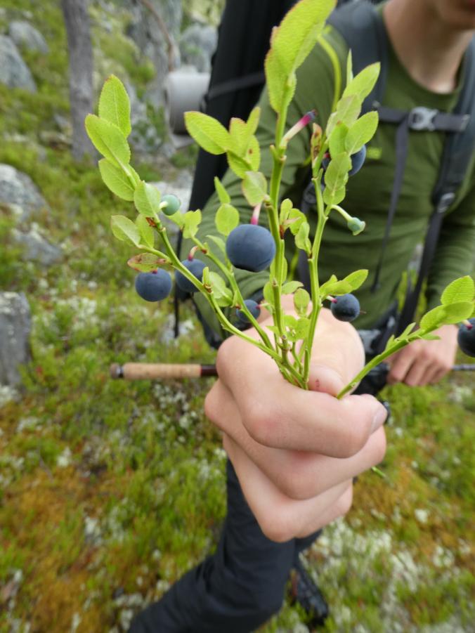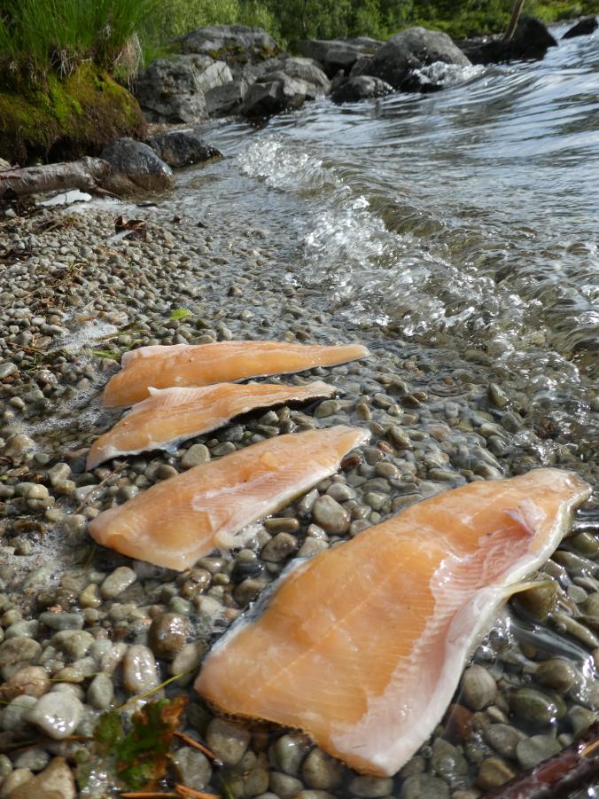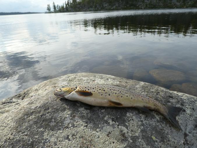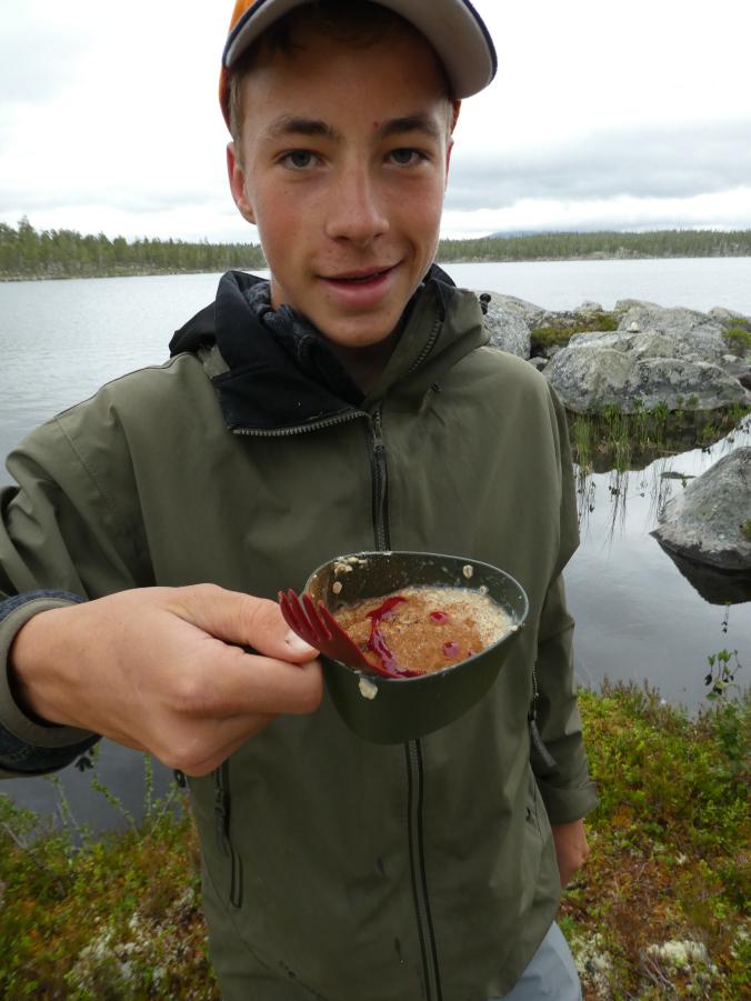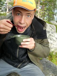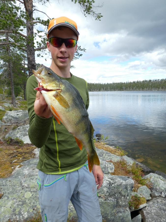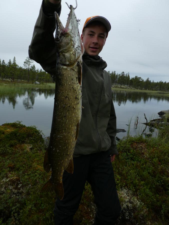 Fantastisk i Femundsmarka Etter mye planlegging og pakking var alt klart, åttte-ni timer bilkjøring ventet. Jeg gledet meg VELDIG til å komme inn i Femundsmarka nasjonalpark for første gang. Det var så mange spørsmål jeg ville få svar på, hvordan er det å finne teltplass?, hvordan blir fiske?, hvordan er terrenget å gå i?, jeg vet at det finnes områder med mye blokkstein, men hvor? Kommer jeg til å treffe mye folk? Hvordan blir været? Alle disse spørsmålene (pluss mange flere) vil jeg få svar på i løpet av turen. Informasjonskilt om narsjonalparken Det var ettermiddag og vi (jeg skriver «vi» fordi pappa var med, det hadde jo vært litt rart om jeg hadde kjørt alene, jeg er tross alt bare fjorten år) kommet så langt som til Alvdal. Her sov vi en natt hos noen venner. Vi kler oss omog venter på ferga Fergen (Femund 2) går klokka 09.30 fra Synnervika til Røa, dermed ble det en tidlig avgang fra Alvdal (det er nemlig et lite stykke å kjøre). Klokka 06.00 våknet jeg, og klokken 06.30 var vi på vei til Synnervika. Her ble det spist noen skiver som en rask frokost før fergen kom. Vi traff også en hyggelig kar her på kaia (hei til deg!). På fergen spiste jeg en nydelig vaffel som jeg sikkert kommer til å sette enda mer pris på hjemturen. Femund II Turen opp til Røvollen turisthytte gikk ganske fort og greit, men det skal sies at sekken ikke var lett! På vei mot Røvollen Tung sekk! Krysser Røa Røvollen Videre gikk fulgte vi turistforeningens sti opp til Røvolltjønnane. Røvolltjønnan-stille og varmt! På veien kom jeg så nærme et reinsdyr at jeg nesten kunne ta på det! Reinsdyr Vel oppe ved Skogtjønna satt vi opp leir, etter en lang etappe var magene skrubbsultne, pølser og ris sto på menyen i dag, det smakte herlig! Mat til to personer! På kvelden var det tidvis litt bris, men ingen vak. Vi forsøkte det meste uten hell. Neste morgen var det skyfri himmel og ikke et vindpust, jeg så røya vake og spise fluer i vannflata. Det var nytteløst med sluk og spinner i slike forhold, tørrflue ville muligens vært nøkkelen (har noen tips til hvordan man kan fange røya, så skriv gjerne en kommentar!). Prøver stanga på kvelden ved Skogtjønna Da leiren var pakket ned tok vi turen mot øvre Roasten. Utsikt over Roasten Her traff vi en hyggelig kar på en av hyttene som kan leies. Vi slo oss ned en liten stund her og spiste lunsj. Han tilbød å ro oss over på nordsiden av Røa, vi takket gladelig JA. Vi sparte mange timer med gåing eller en skummel vading over Røa, da vi bare hadde 5 dager til rådighet. Fyren vi traff tipset oss om Roastbua (en åpen koie), den var ledig og vi bestemte oss for å ligge her for natten da de meldte regn den natta. Roastbua Før kvelden gikk vi en tur opp til Gislehåen for å prøve noen kast. Her dro pappa opp en Gjedde på 1,6 kg. Denne beit på møresild. Vi hadde aldri forsøkt å spise Gjedde før, så vi tok fileter og tok sjansen. Første Gjedde på turen Da vi kom ned til Roastbua igjen tok vi noen kast ved innoset til Roasten. Plutselig ropte pappa «Isak, hent håven, jeg har fisk på!». Jeg løp bort og stakk håven ned i vannet og fikk opp en fin og feit ørret, den var ikke av de aller største. Denne beit også på møresilda av en eller annen rar grunn. Første ørret på turen Stekt ørret og ris Dagen etter tok vi turen lenger opp i vassdraget, vi fulgte bekkene fra Gislehåen oppover til noen vanner. Det første av disse vannene var et typisk Gjedde-vann. Jeg forsøkte med møresilda pappa hadde fått fisk på tidligere på det første kastet. Vannet var klart og blikk stille, etter noen sveiv kunne jeg se sluken nærme seg land. Plutselig så jeg et beist av en fisk komme etter møresilden, det var en Gjedde, den nappet og jeg gjorde et kraftig mothugg, kampen var i gang! Jeg hadde bremsen på snellen passelig på, men denne fisken merket den ikke en gang! Bremsen ble strammet så kraftig at jeg selv ikke klarte å dra den ut. Etter noen minutter trodde jeg Gjedda var utkjørt, pappa prøvde å håve den, men så sprellet den vilt og hoppet ut av hoven. Etter å ha fått den inn til land igjen fikk vi håvet den opp på land. Vekten stoppet på to kilo! Min Gjedderekord Gjedda sammenlignet med vekta i størrelse Skarpe tenner Etter Gjedde opplevelsen gikk vi videre langs Storbuddhåen, her var det mye blokkstein og vanskelig å gå, det ble ingen fangst her. Her var det ikke langt unna at jeg sovnet! Da vi hadde kommet ned til Roastbua igjen tok vi noen kast på nordsiden av øvre-Roasten. Her dro jeg opp to feite og blanke ørreter som ble veid til 300 og 500g. To ørreter til, største på halvkiloen Av disse to ble filetert og kappet opp i små terninger og puttet oppi Lofoten fiskesuppe. Dette måltidet smakte herlig. Fin farge, men ikke røde Klokken 10.00 neste dag var vi klare til avgang. Vi gikk langs hele nordsiden av øvre-Roasten og fulgte en bekk opp til Litlsjøen. Her fant vi en fin leirplass på vestsiden av vannet. Leiren ved Litlsjøen Utsikt fra teltet Pappa tok første kastet med en lillauren spinner. Plutselig rykket det kraftig i stangen hans, og jeg sveivet inn så fort jeg klarte og løp bort med håven. Det var en fin abbor som ble veid til ca.500g, ikke dårlig! En av abborene herfra Etter noen timer med fisking stoppet vi, resultatet var fem abbor på rundt halvkiloen og to litt mindre, dette var mer en nok til en god fiskemiddag! Det smakte himmelsk med stekt abbor og ris. Kvelden ved Litlsjøen var fantastisk, jeg nøt hvert eneste sekund! Da var allerede siste morgen kommet. Jeg startet dagen med to store porsjoner med havregrøt, dette skulle bli en lang og tung dag. Havregraut-herlig! Etter at leiren var blitt pakket sammen bestemte jeg meg for å ta et kast med stangen som en avskjed. Jaggu beit det også på det ene kastet, en abbor på 500g, den fikk svømme ut igjen. Ned til Roasten tok vi en annen vei en opp, vi krysset ned på skrå istedenfor å følge bek