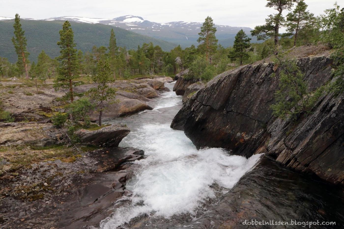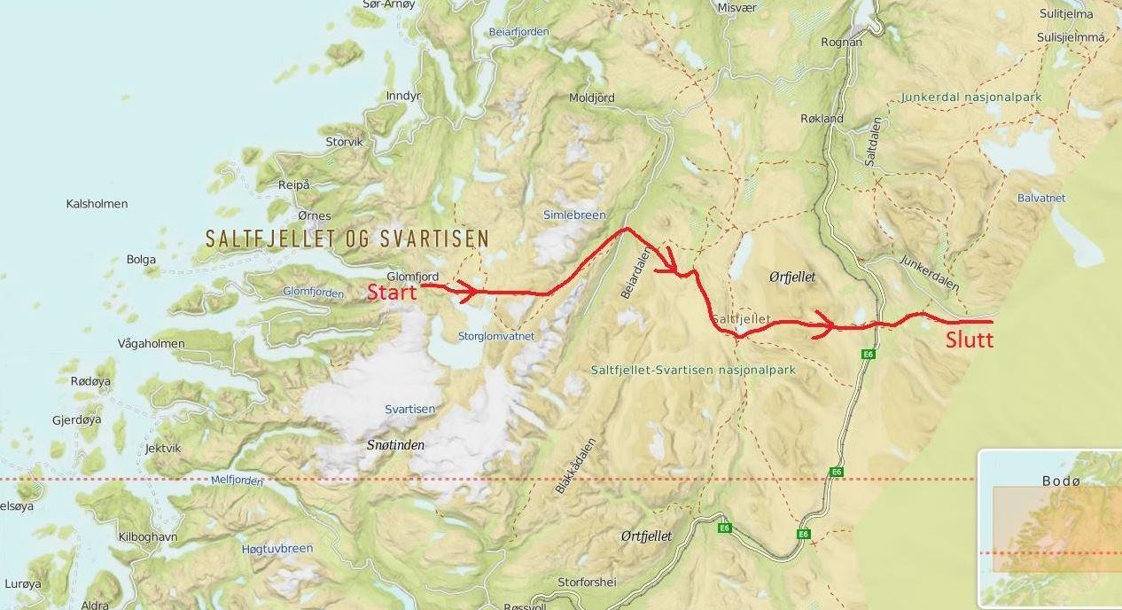 Som en motpol til den populære Norge på tvers ruten som Dnt arrangerer i Sylan i Trøndelag, arrangerer Beyondlimits en tilsvarende kryssing av Norge på tvers i Nordland. Ruten starter ved kysten og Svartisen i Meløy kommune i vest og går helt til Svenskegrensen ved Graddis i Saltdal kommune øst. Turen går gjennom noe av det fineste naturområder Nordland har å by på, både Lahko Nasjonalpark og Saltfjellet-Svartisen Nasjonalpark krysser en over, i tillegg til Dypen Naturreservat i Lønsdalen. En får virkelig smake på kontrastene i naturen på denne turen, de er helt enorme. Turen starter ved det irrgrønne havet på kysten med de spisse alpine tindene med god utsikt til den blåe iskappen på Svartisen. Kartlandskapet i Lahko Nasjonalpark passeres på vei til de dype dalene i Beiaren som is og vann har gravd ut gjennom årtusner. Den gamle furuskogen i Tverådalen passeres på vei til Bjørkeskogen og den nydelige elven i Tållådalen. Overgangen er stor fra vidde landskapet på Saltfjellet til det øde månelandskapet i Steindalen. Fra Lønsdal går en inn i Urskogen i Dypen verneområde og ender til slutt opp i det lettgådde fjellområdet i Junkerdalen og Graddis like ved Svenskegrensen. Her får en virkelig med seg alt. Turen er ganske nøyaktig 100 kilometer lang og vi brukte 5 dager på kryssingen. Kortbeint som jeg er fortalte skrittelleren på klokken min at jeg brukte ca 215 000 skritt for å gå hele Norge på tvers. Det er jo ikke ille på en knapp uke i juli. Første stoppested er ved DNT Gamma i Kvitsteindalen. Her får vi perfekt utsikt inn i Skaveldalen som vi må krysse gjennom for å komme til Gråtådalen og Beiaren. Skavldalselva faller ned i et aldeles nydelig fossefall i begynnelsen på Skavldalen Etterhvert som vi beveger oss oppover dalen forsvinner de siste restene av karstlandskapet i Lahko og blir erstattet med de harde bergartene som preger fjellene i Skavldalen. På vei opp siste kneiken i Skavldalen kommer tåken og legger seg og Gps'en blir vår veiviser gjennom dalen. Skavldalen bærer sitt navn med rette, det er fortsatt en god del snø igjen i dalen. Greit å ha i mente at snøbroene kan være tynne noe som kan være en risikabel affære dersom en trår igjennom. En flokk med reinsdyr er fryktelig nysgjerrige på oss og hundene, de står bare å kikker ned på oss når vi passerer i tåkehavet. Skaveldalen er passert og erstattet med den litt mere grønne Gråtådalen. Vi kommer under skylaget og får etterhvert utsikten i dalen. Vår første overnatting blir på Gråtådalstua. Her møter vi en gjeng på 12 personer fra stiftelsen "Veien ut", som er et rehabiliteringsprogram for rusmisbrukere. De bruker naturen som et hjelpemiddel for å bli kvitt rusproblemene sine. De skal være på tur i 3 mnd. Inspirerende møte med den fantastiske gjengen Inn i tåken igjen etter en god natts søvn i Gråtådalsstua. Vi må bevege oss opp i høyden igjen og inn i skylaget på vår ferd til Beirstua. Øksehugget i Kyskåfjellet rett over tregrensen ved Beiarn. Det ser ut som om kjempene har brukt øksa si og laget et stort sår i fjellet. Etter en god natts søvn i Beiarstua setter vi kursen mot Saltfjellstua.Vi følger elva Tverråga oppover dalen. Fint med gammelt kulturlandskap i Tverrdalen. Oppe ved vannskillet mellom Tverrdalen og Tollådalen. Perfekt utsikt over distansen vi har tilbakelagt fra Beiaren. Snart halveis mot Saltfjellstua og heldigvis ferdig med stigningen Landskapet endrer fullstendig karakter i det vi kommer ned i Tollådalen, Furuskogen blir erstattet med hvite og rette Bjørketrær som strekker seg til værs. Den Statskog eide Bukhaugbua ligger ved elva like borte i skogen og er et fint sted å overnatte om en føler for det. Den fantastisk flotte Bukkhågforsen er et kjærkommet syn i Tollådalen. Her raster vi og koker bålkaffe mens vi nyter synet og lyden fra fossen. En kan sikkert ha det finere men en trenger ikke, dette er balsam for sjelen Slettelandskapet like ved Stallogropa er helt flatt og vi spiser distanse ganske effektivt. Før vi vet ordet av det har vi tilbakelagt den 27 kilometer lange distansen fra Beiarstua til Saltfjellstua Ny dag og atter en etappe som skal forseres. Vi må krysse over elva for komme videre til Lønsstua og Lønsdalen. Heldigvis er det en bro over elva så kan krysse over på en enkel måte På vei opp til Steindalen får vi utsikt mot et av de store fiskevannene på Saltfjellet, nemlig søndre Bjøllåvatn. Det er etter sigende et av Norges beste røyevann. Vi rakk dessverre ikke å prøve fiskelykken denne gangen. Det er kanskje like greit, fiskelykke handler i liten grad om hell, det avgjørende er hvor lenge siden Lars Monsen har vært der og fisket. Endelig ferdig med Steindalen, bare en liten etappe igjen til Lønsdal og Lønsstua. Solen skinner fra skyfri himmel i det siste etappe skal gjennomføres og sette en avslutning på eventyret vårt gjennom Norge på Langs. Vi passerer E6 og sikter oss inn på riksgrensen til Sverige ved Graddis i Junkerdalen. Stien til grensen går over broen og inn i Urskogen i Dypen naturreservat. Viskis vatnet ligger blått og forlokkende på den fine sommerdagen Nydelig utsikt mot distansen vi har tilbakelagt, Ørfjellet og Lønstinden vises langt i det fjerne. Den utrolig flotte Solvågtinden i Junkerdalen strekker seg opp i mot det mørke skylaget som siger sakte i mot oss. Riksvei 77 går den strake veien til riksgrensen og skifter navn til Silvervegen og vei 95 i det den passerer grensen. Graddis og Riksgrensen er i sikte og vi er bare et steinkast unna i å nå målet for turen vår. Det kjennes igrunn ganske så bra, godfølelsen kommer sigende. Det går etterhvert opp for meg at jeg er utrolig heldig som får muligheten til å oppleve gjennomføre en sånn tur og oppleve et sånt fantastisk mangefold i naturen. Nå venter belønning for strevet, velfortjent dusj og middag på Polarsirkelen Hotell i Lønsdal Takk til Laila, Trine, Jarle, Joachim og Bey