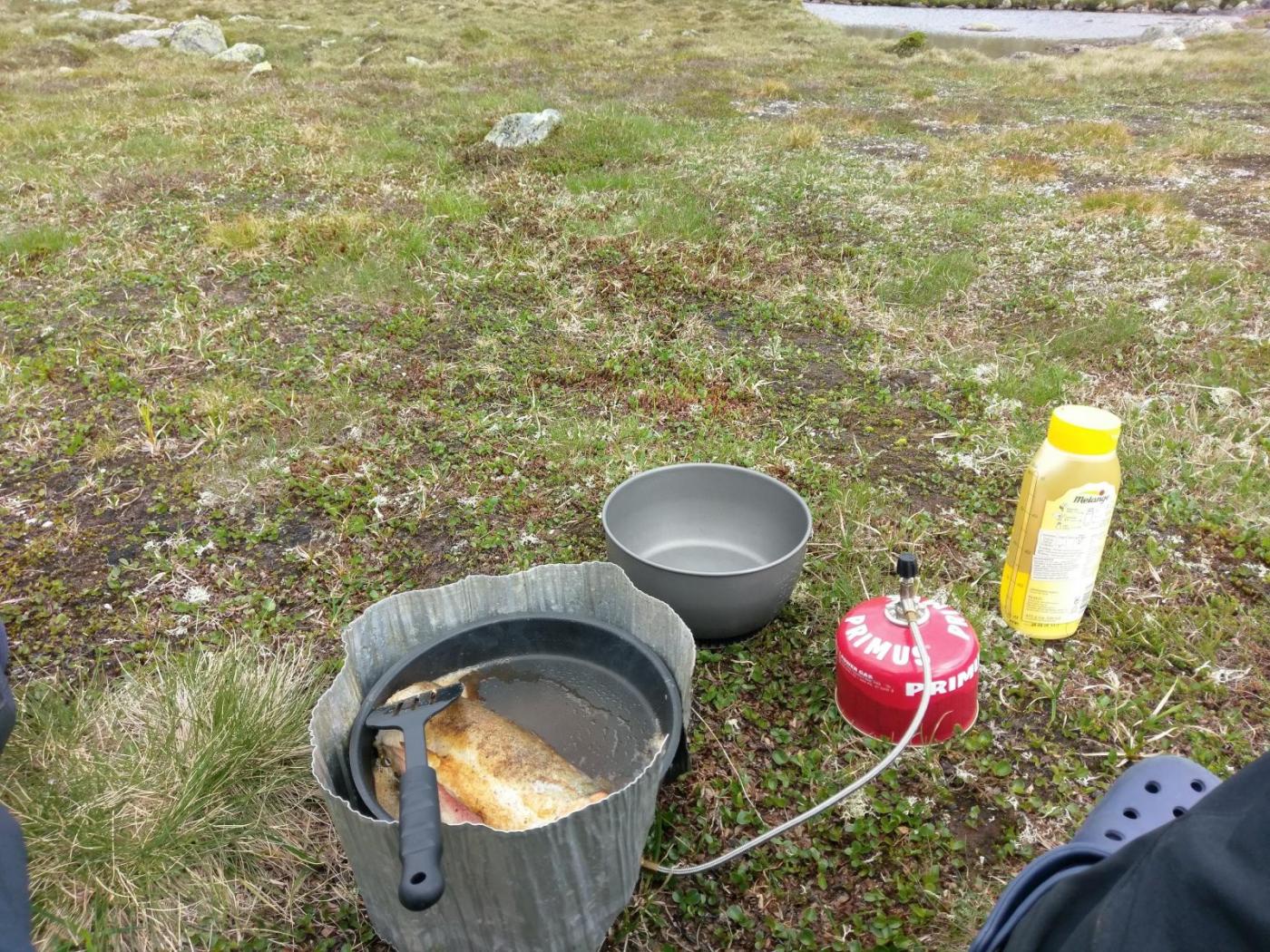 Kjørte inn til Solheimstulen. En god del av veien er asfaltert og parkering er gratis. Ingen bompenger heller. Slo opp teltet litt ovenfor Beltetjønn på ankomstdagen, ingen fisking her. Neste dag gikk jeg videre til Nedre Grottjønn og Grisletjørnanene og ble der noen dager. Å gå inn dit med ganske tung sekk var helt jævlig. Tung myr og uoversiktlig terreng, der man fort havner borti tett kratt og ur. Ofte begge deler samtidig.... Men, jammen smalt det ikke på en ørret på halvkiloen som jeg freste i setersmør! Så alle (det vil si meg) var enige om at det hadde vært en... Vel, det var i hvert fall en veldig kort tur......1 poeng