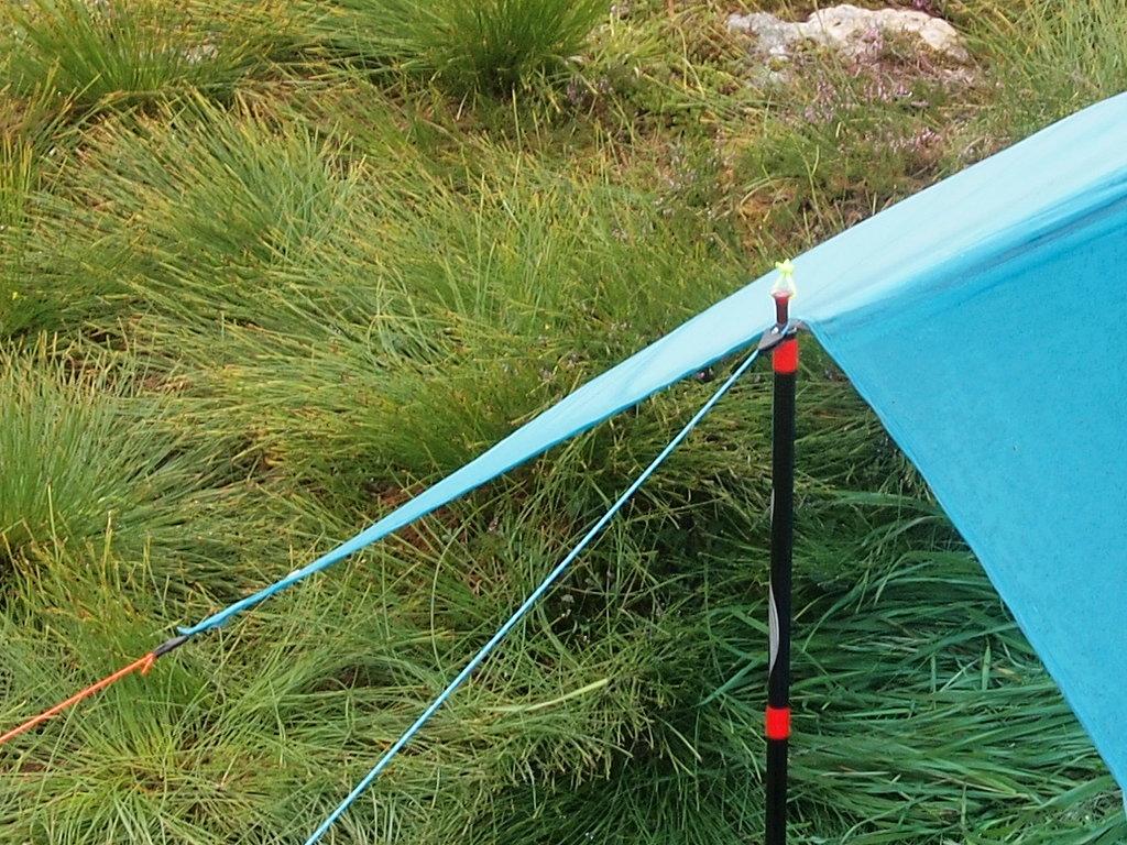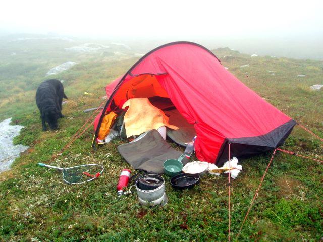 Førsteposten ble opprinnelig lagt inn i den alldeles fortreffelige "Hvor har du vært på tur i dag?"-tråden, og jeg tonet derfor ned litt av det tekniske for at posten i hvert fall sånn halvveis kunne passe inn den tråden. Men nå - med en egen tråd - hiver jeg inn litt ekstra "teknisk" informasjon som kanskje kan være til hjelp for andre? Først om TarpPonchoen: Den er en Sea to Summit Ultra-Sil Nano TarpPoncho, laget av 15D nylon med silikon på utsiden og polyuretan på innsiden. (Det betyr at det er lettere å reparere evt rifter ved å tape på innsiden, tape fester dårlig på silikon.) Hetten er usymetrisk plassert slik at lengden bak også skal kunne dekke ryggsekken, en "snurpesnor" kan brukes for å trekke nedre bakdel opp dersom man går uten sekk. Doble sømmer som er teipet ved hetten og snurpesnoren. Bredden oppgis til 145cm, det stemmer med min. Lengden på min er 253cm, 12cm kortere enn StS skal ha det til. Og vekten på min er nesten 50g lettere enn de 230g StS oppgir. Det er 8 hemper for liner eller staver sydd fast med forsterking langs kanten. ikke noe for sydpolfarare men de ser ut til å holde helt fint. Det som jeg frykter vil ryke først er en av de små trykknappene i plastikk som holder sidene sammen i poncho-modus, jeg har ikke tillit til dem og er temmelig forsiktig (spesielt når jeg skal kneppe dem opp). Bakstaven har høyde ca 120cm, mens framstaven har høyde ca 70cm. De fleste teleskop vandrestaver kan med andre ord brukes i et slikt oppsett. Og en 70cm trepinne er jo ofte enkelt å finne/lage, om man bruker én vandrestav. Min er kappet fra en karbongåstav fra Biltema, veier 58g og passer faktisk inne i bakstaven (TrekPod) når jeg går med den. (Og den passer som en av stavene i GoLite Shangri-La 1-teltet mitt i tillegg, tingene henger bra sammen her .) En rund teltplugg med et stort nok hode (eller kanske en alubolt?) settes ned i toppen på røret, hempen fra tarpen hektes på og bardunlinen hives over der igjen (100% utsnitt fra bildet over): Framre bardunline bør være rundt 250cm, mens den bakre bør være ca 350cm. De fire bardunlinene på sidene er 100-125cm, og jeg eksperimenterer med å la de henge på fast i hempene sine, får se hvordan det går. Kan hende jeg dropper det, kan hende jeg setter på noe strikkgreier - pt ser det slik ut i ponchomodus: Denne dyneema-linen (fra eBay) har diameter på kun 1,2mm og veier 0,9g pr meter, så 4-5 meter av denne går fint ned i pakkposen og vekten merkes ikke. Ulempen med den er at den er litt glatt. (Digresjon: Når sant skal sies begynner jeg å lure på om jeg har hivd penger ut av vinduet med dyneema-line-kjøpene mine, hvem trenger egentlig bardunliner som holder hundrevis av kg? Hvis man faktisk henger 100kg på en line som er knyttet fast i et telt eller en tarp, så er jo det duken der som ryker - og hva har man da oppnådd, egentlig? Jeg undres...) Rundt hetten og bakover har jeg foreløpig brukt en Biltema-line på rundt 4mm - jeg er litt skeptisk til å bruke liten diameter på "bøddel-løkken", ser for meg at det lett kan bli skader i hettehalsen om det ikke er litt areal å fordele kreftene på. Så jeg kommer til å fortsette med en "tung og stor" line ved hetten (30-40cm?), men skjøte på den lette 1.2mm-linen bakover istedet. Et tips vedrørende hetten forresten: Dersom du har satt bakenden mot vinden (anbefales), vri hetten god og vel 180° før du strammer løkken over "halsspiralen" som danner seg - da vil ikke hetten ligge med åpningen rett mot vinden og fange regn. Hvis du ikke spikker pinner eller finner stein og kvister å feste barduner i, trenger du i verste fall hele 9 plugger til oppsettet - 8 plugger i bakken og 1 i topp av framstaven. For meg på 190cm betyr høyden at mønet ligger 10cm over kneskålen min... Det er lavt. Og med et liggeunderlag på 6,4 cmforsvinner enda mer høyde. Det er selvsagt klin umulig for meg å sitte under tarpen, ikke en gang med krum rygg og duknakke. Det går greit å skifte skjorte liggende (tested and true), men bytte av klær/sko på nedre del av kroppen medfører risiko for akrobatiske øvelser som ender med senestrekk i pinlige posisjoner. Har ofte med en stor søppelsekk (bla pga videoen om førstehjelpsutyr som det lenkes til i denne posten), og den fungerte fint som ekstra bunnduk når jeg skulle få på meg støvler i vått gress utenfor tarpen på morgenen uten å bli søkk våt i buksebak eller føtter. Og støvlene ble på natten sikret mot villfarne regndråper vha andre plastposer, Biltemas hundeposer (som iflg @LightDankan brukes til mangt og mye) tredd over toppen: Ikke plass til noe ryggsekk inni der, som man kan se - ergo må den ha sitt eget regntrekk (eller søppelsekk!) og ligge på utsiden. Men selv om det er trangt og lavt under taket, så er det selvsagt ikke så galt at man ikke kan lage en kopp kaffe mens man gløtter på bygen utenfor - det ville virkelig vært krise, det : Husk masse poser, sovemaske, ørepropper og kaffe, så vil det gjerne gå fint1 poeng