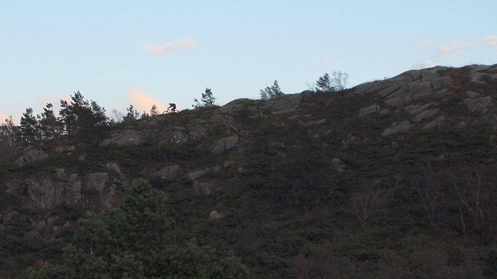 Idag var det "trening" med vask, rens, polering og voksing av bilen uten en eneste elektrisk duppedings - brukte nesten 4 timer på den gamle Subaruen, og nå er den impregnert for en Bergensvinter Blir mør i skuldrene av sånt arbeid. Flott og varmt vær, men mye vind i dag - fant ut at jeg uansett måtte ta en tur i vante trakter før solnedgang; Damsgårdsfjellet og Holefjellet ventet. På tur opp til toppen av Damsgårdfjellet passerte jeg blant annet en dame som dro med seg en terrengsykkel oppover. Da jeg var gått over til Holefjellet, hadde hun kommet seg til topps, spent på sikkerhetsutstyr (håper jeg), og satte i gang med å kjøre ned samme vei hun hadde gått opp (måtte croppe bildet mye, dessverre): Ganske tøft Det å se sykler på Damsgårdfjellet var for et tiår siden helt utenkelig - men nå treffer jeg på syklister kanskje et par-tre ganger i året der. Selv vil jeg nok fortsette å bruke apostlenes hester, tror jeg1 poeng