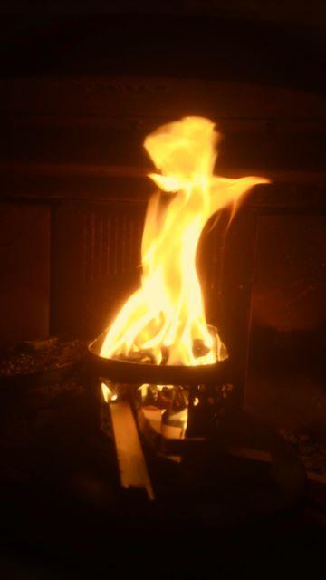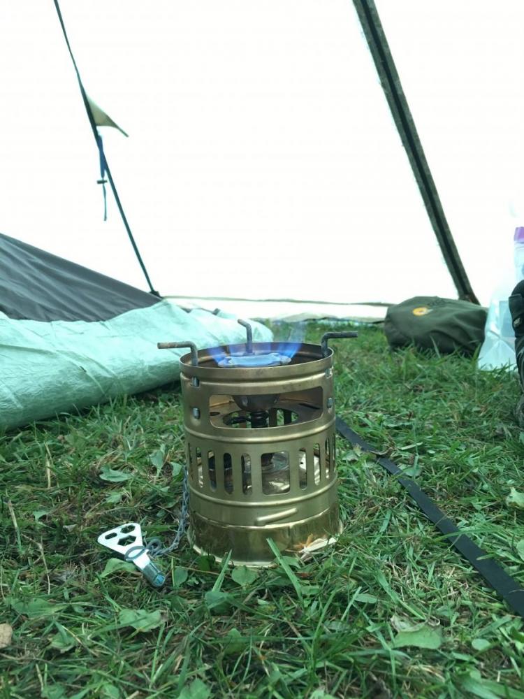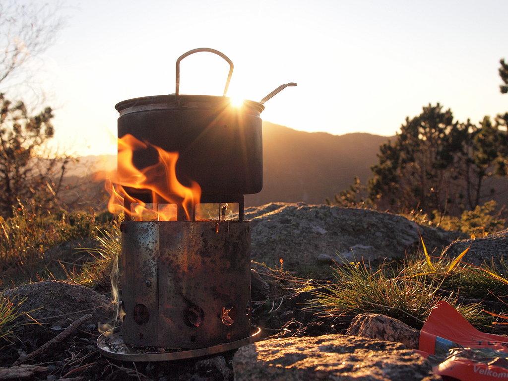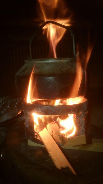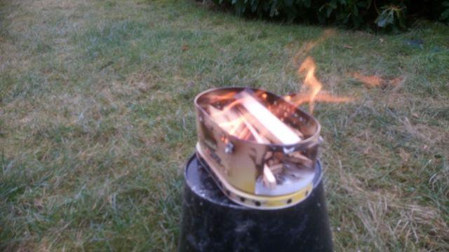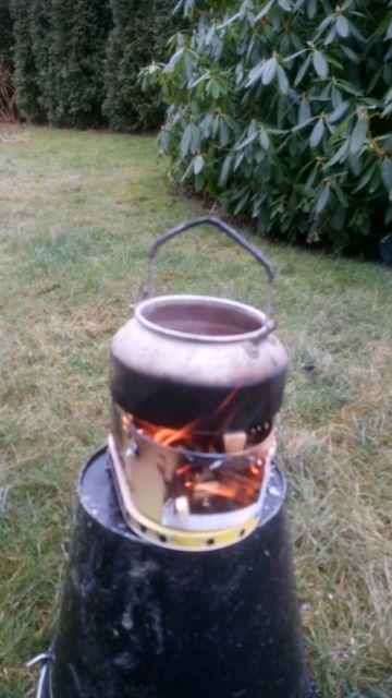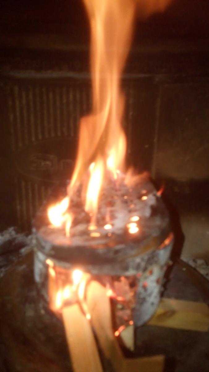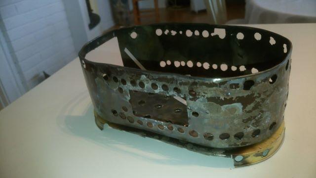 Stortingsreprentant Lars Sponheim i Stortinget: "For øvrig mener jeg at alle burde ha sin egen høne". Tom42; "For øvrig jeg at alle burde ha sin egen vedovn". -------Fordi jeg ikke kunne vente, brant jeg meg selvfølgelig på fingrene, fordi jeg tok ovnen ut av peisen altfor tidlig. Men jeg kunne ikke vente fordi jeg allerede da så visse svakheter ved min første løsning. Å bruke lokket som grillrist – et dårlig forslag. vanskelig å få lokket på plass etterpå var det også I stedet tok jeg av lokket og brukte det som underlag for ovnen. Klippet også vekk en del av sidene. Da fikk jeg ovnen hevet ca 1 cm, noe som vil gi bedre trekk , og lokket ble letter å få satt på i transportmodus Boring av trekkhullene. Fordi blikket er tynt, fylte jeg ovnen med vått avispapir før boring. Det gikk egentlig ganske bra, men nå har jeg satt inn en forskalling i stedet, - 2 lister, 55 mm brede og 120 mm lange plasseres langs den rette kanten på innsiden. - for å holde disse på plass settes 3 stk 55 mm brede og lange mellom. Legg også merke til risset som er limt i bunnen (og på innsiden av lokket) Boksen er som en skøytebane. To svinger og to langsider. For lettere å bore trekkhull i den ene svingen sett en list med målene 55 x ca 200 mm fra sving til sving. Og med det samme du er i farten bor ut et hull i den svingen hvor vedilegget skal være. Dette for å lette utklippingen av vedilegget. Siderutenettet har målene 55 x 180 mm. Finn midten på en av svingene, og lim rutenettet fast . Merket X skal være på midten. Da skal «de 120 mm» være på langsiden. Bordiameter er 8 mm. Jeg prøvde først med 6 mm bor, men måtte øke til 8. Rutenettet for lokk og bunn limes fast på innsiden. da blir det lettere på bore. Vedilegget skal klippes ut i ledig sving. Lim fast rutenettet, stikk saksespissen inn i det utborede hullet og klipp i vei. Tilslutt banker du ut alle gradene etter boringen. Ved å bruke 8 mm trekkhull brenner ovnen godt Og om litt er kaffen klar Og til slutt. For meg ser blikket i boksen ut lik blikket i kakeboksene til mor. Godt hun ikke ser blikket mitt4 poeng