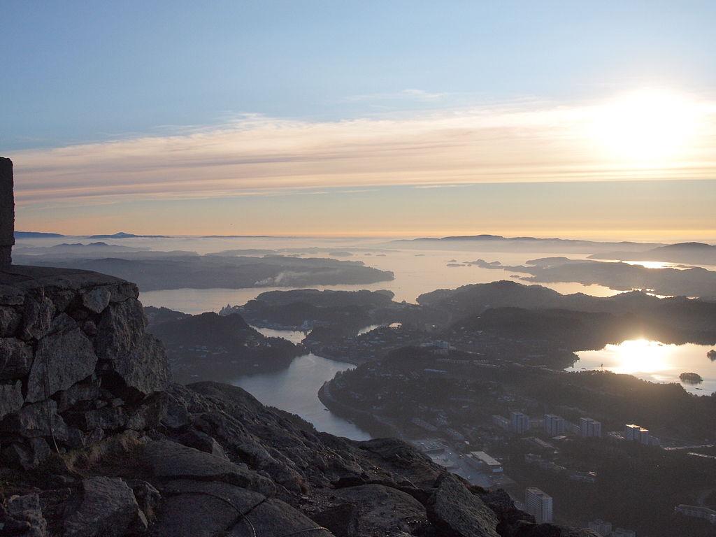 Buss til jobb i dag, men hjemover hoppet jeg av ved Loddefjord terminal, og gikk hjemover opp Lyderhorn, Skjenafjellet, under toppen på Ørnafjellet og ned fra Kvarven Tok det med ro, men ble likevel såpass andpusten opp sørsiden av Lyderhorn at jeg mått ha en bitteliten pustepause der - en indikasjon på at formen ikke er helt på topp... Fin utsikt sørover på toppen av Lyderhorn, med Haakonsvern og Flesland mitt i bildet. Litt småskummelt med tynn isglasur hist og pist på turen nedover derfra. Tok en lengre stopp etter at jeg hadde passert Ørnafjelltoppen, ved varden som Sjøkadettforeningen Valkyrien har satt opp - der ble det fyrt opp spribrenner. En halv desiliter rødsprit var nok til en kopp kaffe og fire varme pølser under den lave sola . Skimtet så vidt høyspenttrasèen og brua over til Sotra gjennom disen. Var ved Kvarven akkurat ved solnedgang, og hjemme ikke lenge etter at gatelysene ble tent - en flott tur hjem fra jobben2 poeng